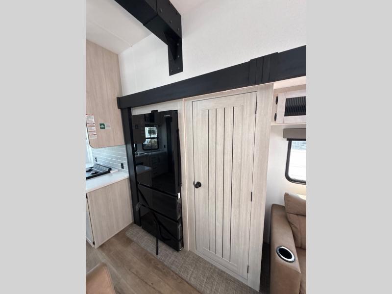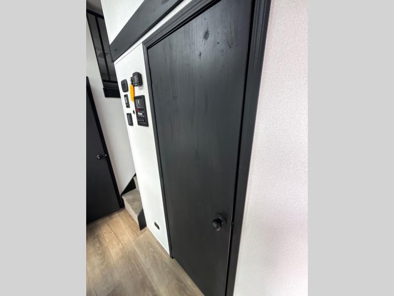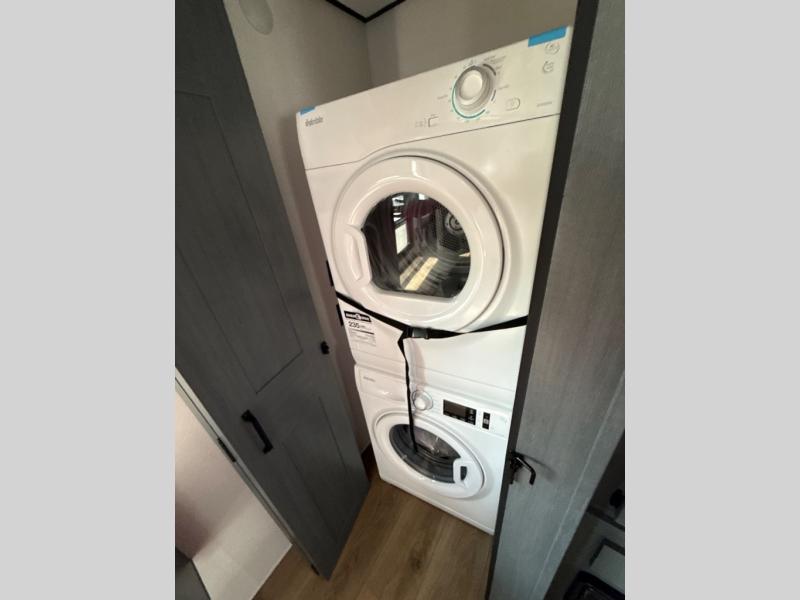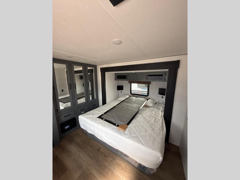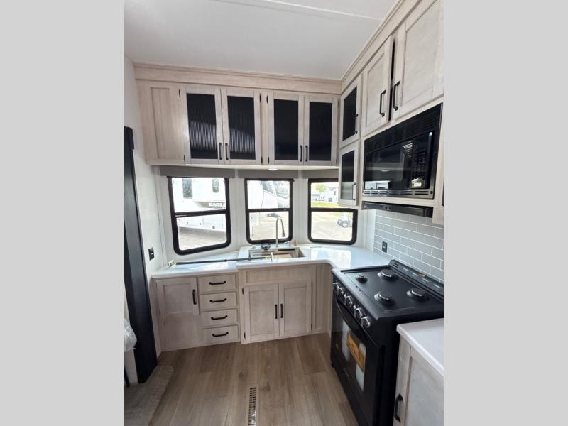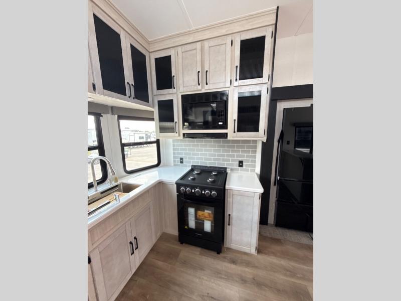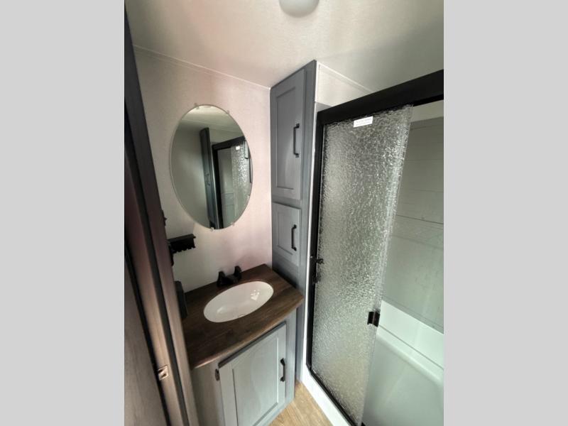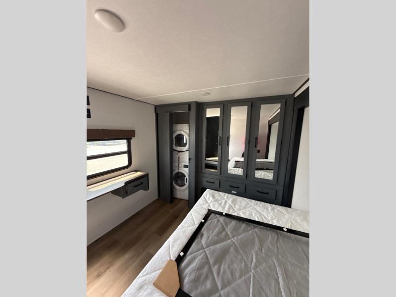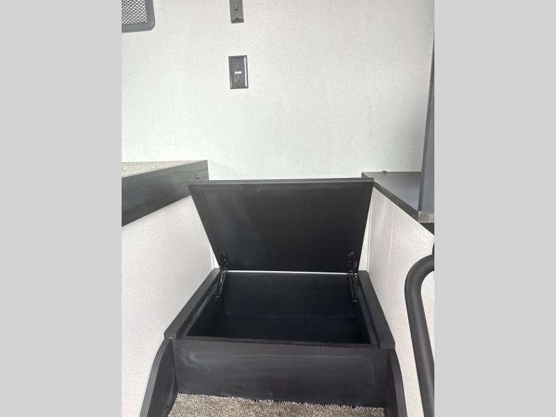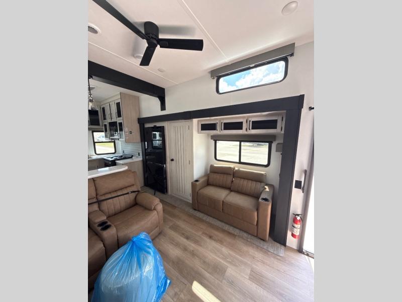 This is the perfect destination trailer for a larger group since it can sleep up to nine campers each night. The little ones will love the double loft areas with three bunk mats and storage space for their things, while you take the rear private bedroom. There is a king bed slide out here, along with a wardrobe/closet for your clothes, plus a second closet with the option to add washer and dryer prep. Everyone can meet in the middle living room to relax on the dual sofas or recliners across from the fireplace and entertainment center. Head to the front of the unit where you'll find the kitchen that includes ample counter space to prep meals, a residential style refrigerator and pantry for food storage, and a free-standing table to dine at. There is also a breakfast nook that overlooks the living area so you can visit with the cook and watch a movie at the same time!