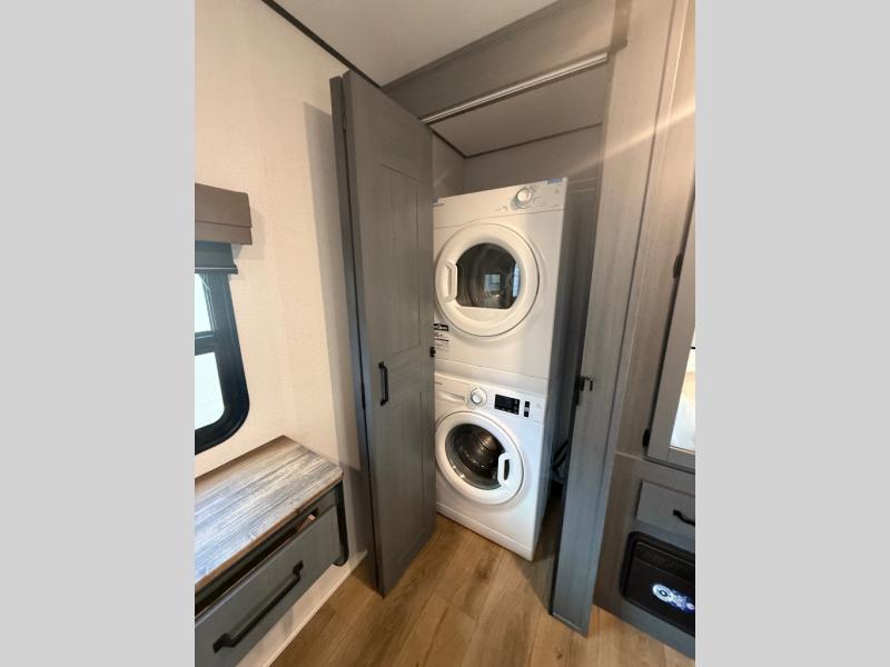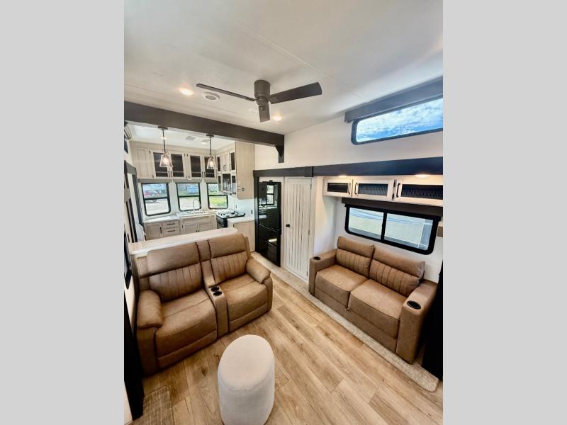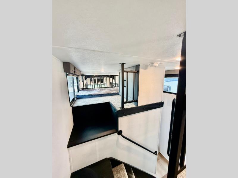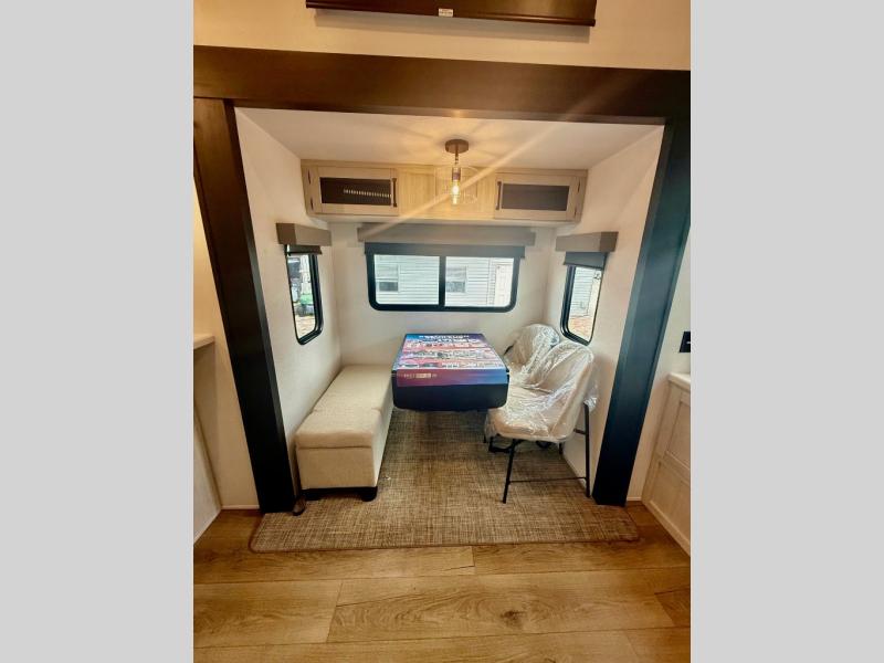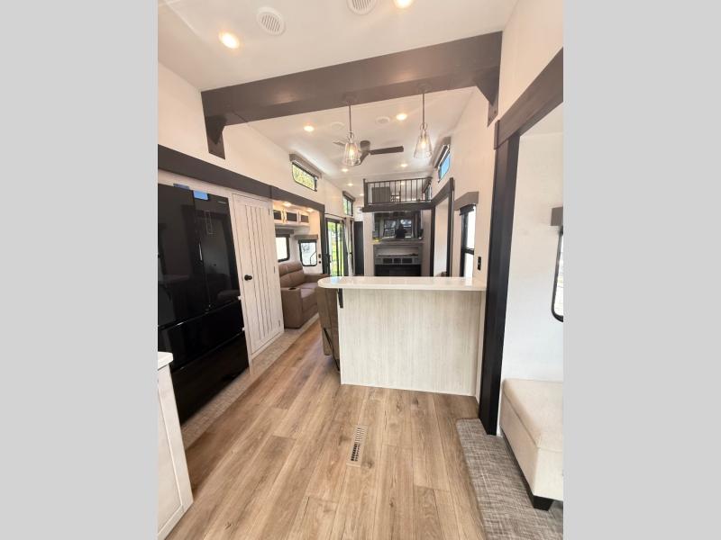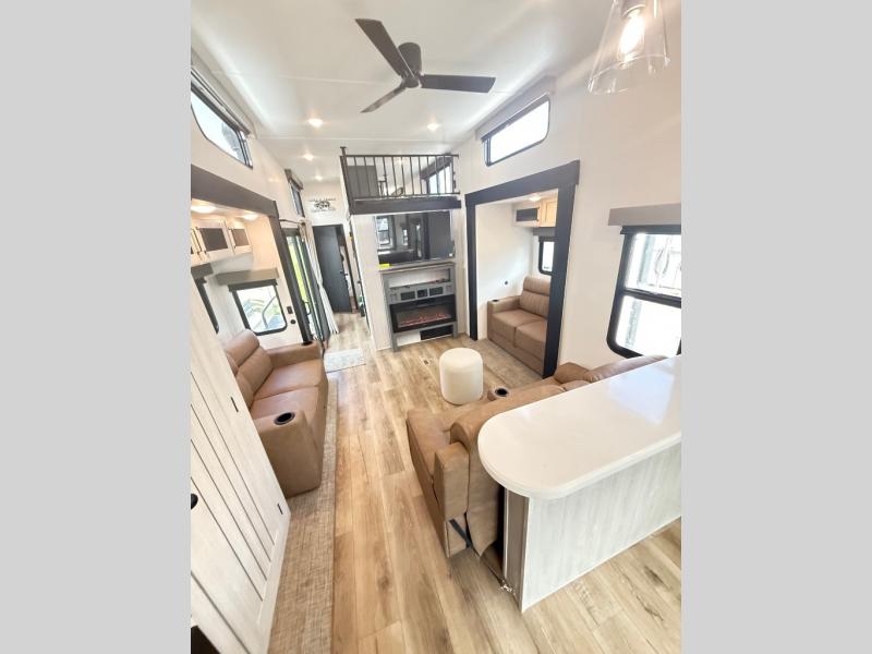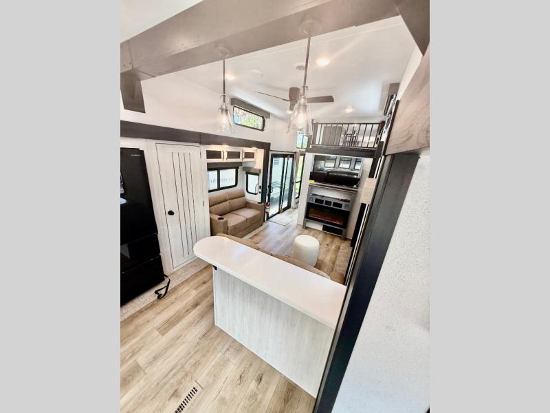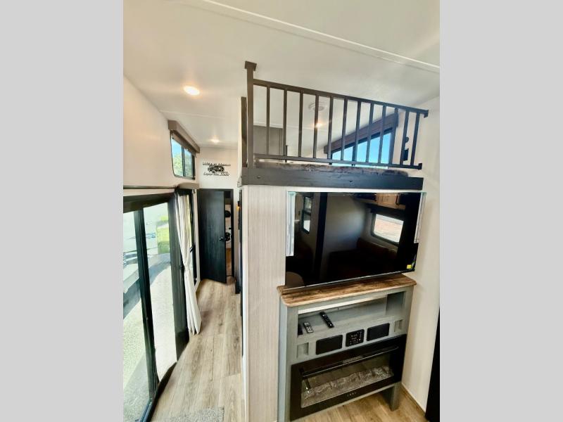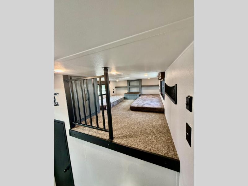 This is the perfect destination trailer for a larger group since it can sleep up to nine campers each night. The little ones will love the double loft areas with three bunk mats and storage space for their things, while you take the rear private bedroom. There is a king bed slide out here, along with a wardrobe/closet for your clothes, plus a second closet with the option to add washer and dryer prep. Everyone can meet in the middle living room to relax on the dual sofas or recliners across from the fireplace and entertainment center. Head to the front of the unit where you'll find the kitchen that includes ample counter space to prep meals, a residential style refrigerator and pantry for food storage, and a free-standing table to dine at. There is also a breakfast nook that overlooks the living area so you can visit with the cook and watch a movie at the same time!