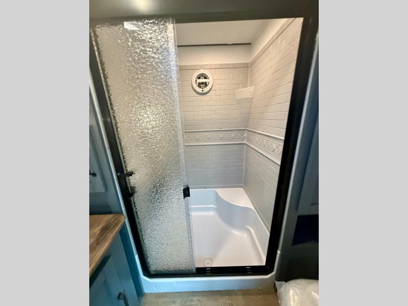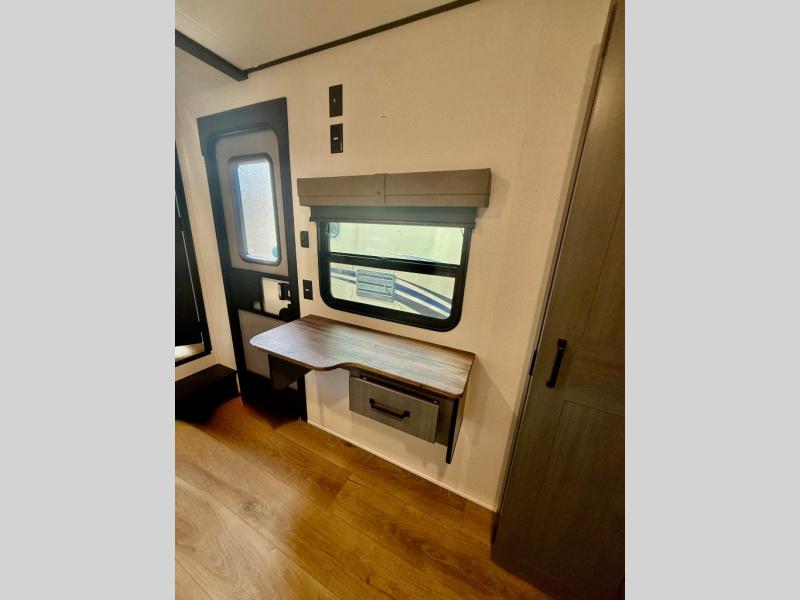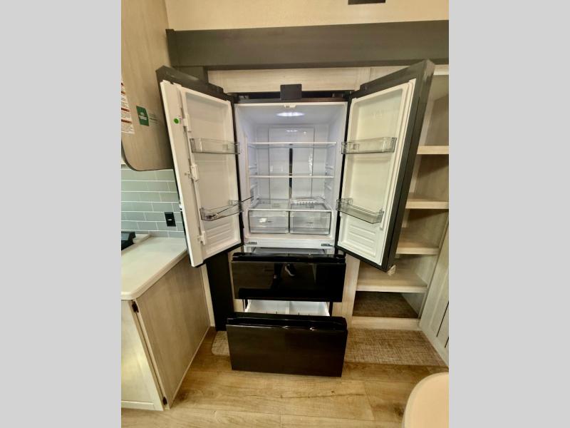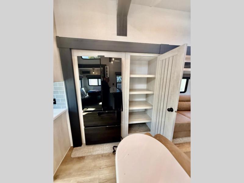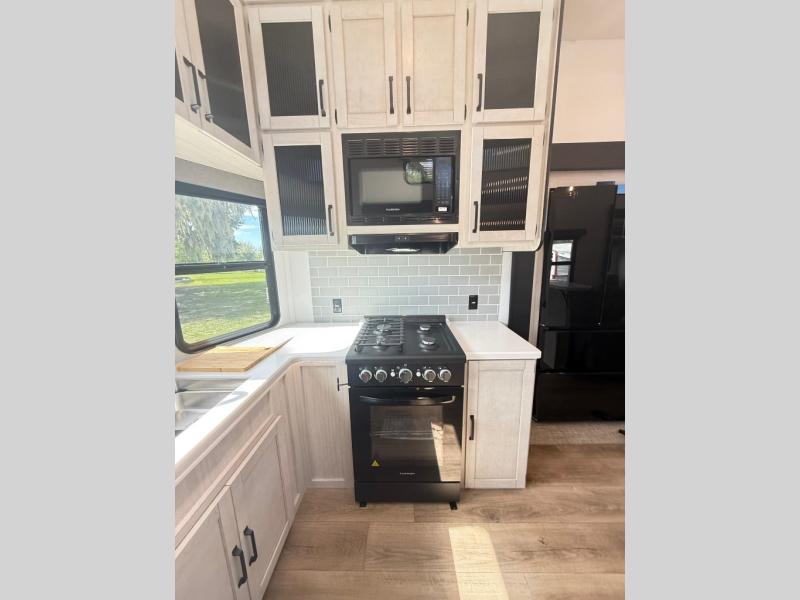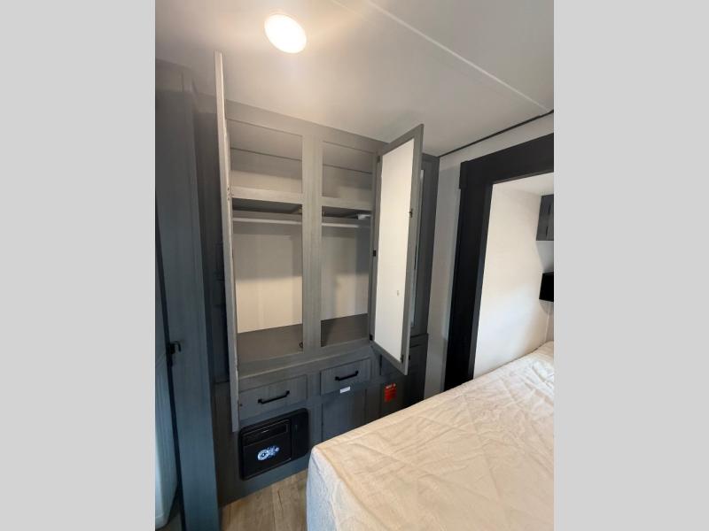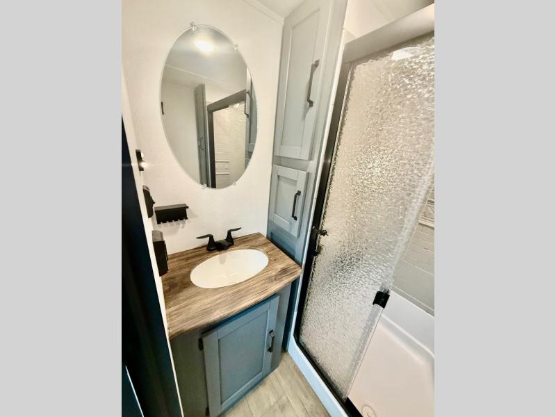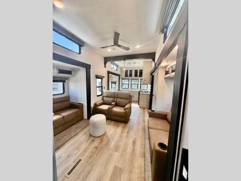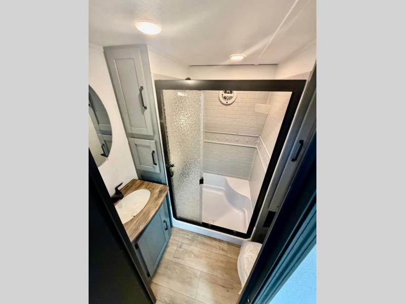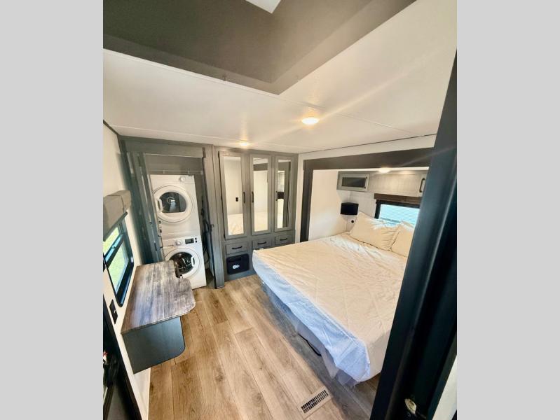 This is the perfect destination trailer for a larger group since it can sleep up to nine campers each night. The little ones will love the double loft areas with three bunk mats and storage space for their things, while you take the rear private bedroom. There is a king bed slide out here, along with a wardrobe/closet for your clothes, plus a second closet with the option to add washer and dryer prep. Everyone can meet in the middle living room to relax on the dual sofas or recliners across from the fireplace and entertainment center. Head to the front of the unit where you'll find the kitchen that includes ample counter space to prep meals, a residential style refrigerator and pantry for food storage, and a free-standing table to dine at. There is also a breakfast nook that overlooks the living area so you can visit with the cook and watch a movie at the same time!