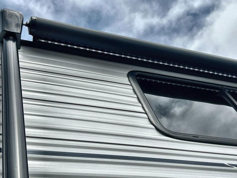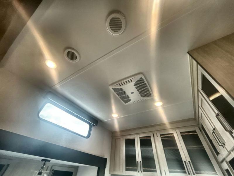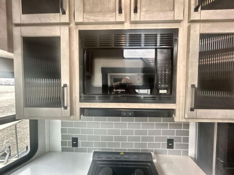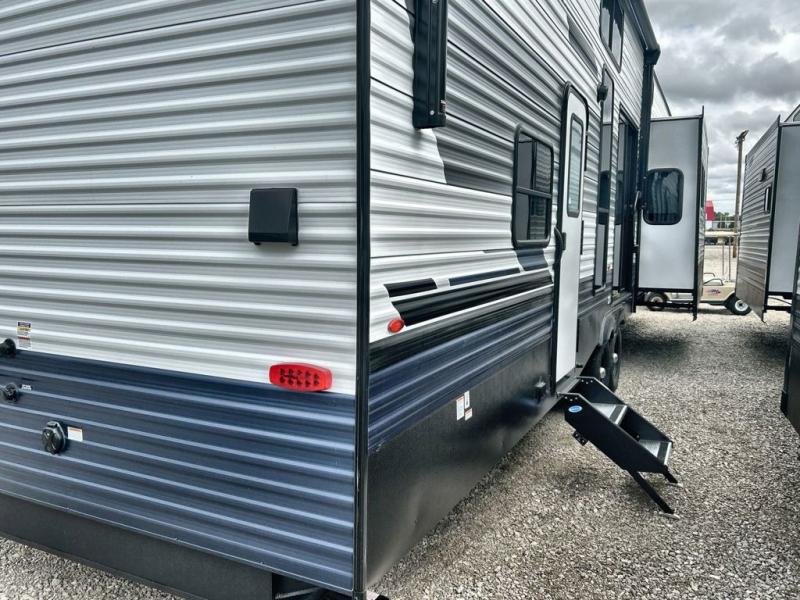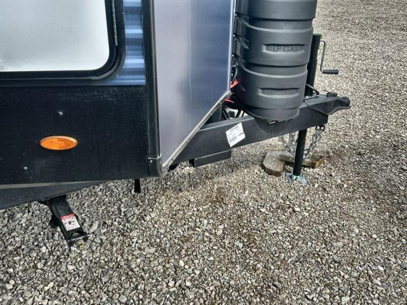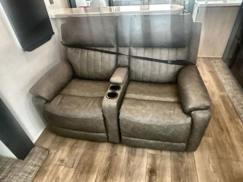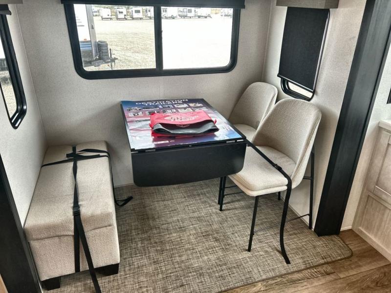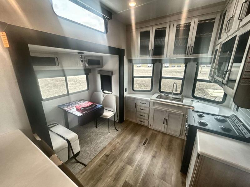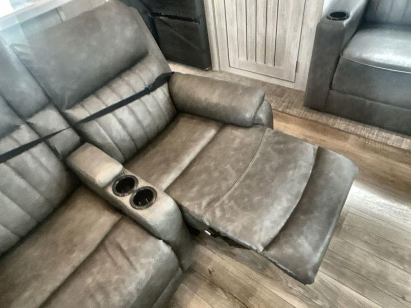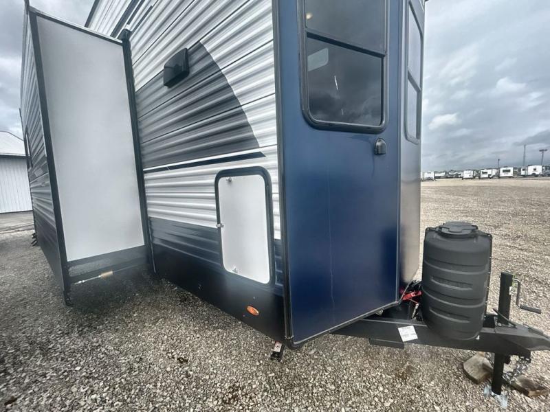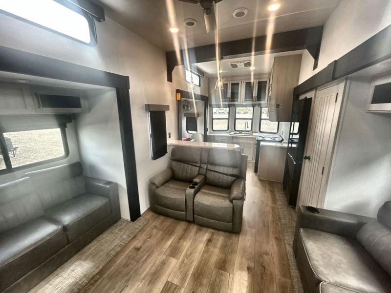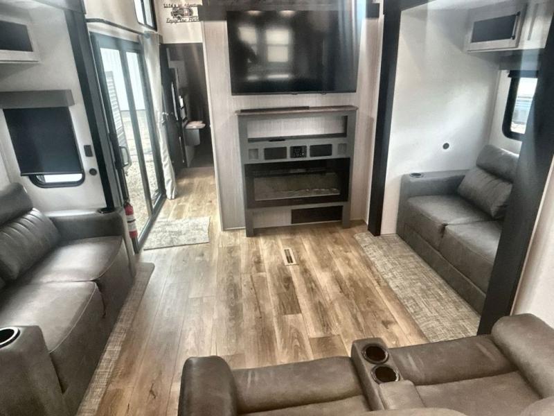 This is the perfect destination trailer for a larger group since it can sleep up to nine campers each night. The little ones will love the double loft areas with three bunk mats and storage space for their things, while you take the rear private bedroom. There is a king bed slide out here, along with a wardrobe/closet for your clothes, plus a second closet with washer and dryer prep. Everyone can meet in the middle living room to relax on the dual opposing sofas or theater seating across from the fireplace and entertainment center. Head to the front of the unit where you'll find the kitchen that includes ample counter space to prep meals, a residential style refrigerator and pantry for food storage, and a free-standing table to dine at. There is also a breakfast nook that overlooks the living area so you can visit with the cook and watch a movie at the same time!