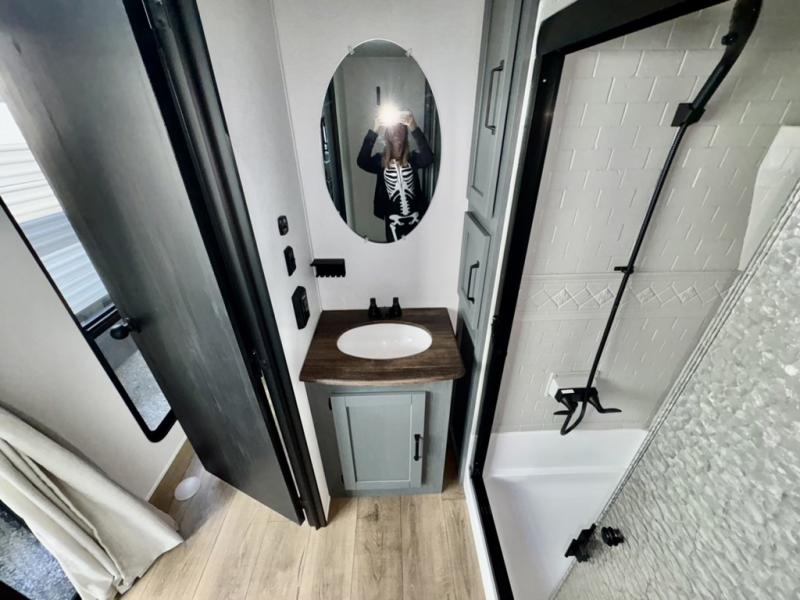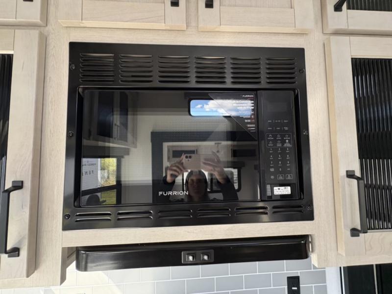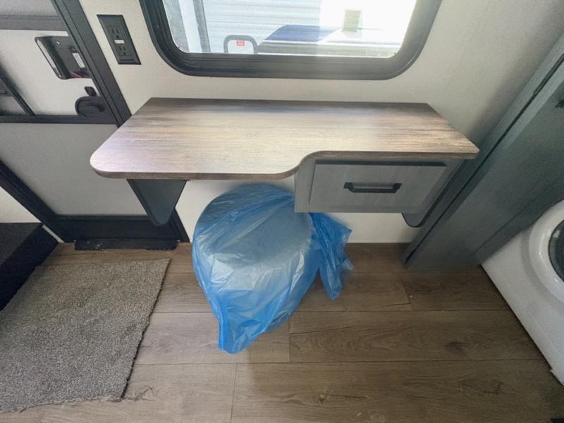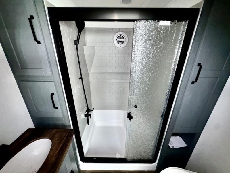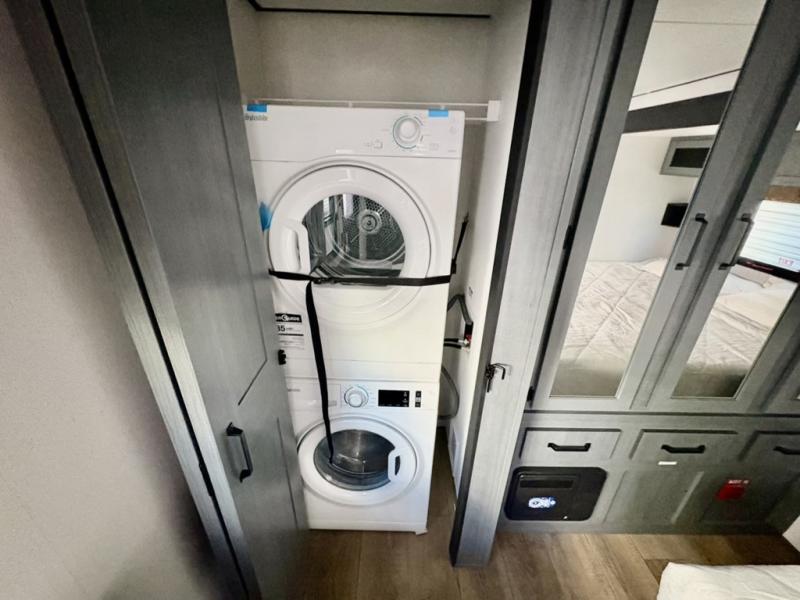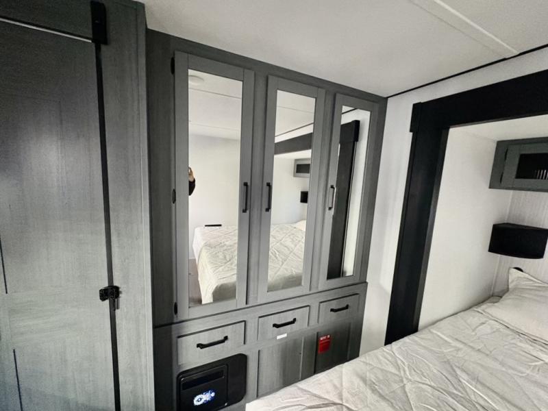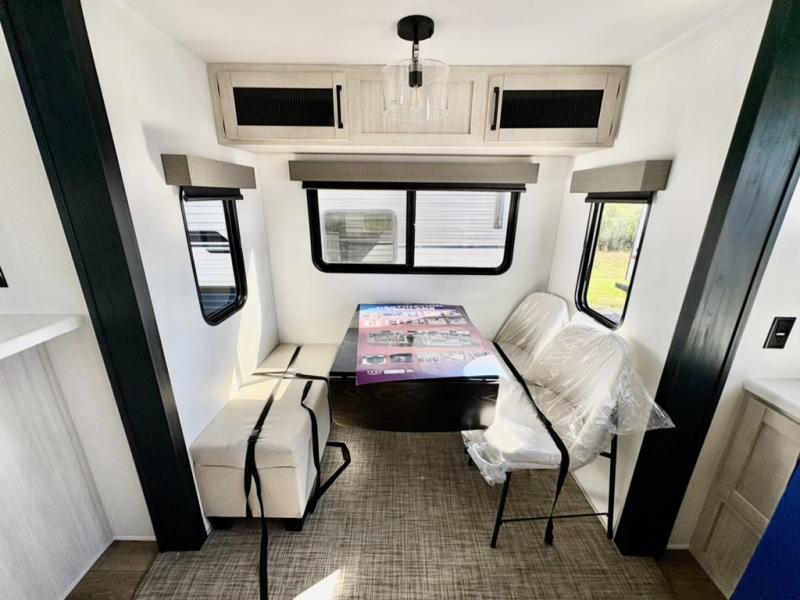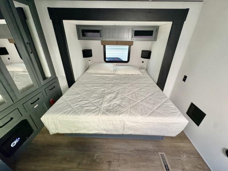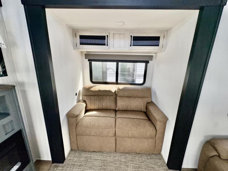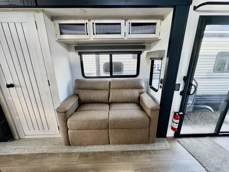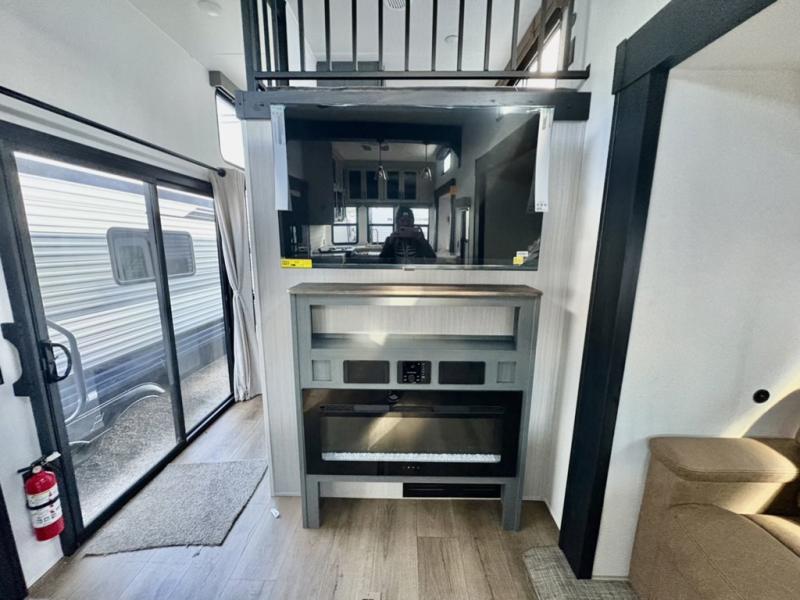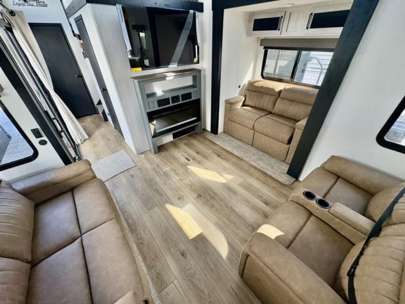 This is the perfect destination trailer for a larger group since it can sleep up to nine campers each night. The little ones will love the double loft areas with three bunk mats and storage space for their things, while you take the rear private bedroom. There is a king bed slide out here, along with a wardrobe/closet for your clothes, plus a second closet with washer and dryer prep. Everyone can meet in the middle living room to relax on the dual opposing sofas or theater seating across from the fireplace and entertainment center. Head to the front of the unit where you'll find the kitchen that includes ample counter space to prep meals, a residential style refrigerator and pantry for food storage, and a free-standing table to dine at. There is also a breakfast nook that overlooks the living area so you can visit with the cook and watch a movie at the same time!