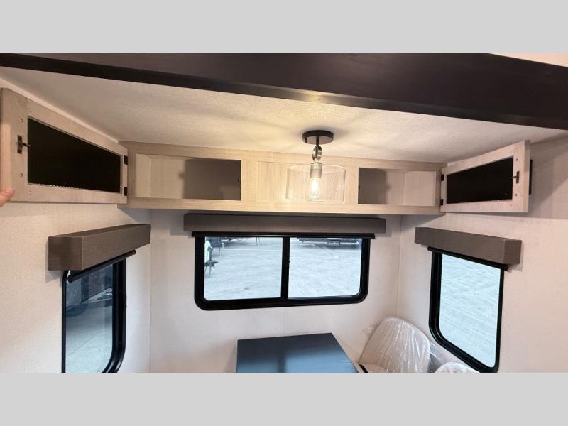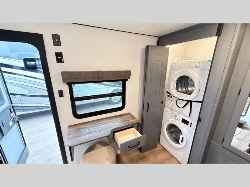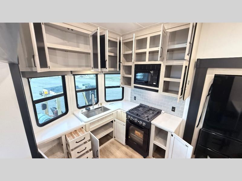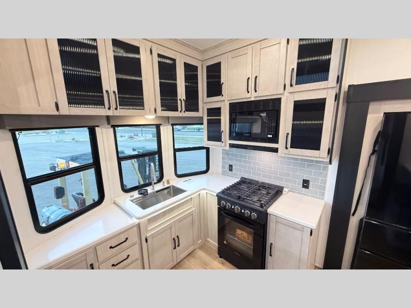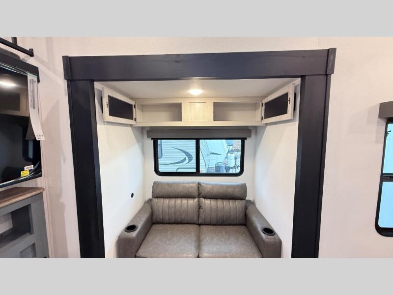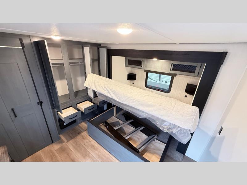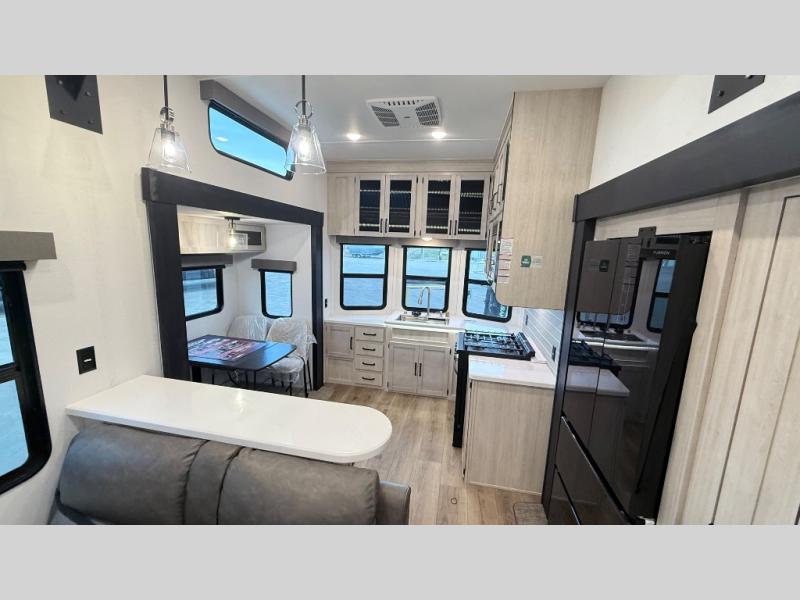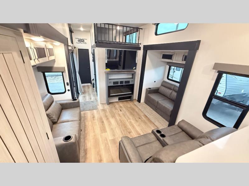 This is the perfect destination trailer for a larger group since it can sleep up to nine campers each night. The little ones will love the double loft areas with three bunk mats and storage space for their things, while you take the rear private bedroom. There is a king bed slide out here, along with a wardrobe/closet for your clothes, plus a second closet with washer and dryer prep. Everyone can meet in the middle living room to relax on the dual opposing sofas or theater seating across from the fireplace and entertainment center. Head to the front of the unit where you'll find the kitchen that includes ample counter space to prep meals, a residential style refrigerator and pantry for food storage, and a free-standing table to dine at. There is also a breakfast nook that overlooks the living area so you can visit with the cook and watch a movie at the same time!