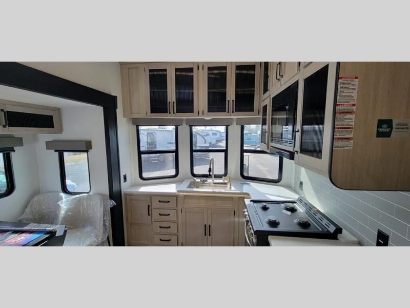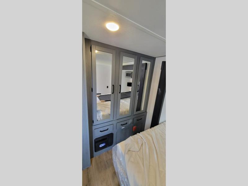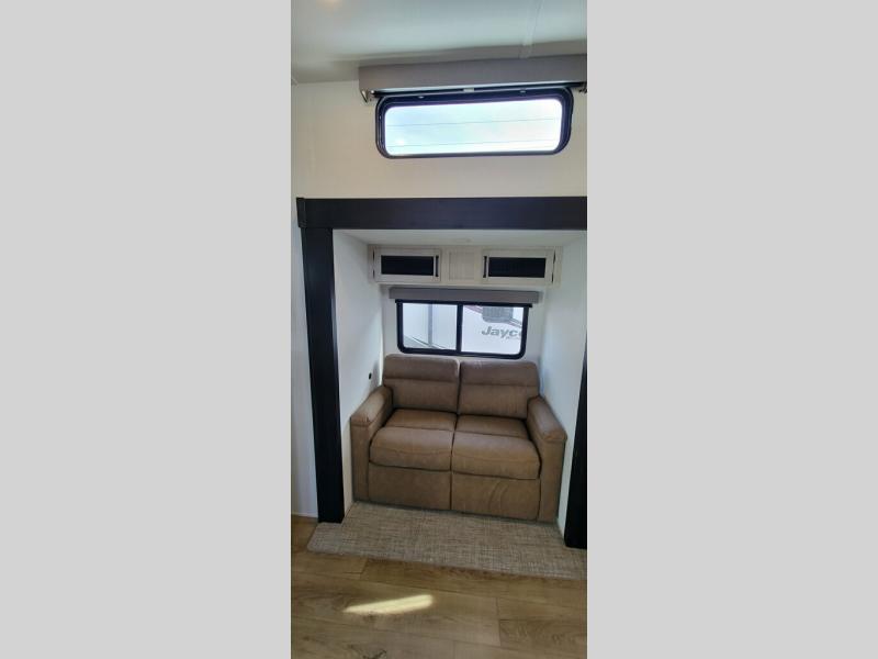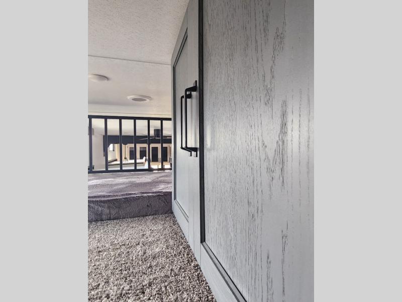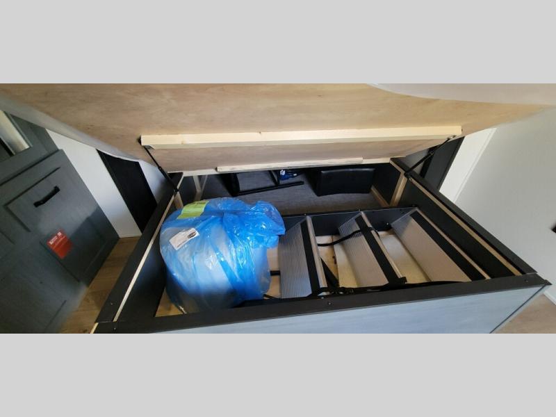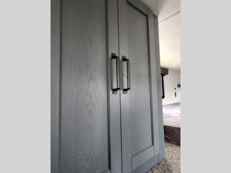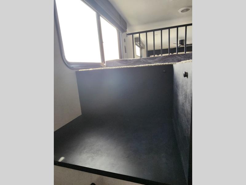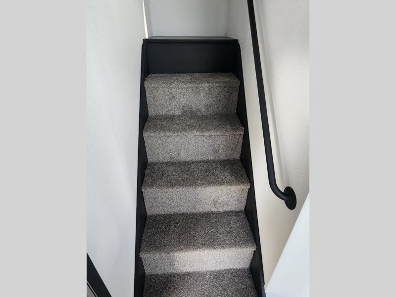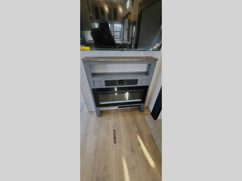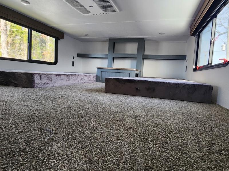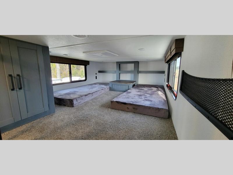 This is the perfect destination trailer for a larger group since it can sleep up to nine campers each night. The little ones will love the double loft areas with three bunk mats and storage space for their things, while you take the rear private bedroom. There is a king bed slide out here, along with a wardrobe/closet for your clothes, plus a second closet with washer and dryer prep. Everyone can meet in the middle living room to relax on the dual opposing sofas or theater seating across from the fireplace and entertainment center. Head to the front of the unit where you'll find the kitchen that includes ample counter space to prep meals, a residential style refrigerator and pantry for food storage, and a free-standing table to dine at. There is also a breakfast nook that overlooks the living area so you can visit with the cook and watch a movie at the same time!