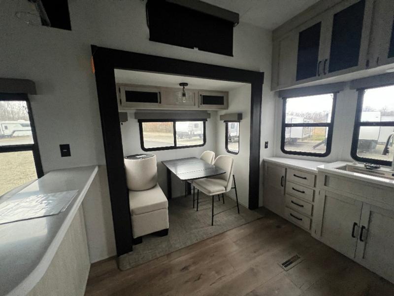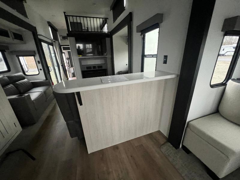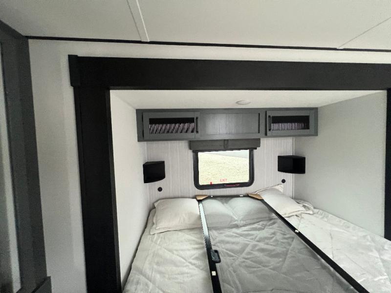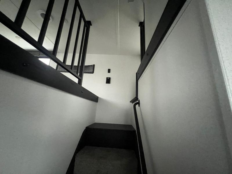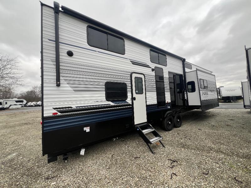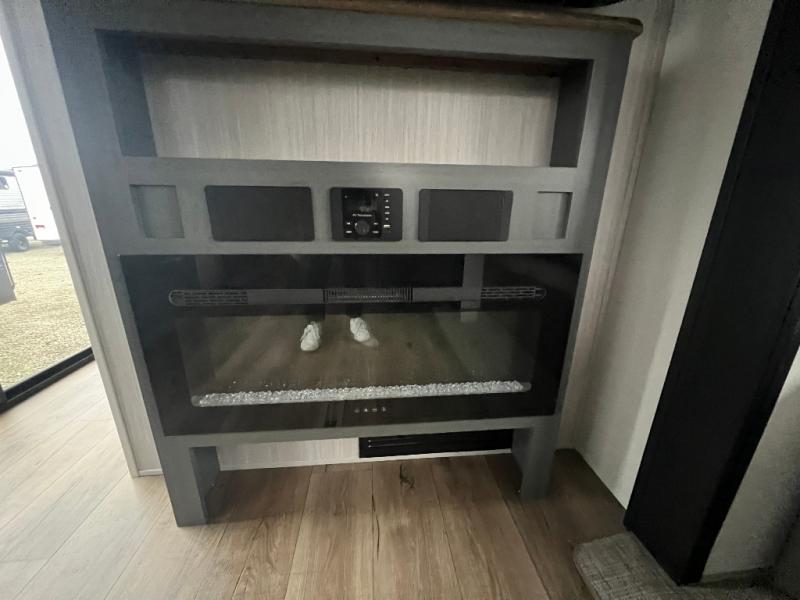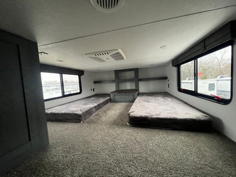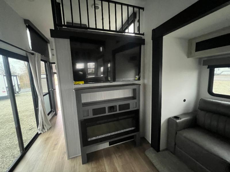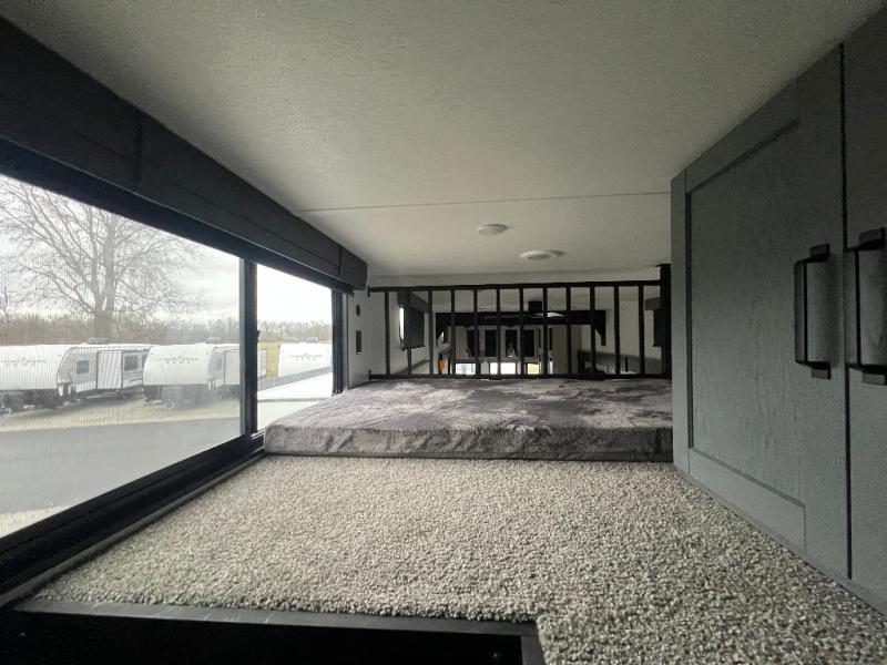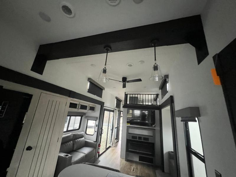 This is the perfect destination trailer for a larger group since it can sleep up to nine campers each night. The little ones will love the double loft areas with three bunk mats and storage space for their things, while you take the rear private bedroom. There is a king bed slide out here, along with a wardrobe/closet for your clothes, plus a second closet with the option to add washer and dryer prep. Everyone can meet in the middle living room to relax on the dual sofas or recliners across from the fireplace and entertainment center. Head to the front of the unit where you'll find the kitchen that includes ample counter space to prep meals, a residential style refrigerator and pantry for food storage, and a free-standing table to dine at. There is also a breakfast nook that overlooks the living area so you can visit with the cook and watch a movie at the same time!