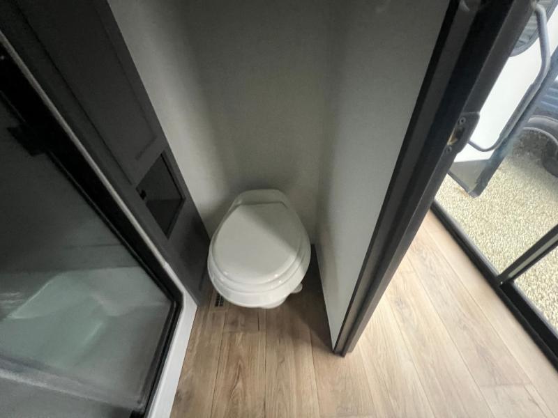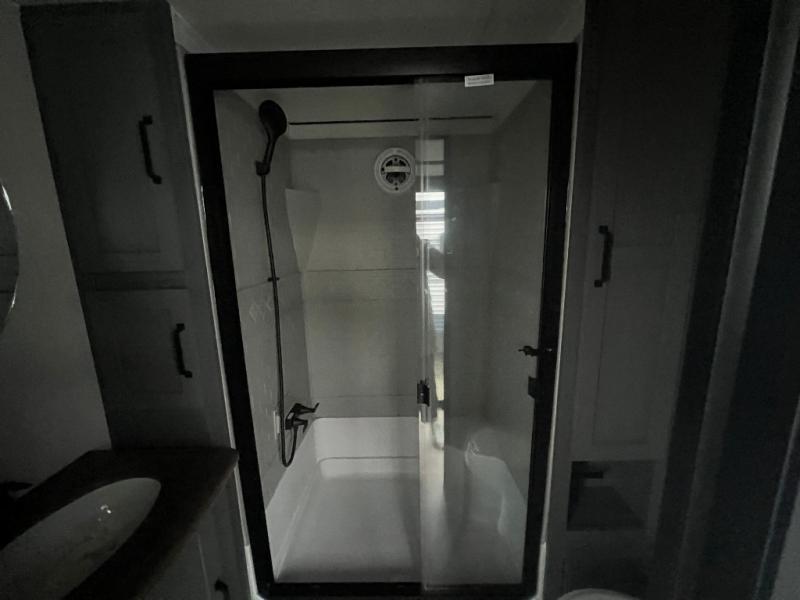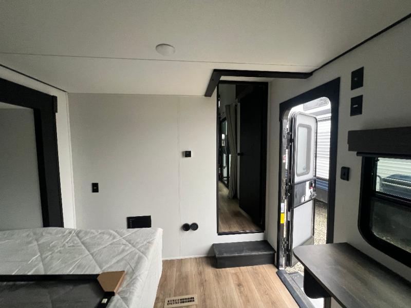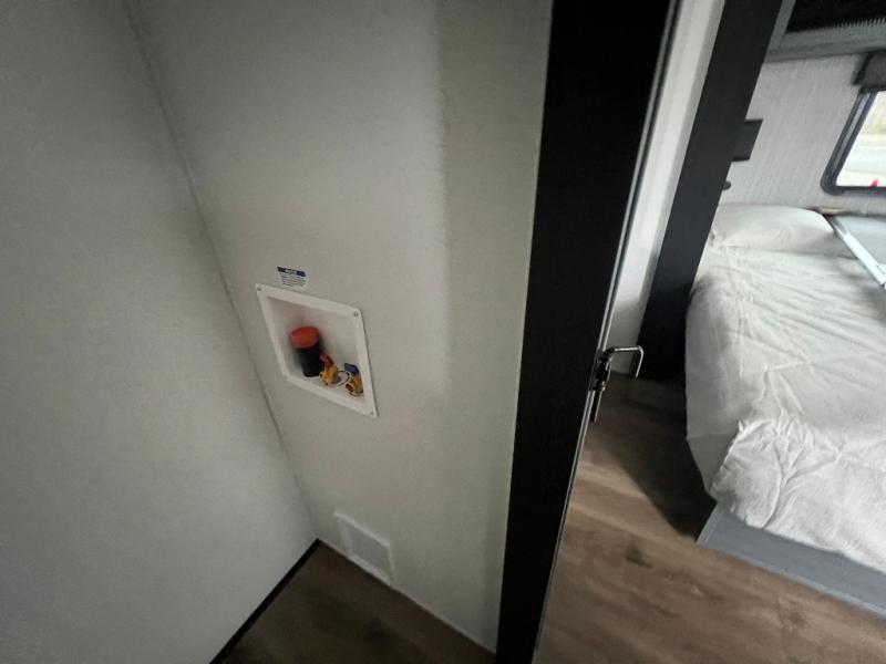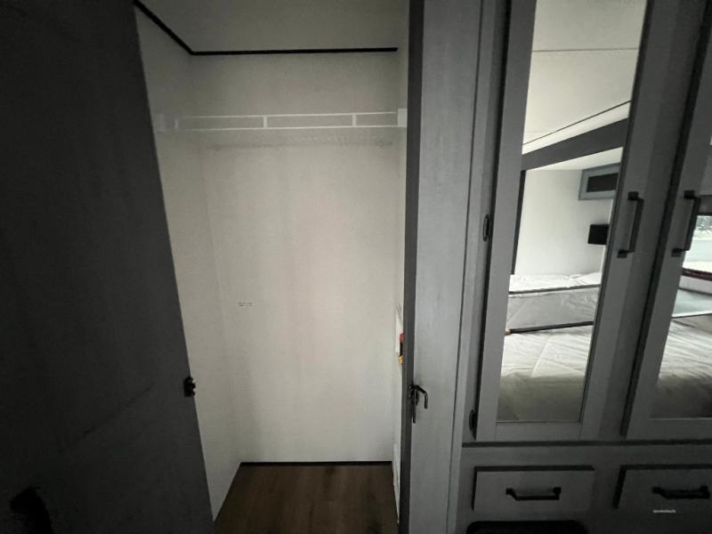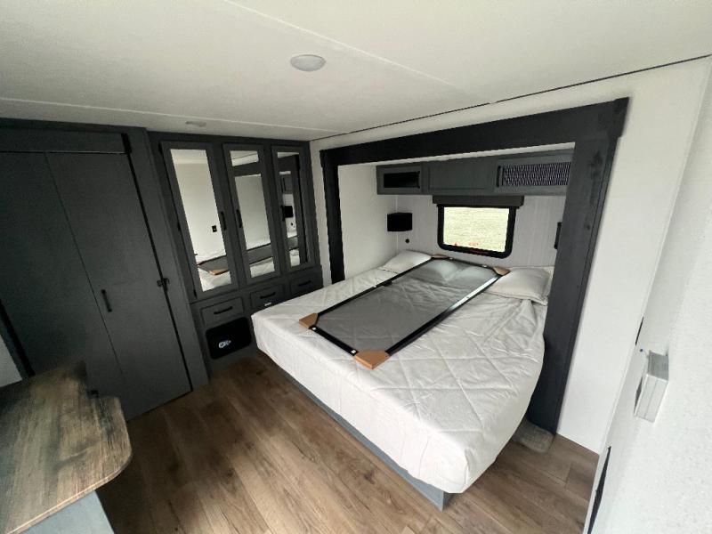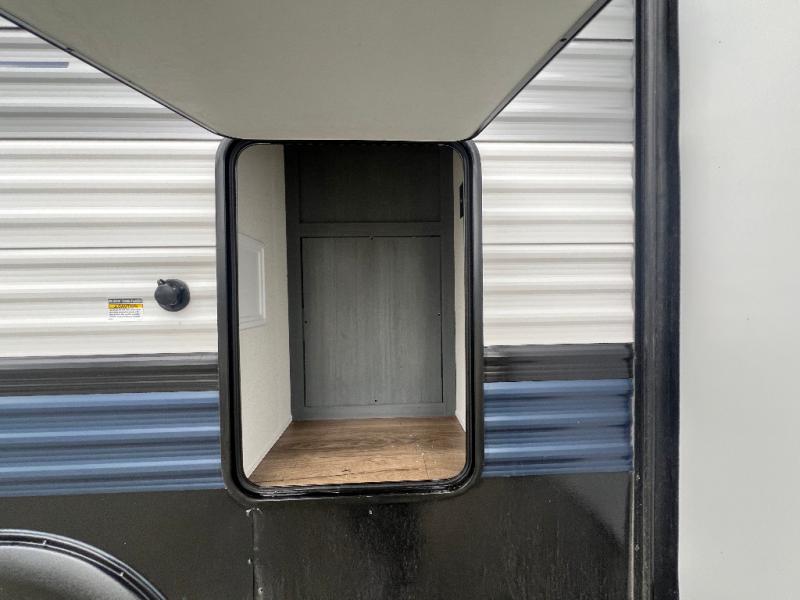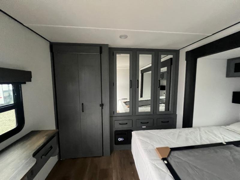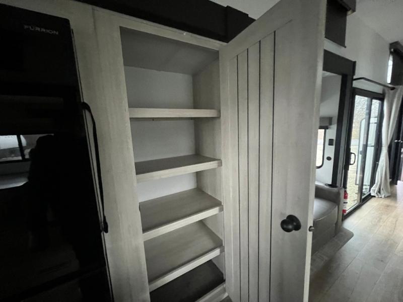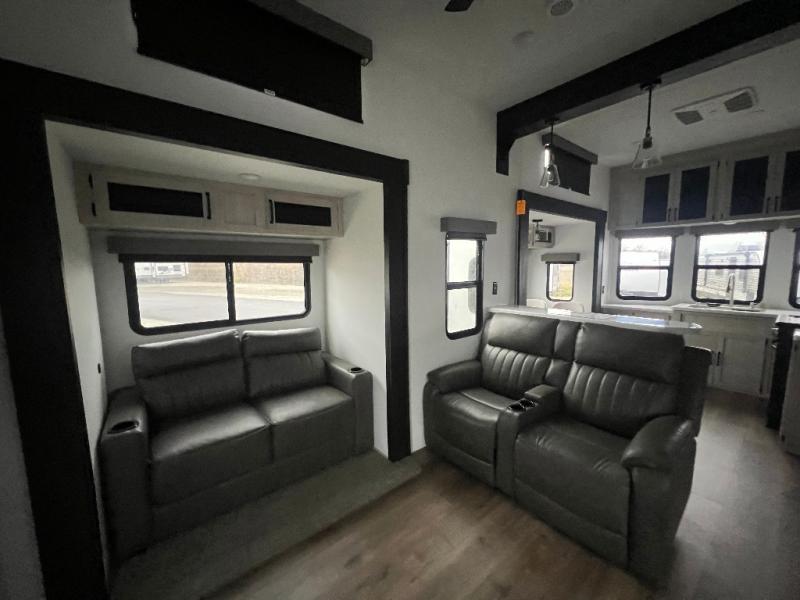 This is the perfect destination trailer for a larger group since it can sleep up to nine campers each night. The little ones will love the double loft areas with three bunk mats and storage space for their things, while you take the rear private bedroom. There is a king bed slide out here, along with a wardrobe/closet for your clothes, plus a second closet with the option to add washer and dryer prep. Everyone can meet in the middle living room to relax on the dual sofas or recliners across from the fireplace and entertainment center. Head to the front of the unit where you'll find the kitchen that includes ample counter space to prep meals, a residential style refrigerator and pantry for food storage, and a free-standing table to dine at. There is also a breakfast nook that overlooks the living area so you can visit with the cook and watch a movie at the same time!