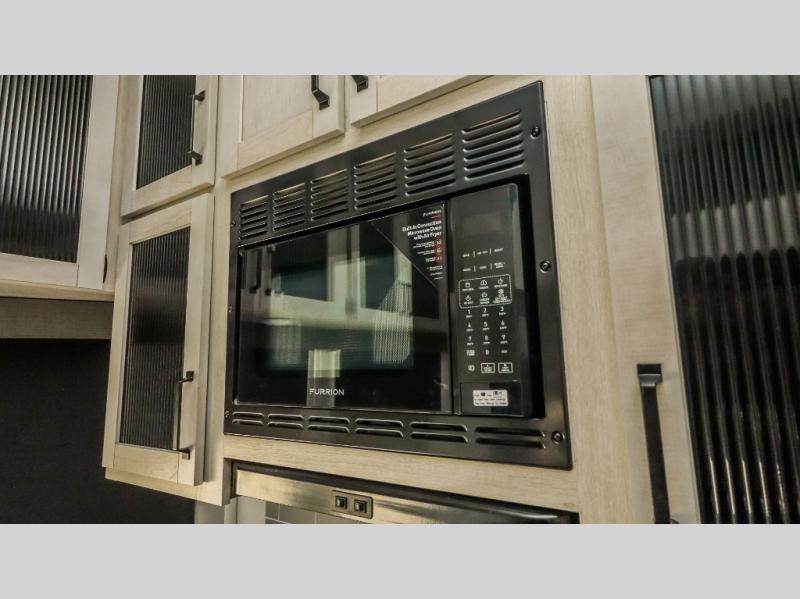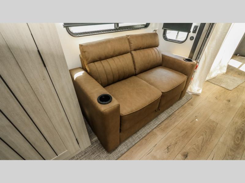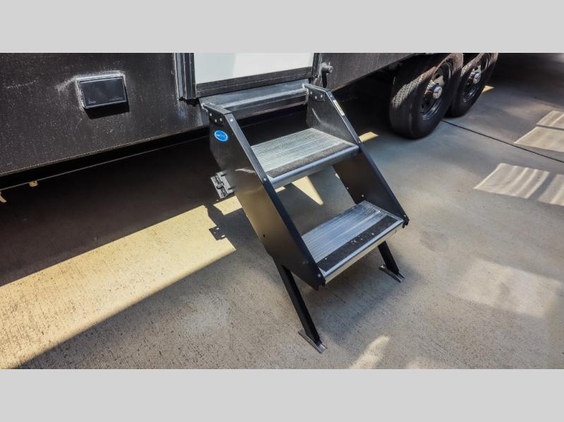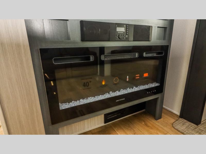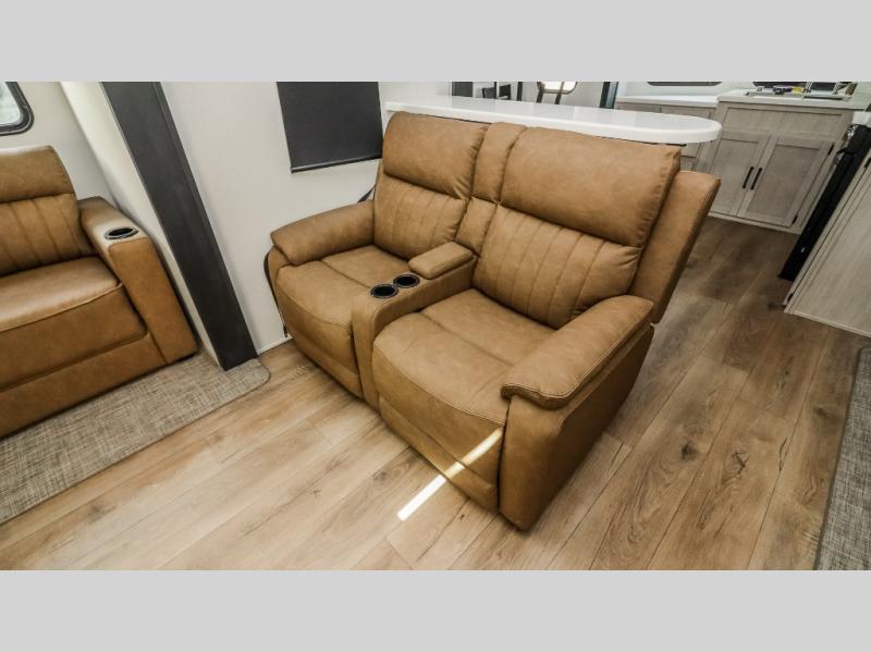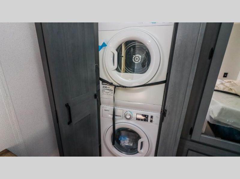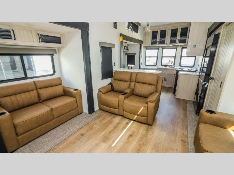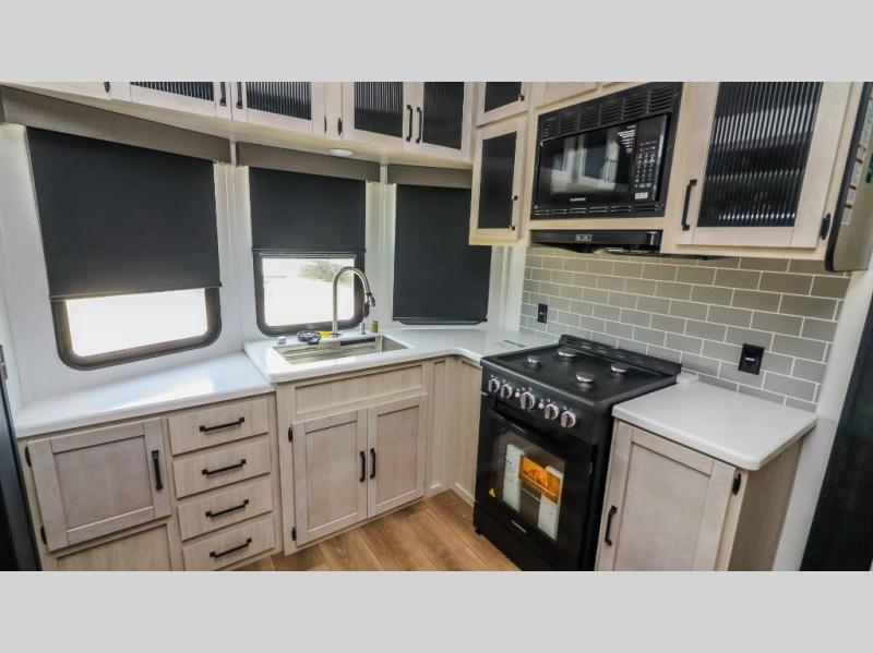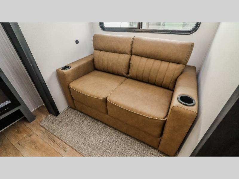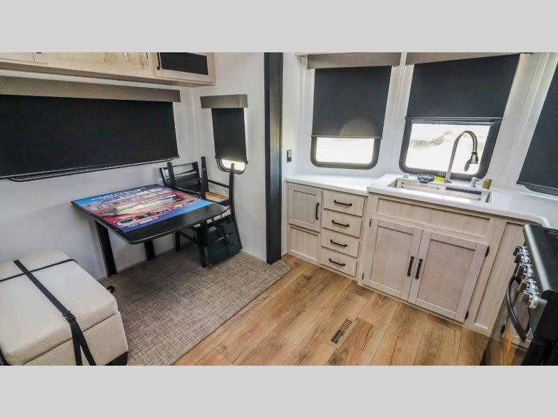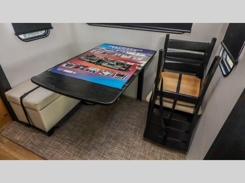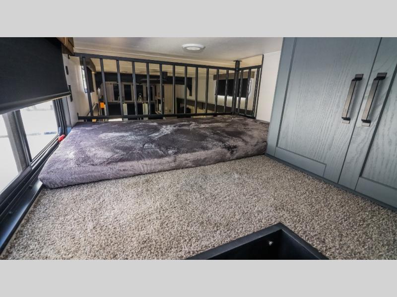 This is the perfect destination trailer for a larger group since it can sleep up to nine campers each night. The little ones will love the double loft areas with three bunk mats and storage space for their things, while you take the rear private bedroom. There is a king bed slide out here, along with a wardrobe/closet for your clothes, plus a second closet with washer and dryer prep. Everyone can meet in the middle living room to relax on the dual opposing sofas or theater seating across from the fireplace and entertainment center. Head to the front of the unit where you'll find the kitchen that includes ample counter space to prep meals, a residential style refrigerator and pantry for food storage, and a free-standing table to dine at. There is also a breakfast nook that overlooks the living area so you can visit with the cook and watch a movie at the same time!