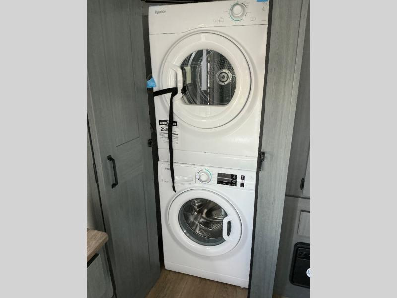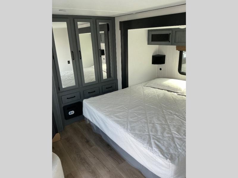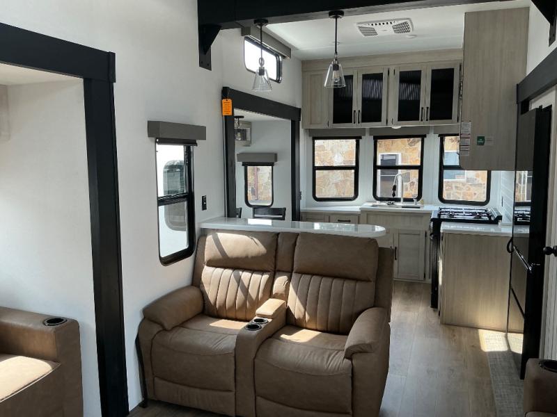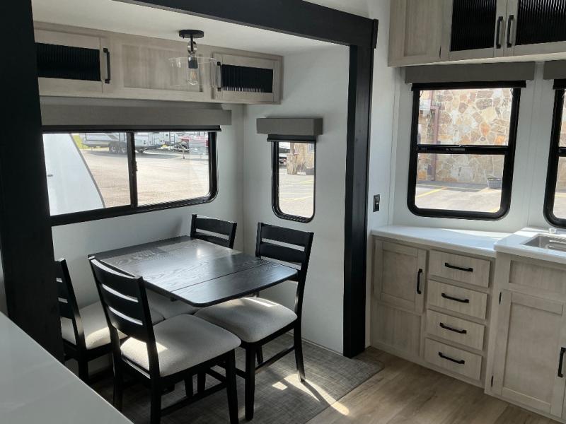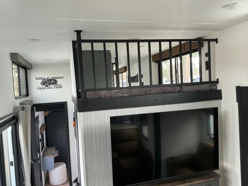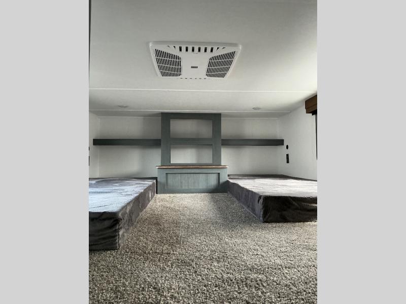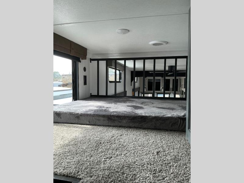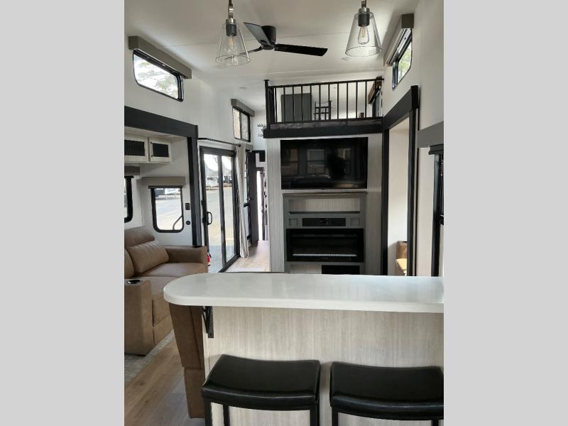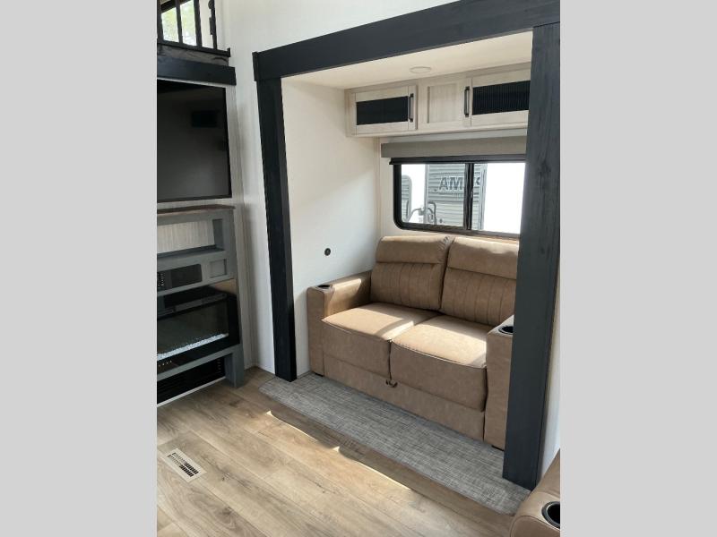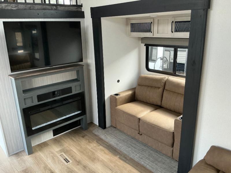 This is the perfect destination trailer for a larger group since it can sleep up to nine campers each night. The little ones will love the double loft areas with three bunk mats and storage space for their things, while you take the rear private bedroom. There is a king bed slide out here, along with a wardrobe/closet for your clothes, plus a second closet with washer and dryer prep. Everyone can meet in the middle living room to relax on the dual opposing sofas or theater seating across from the fireplace and entertainment center. Head to the front of the unit where you'll find the kitchen that includes ample counter space to prep meals, a residential style refrigerator and pantry for food storage, and a free-standing table to dine at. There is also a breakfast nook that overlooks the living area so you can visit with the cook and watch a movie at the same time!