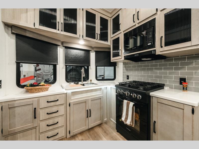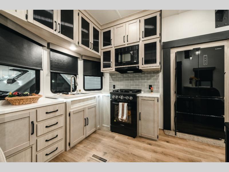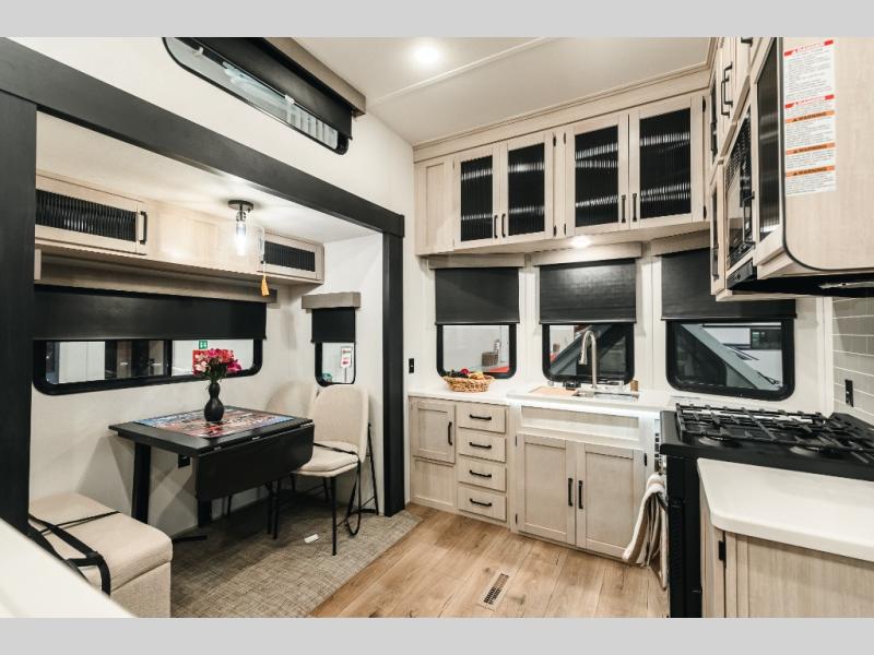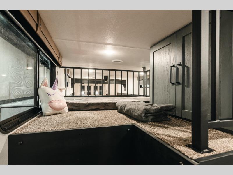 This is the perfect destination trailer for a larger group since it can sleep up to nine campers each night. The little ones will love the double loft areas with three bunk mats and storage space for their things, while you take the rear private bedroom. There is a king bed slide out here, along with a wardrobe/closet for your clothes, plus a second closet with washer and dryer prep. Everyone can meet in the middle living room to relax on the dual opposing sofas or theater seating across from the fireplace and entertainment center. Head to the front of the unit where you'll find the kitchen that includes ample counter space to prep meals, a residential style refrigerator and pantry for food storage, and a free-standing table to dine at. There is also a breakfast nook that overlooks the living area so you can visit with the cook and watch a movie at the same time!