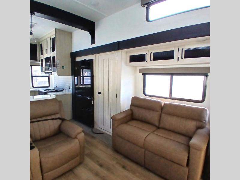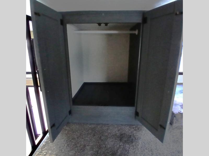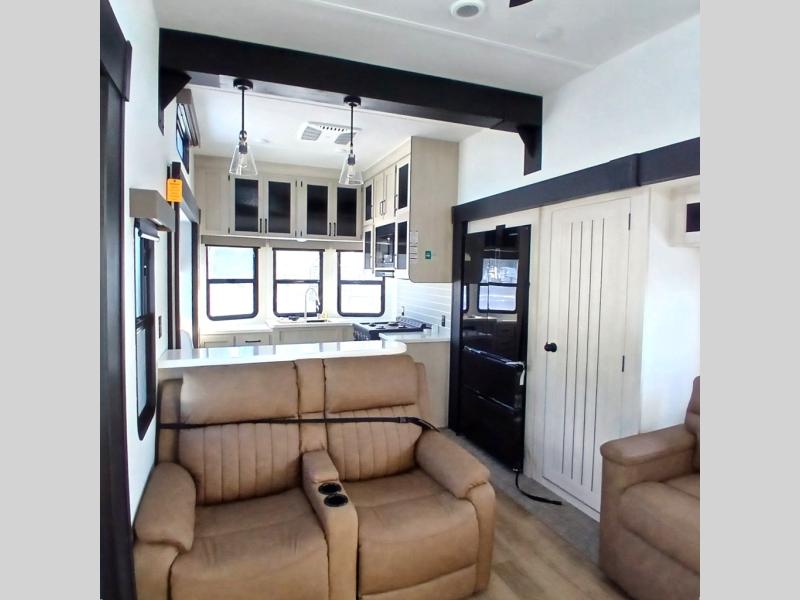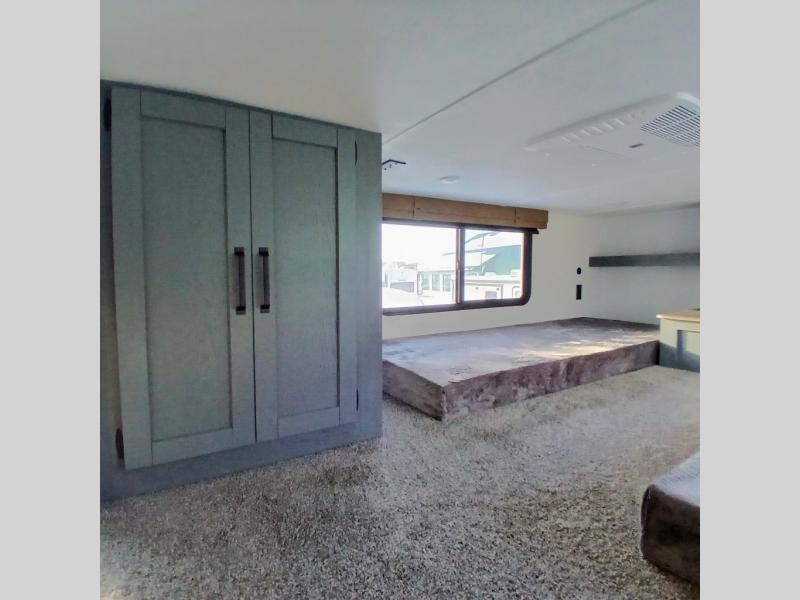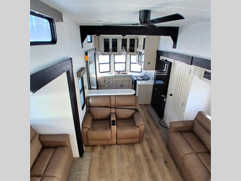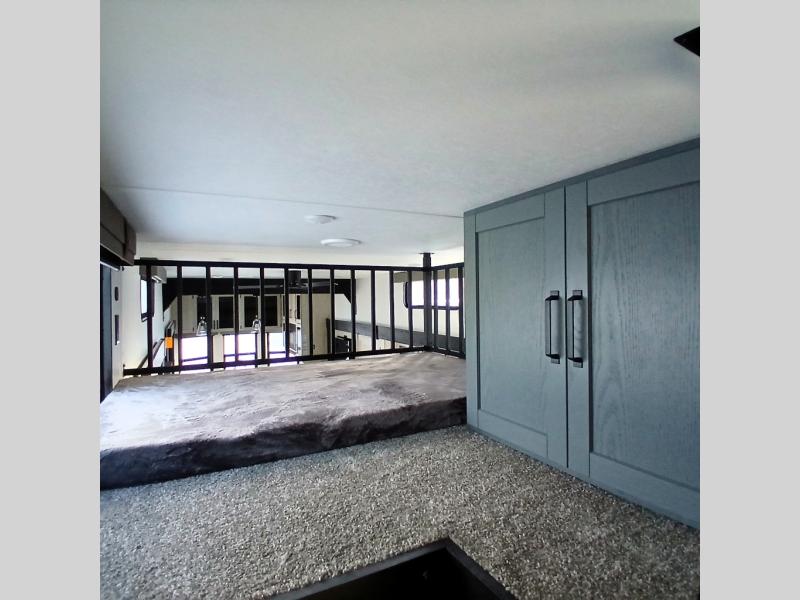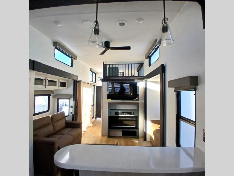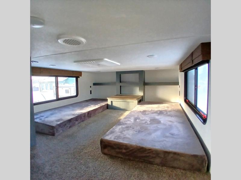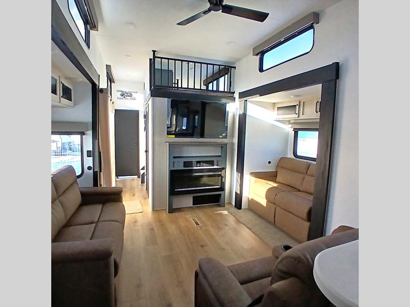 This is the perfect destination trailer for a larger group since it can sleep up to nine campers each night. The little ones will love the double loft areas with three bunk mats and storage space for their things, while you take the rear private bedroom. There is a king bed slide out here, along with a wardrobe/closet for your clothes, plus a second closet with washer and dryer prep. Everyone can meet in the middle living room to relax on the dual opposing sofas or theater seating across from the fireplace and entertainment center. Head to the front of the unit where you'll find the kitchen that includes ample counter space to prep meals, a residential style refrigerator and pantry for food storage, and a free-standing table to dine at. There is also a breakfast nook that overlooks the living area so you can visit with the cook and watch a movie at the same time!
