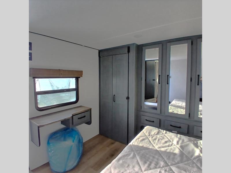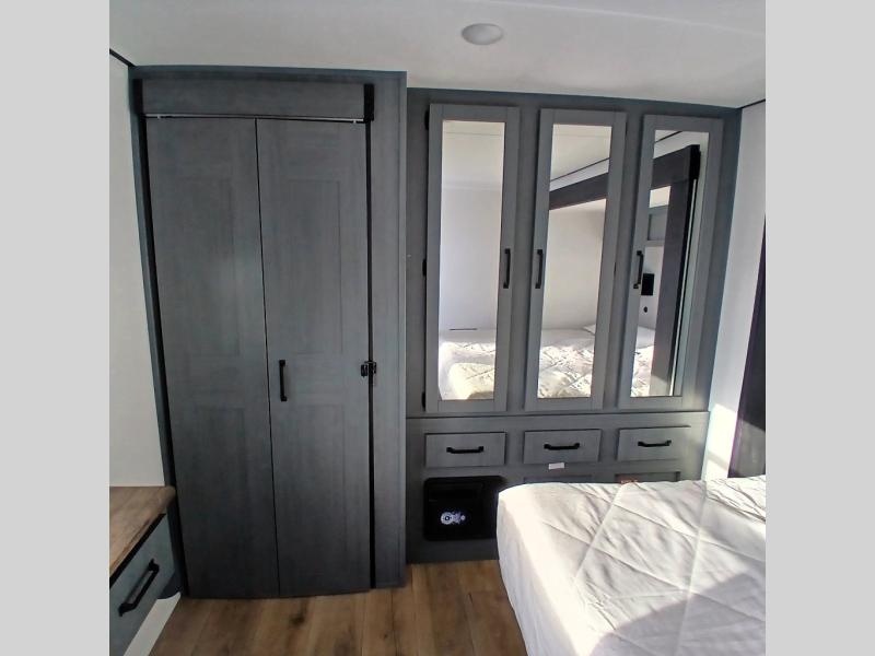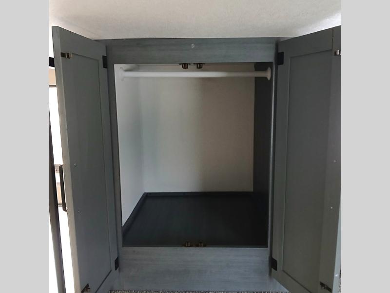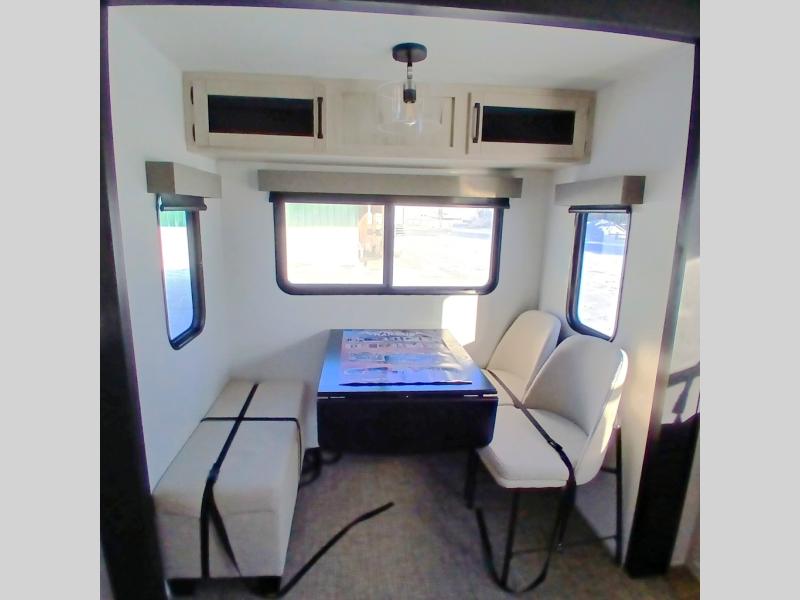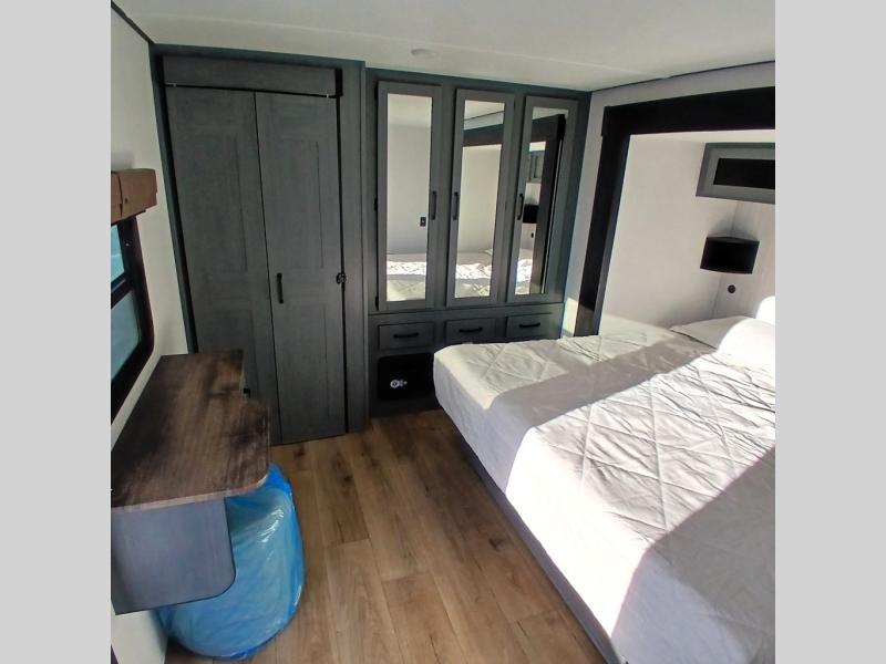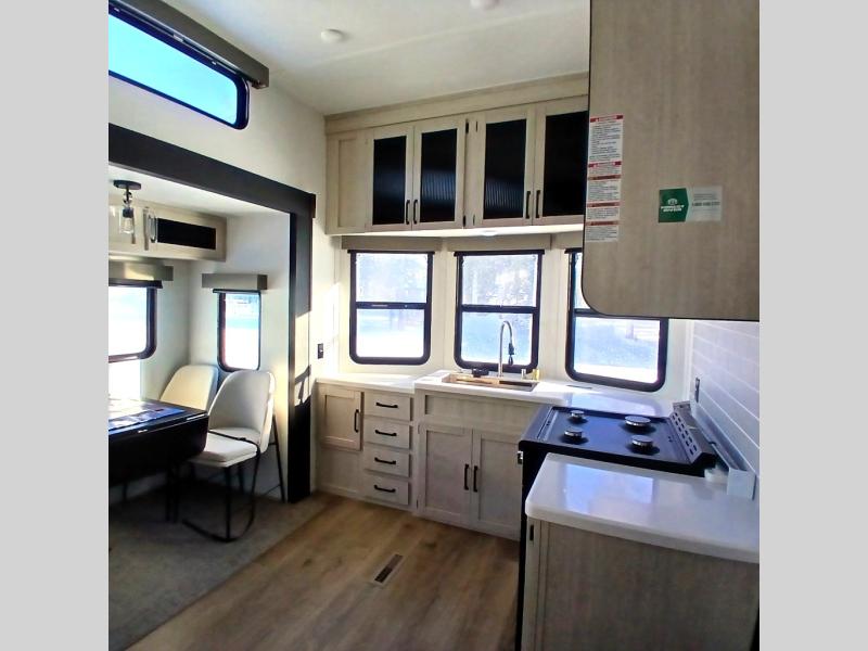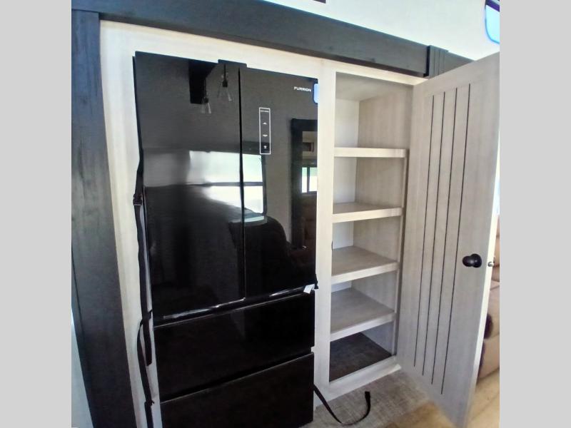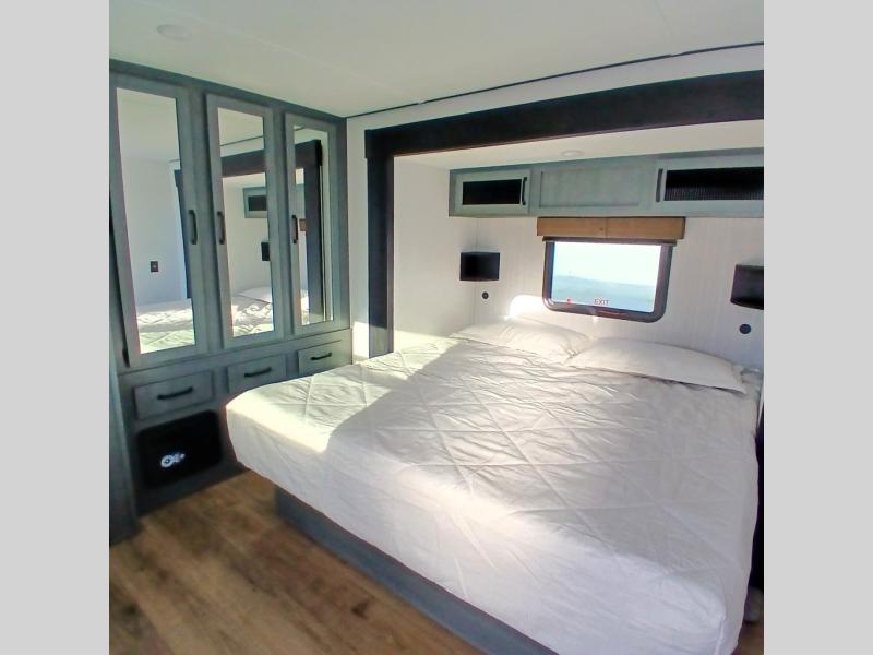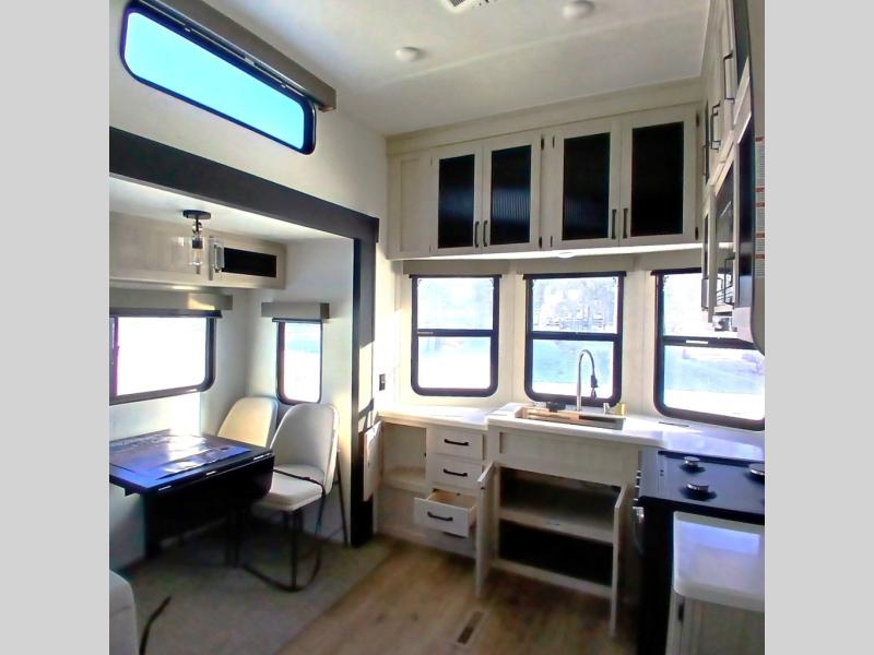 This is the perfect destination trailer for a larger group since it can sleep up to nine campers each night. The little ones will love the double loft areas with three bunk mats and storage space for their things, while you take the rear private bedroom. There is a king bed slide out here, along with a wardrobe/closet for your clothes, plus a second closet with washer and dryer prep. Everyone can meet in the middle living room to relax on the dual opposing sofas or theater seating across from the fireplace and entertainment center. Head to the front of the unit where you'll find the kitchen that includes ample counter space to prep meals, a residential style refrigerator and pantry for food storage, and a free-standing table to dine at. There is also a breakfast nook that overlooks the living area so you can visit with the cook and watch a movie at the same time!
