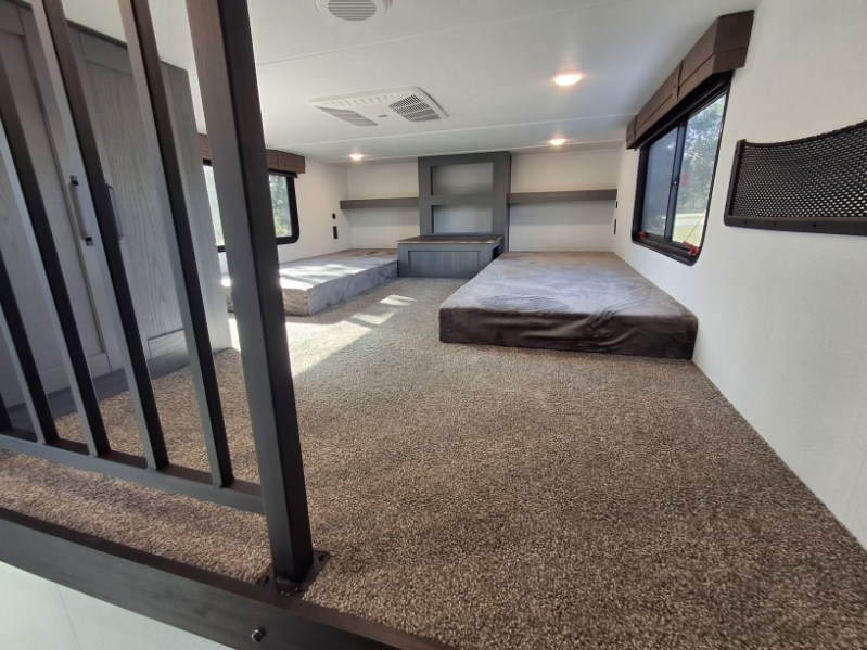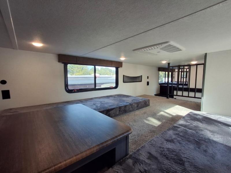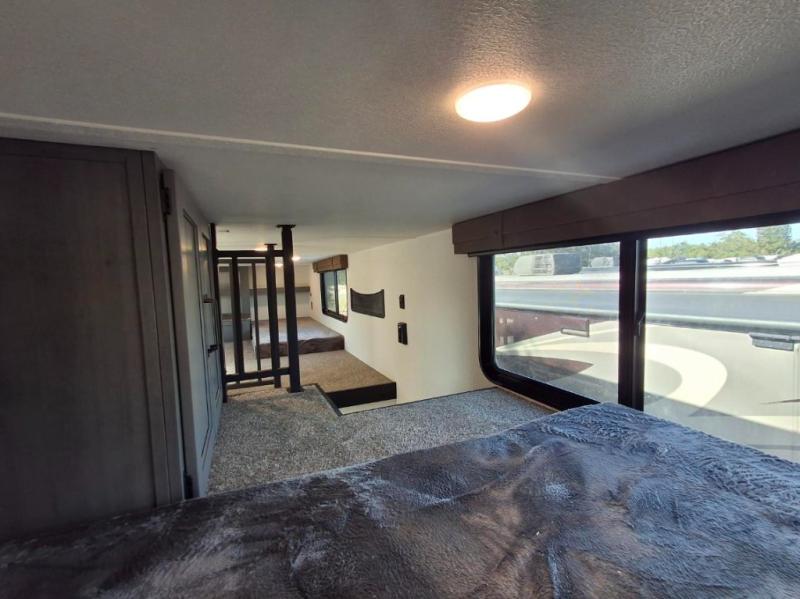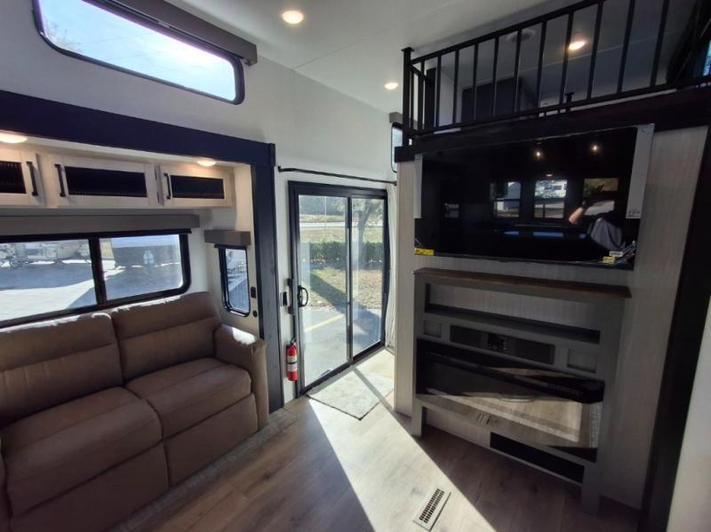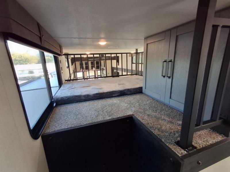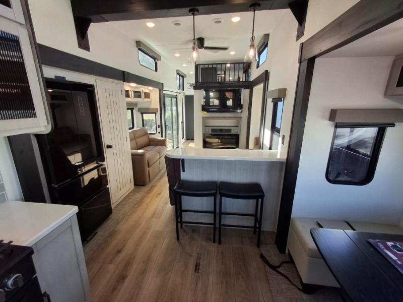 This is the perfect destination trailer for a larger group since it can sleep up to nine campers each night. The little ones will love the double loft areas with three bunk mats and storage space for their things, while you take the rear private bedroom. There is a king bed slide out here, along with a wardrobe/closet for your clothes, plus a second closet with washer and dryer prep. Everyone can meet in the middle living room to relax on the dual opposing sofas or theater seating across from the fireplace and entertainment center. Head to the front of the unit where you'll find the kitchen that includes ample counter space to prep meals, a residential style refrigerator and pantry for food storage, and a free-standing table to dine at. There is also a breakfast nook that overlooks the living area so you can visit with the cook and watch a movie at the same time!
