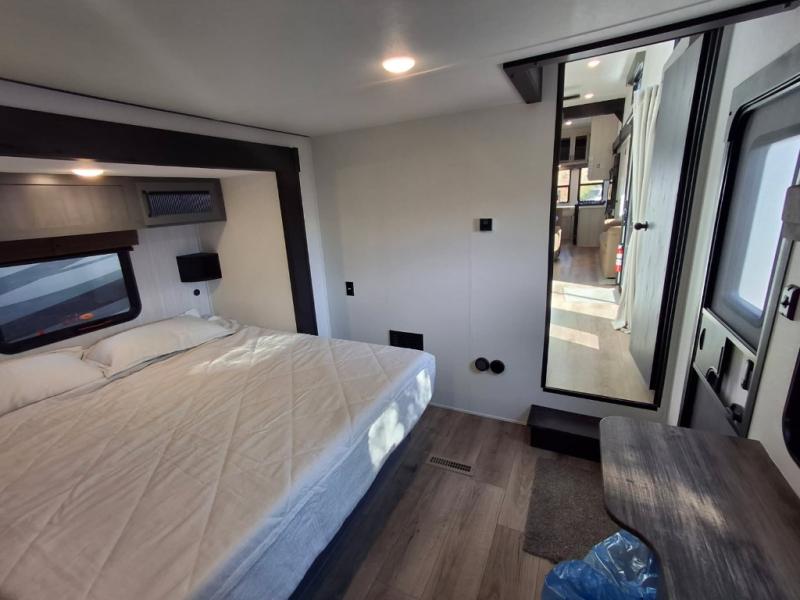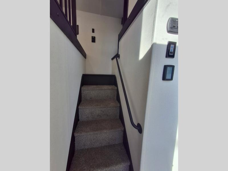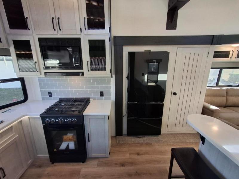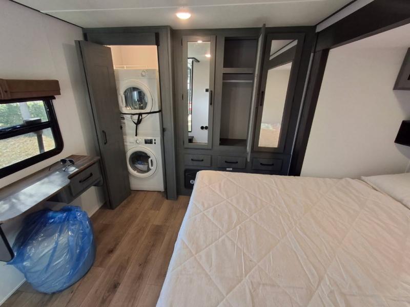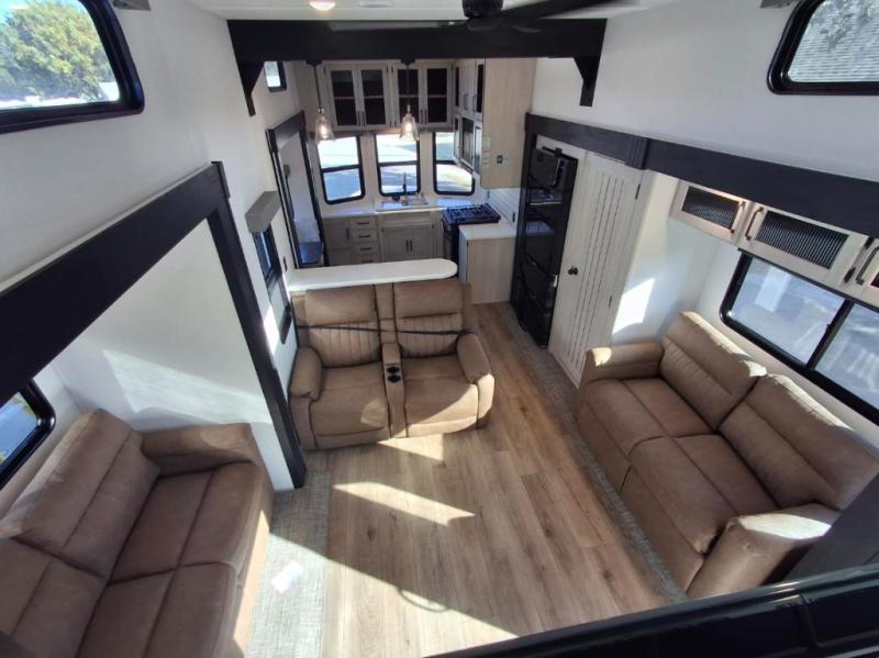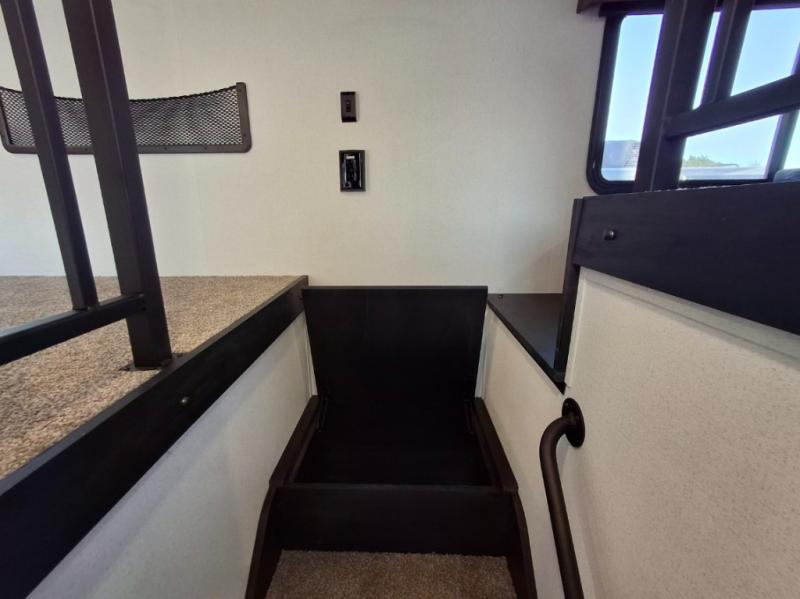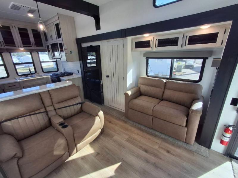 This is the perfect destination trailer for a larger group since it can sleep up to nine campers each night. The little ones will love the double loft areas with three bunk mats and storage space for their things, while you take the rear private bedroom. There is a king bed slide out here, along with a wardrobe/closet for your clothes, plus a second closet with washer and dryer prep. Everyone can meet in the middle living room to relax on the dual opposing sofas or theater seating across from the fireplace and entertainment center. Head to the front of the unit where you'll find the kitchen that includes ample counter space to prep meals, a residential style refrigerator and pantry for food storage, and a free-standing table to dine at. There is also a breakfast nook that overlooks the living area so you can visit with the cook and watch a movie at the same time!