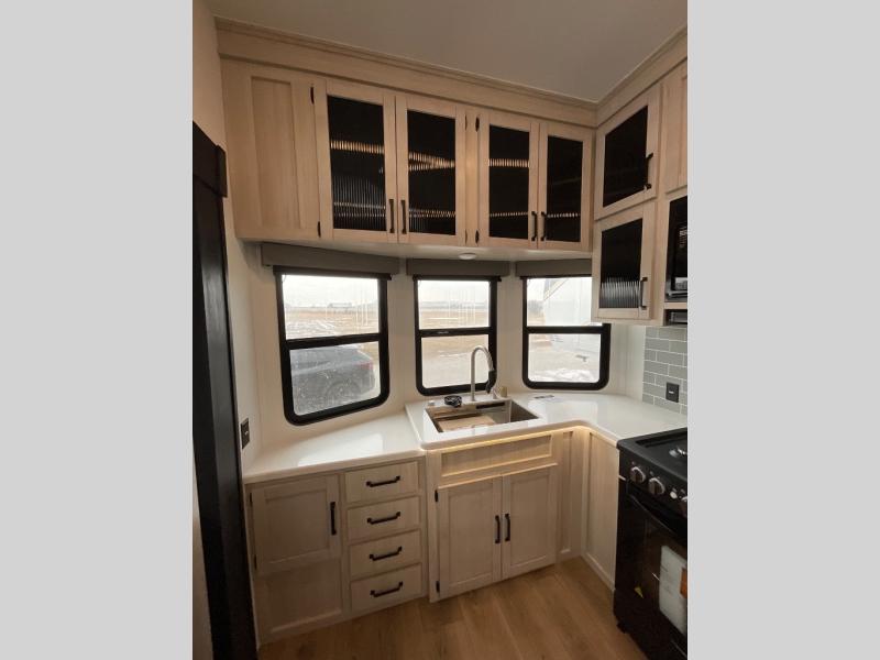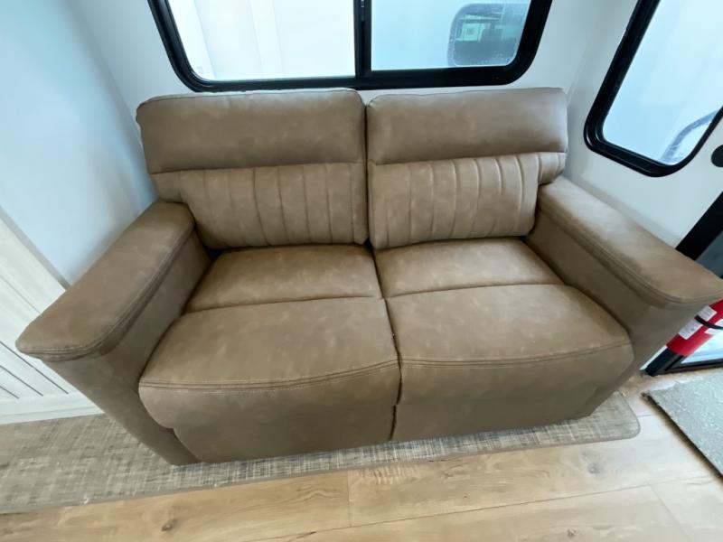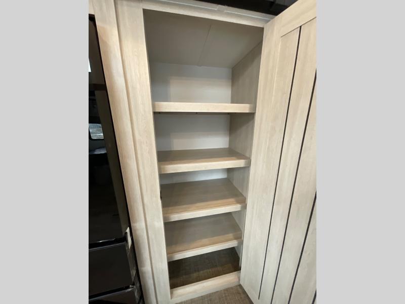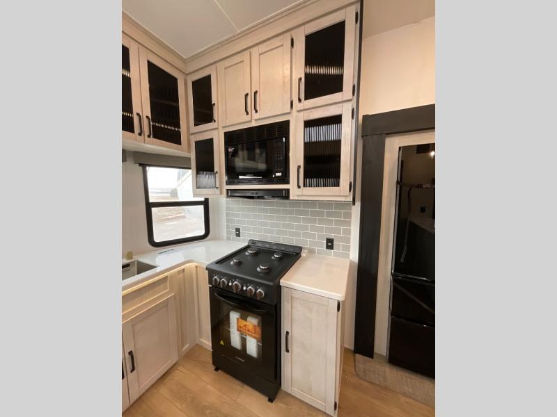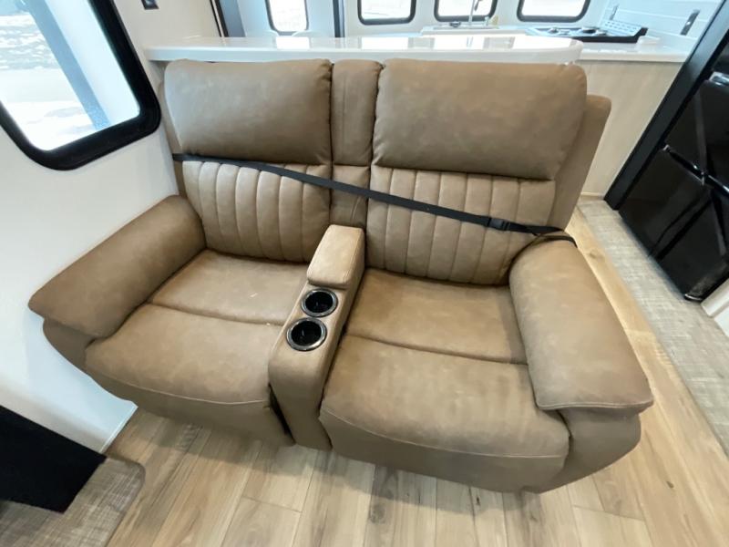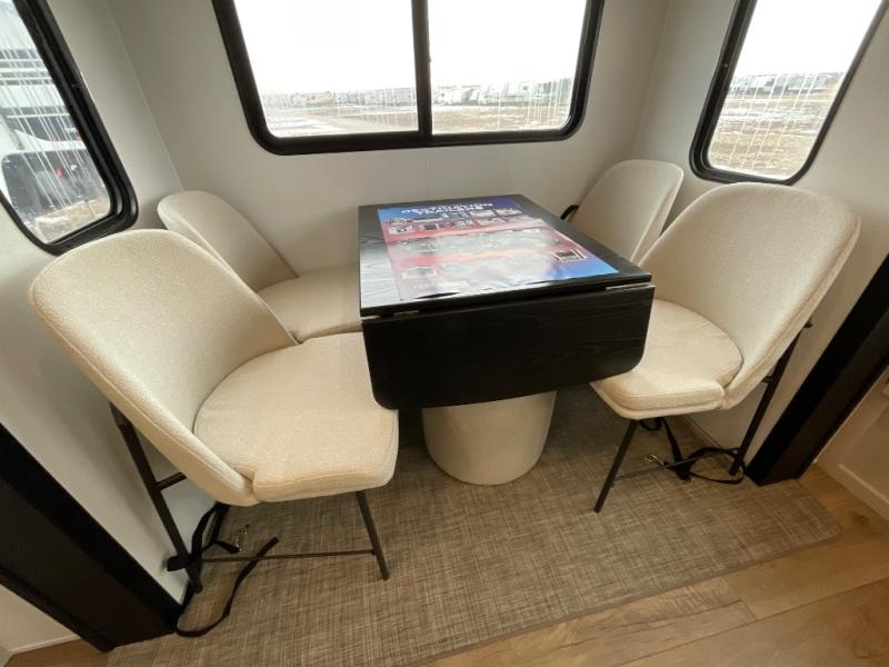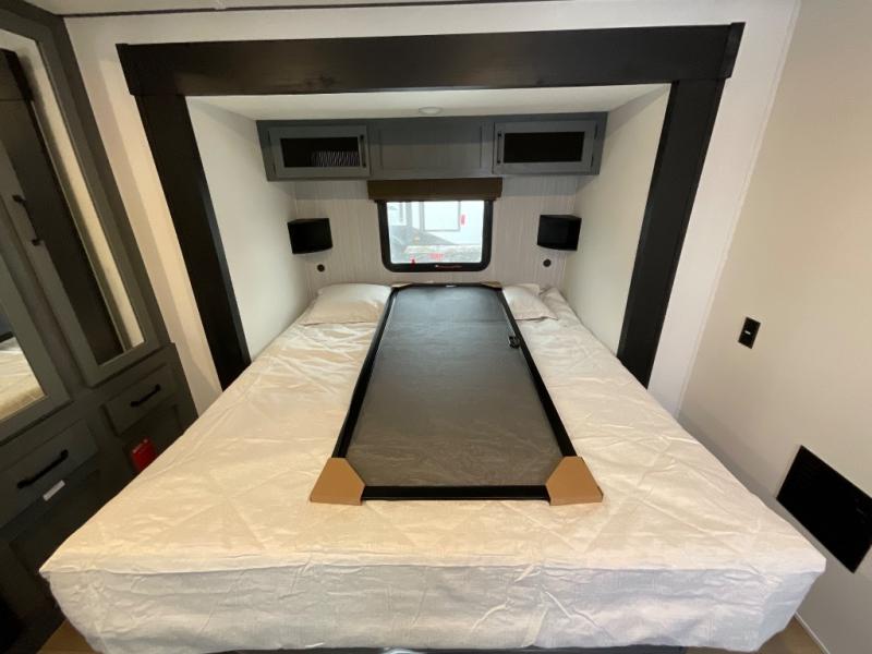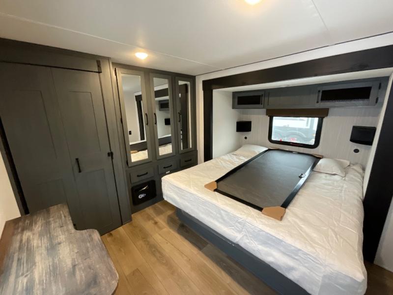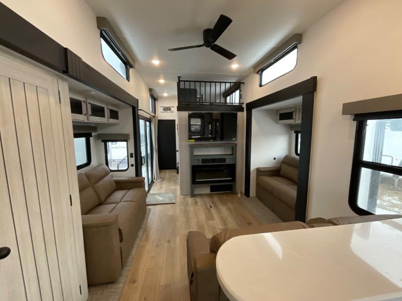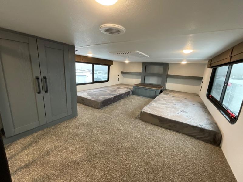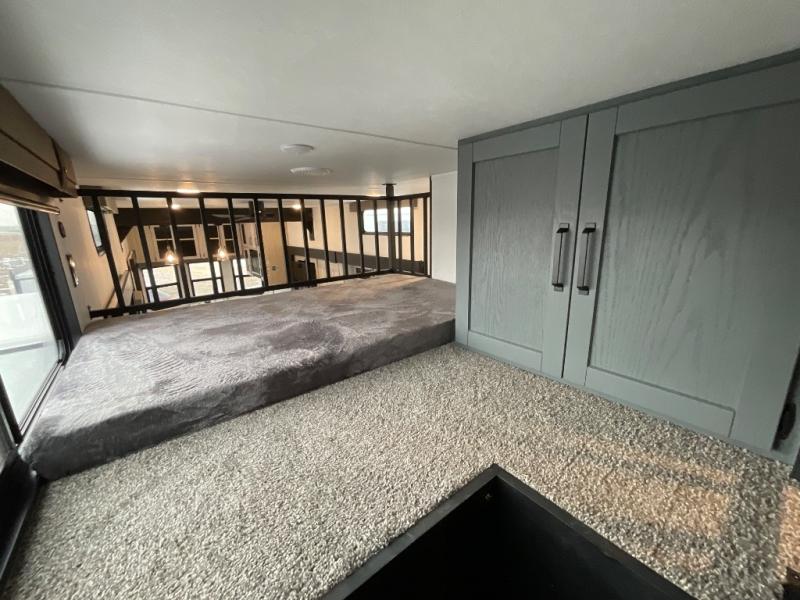 This is the perfect destination trailer for a larger group since it can sleep up to nine campers each night. The little ones will love the double loft areas with three bunk mats and storage space for their things, while you take the rear private bedroom. There is a king bed slide out here, along with a wardrobe/closet for your clothes, plus a second closet with washer and dryer prep. Everyone can meet in the middle living room to relax on the dual opposing sofas or theater seating across from the fireplace and entertainment center. Head to the front of the unit where you'll find the kitchen that includes ample counter space to prep meals, a residential style refrigerator and pantry for food storage, and a free-standing table to dine at. There is also a breakfast nook that overlooks the living area so you can visit with the cook and watch a movie at the same time!