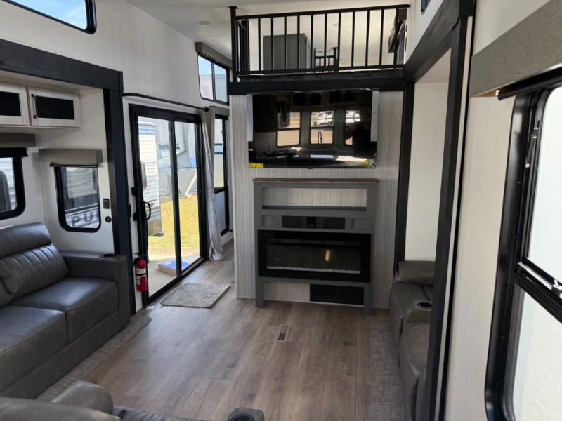 SOLID SURFACE COUNTERTOPS, 50 AMP SERVICE, 5,100 BTU COLOR CHANGING FIREPLACE, TRI-FOLD SOFA IN LIVINGROOM (N/A ON 420LFT - THEATRE SEAT IPO TRIFOLD SOFA,) TABLE & CHAIRS, OUTSIDE SHOWER, 12V CEILING FAN IN LIVING ROOM, 2 EXTERIOR SPEAKERS, 4 STABILIZER JACKS, 30LB GAS BOTTLES & COVER
