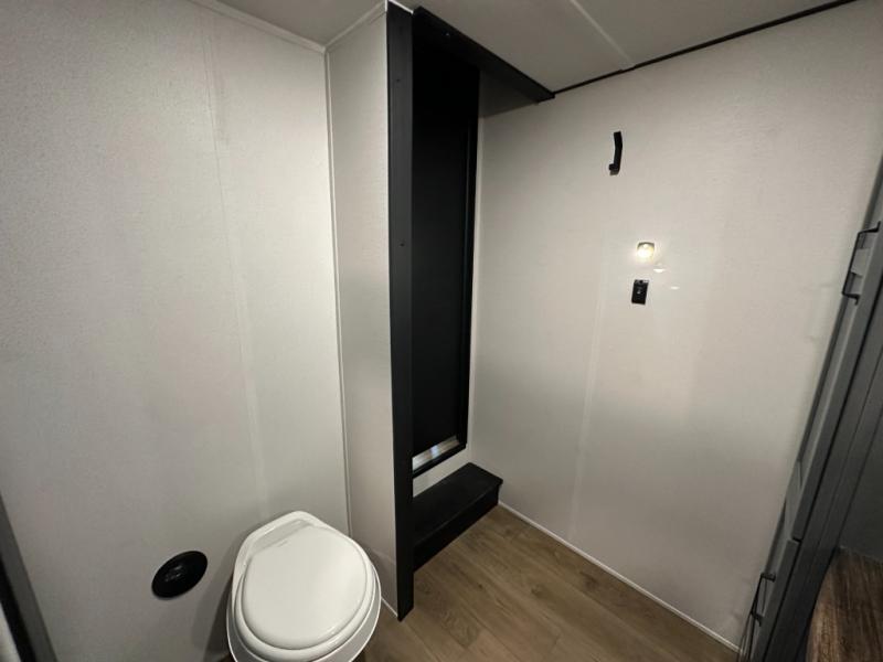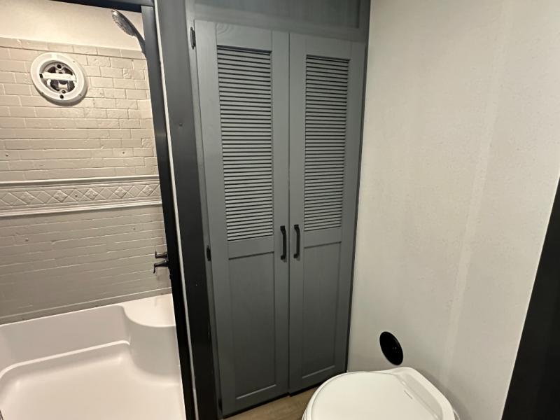 Full rear bathroom with a 32×40in shower, and closet prepped for washer/dryer underneath the second loft .
