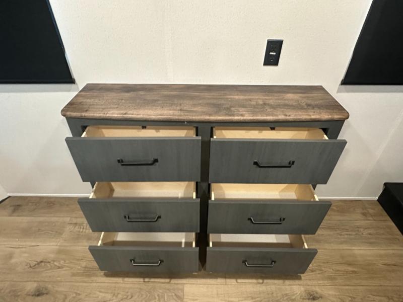 Front master bedroom with king bed slide, wardrobe, and dresser.