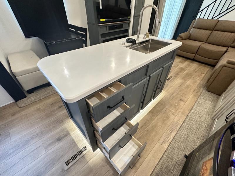 The 420LFT is a destination-style trailer measuring about 42ft10in long and 8ft wide, with three slide-outs for expanded living space .