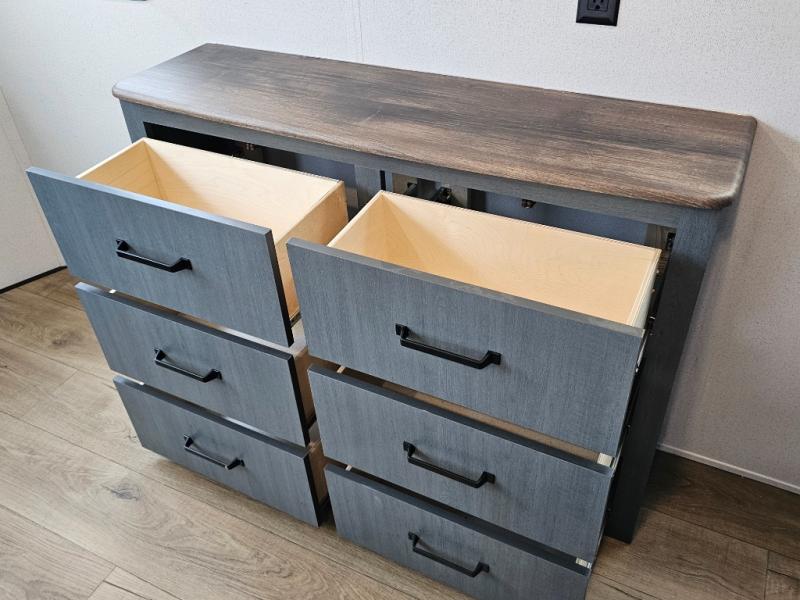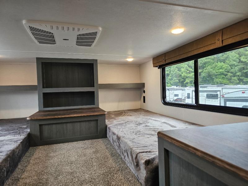 First loft (above front bedroom) with two 32" x 80" bunk mats, cubby, nightstand, counter, and cabinets