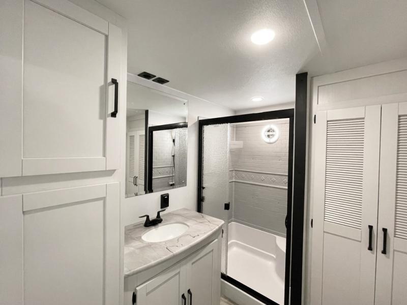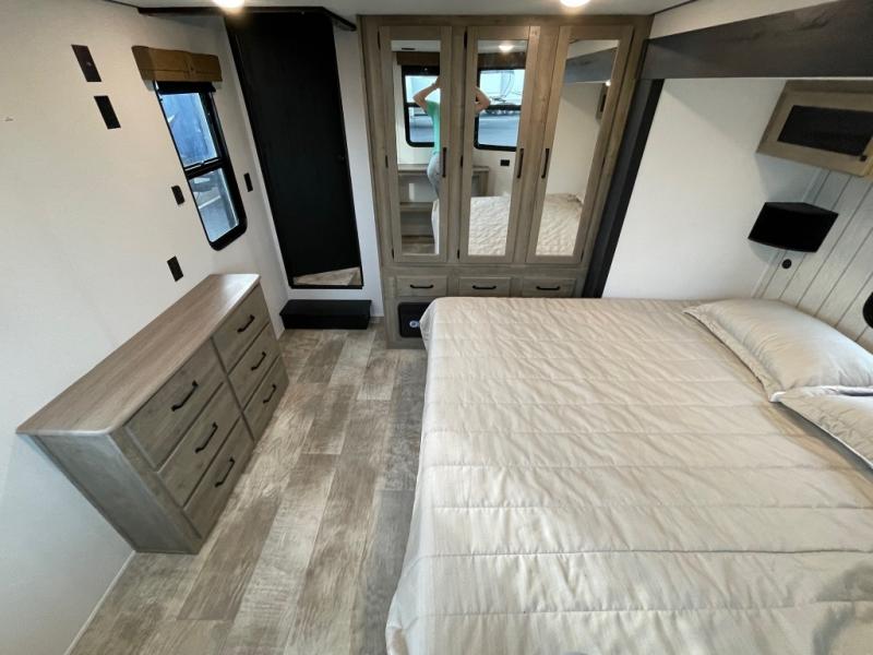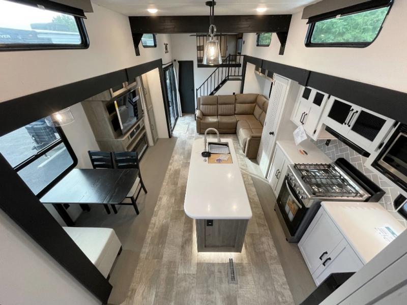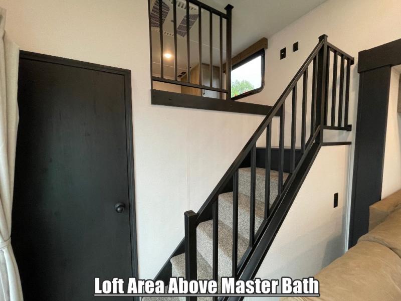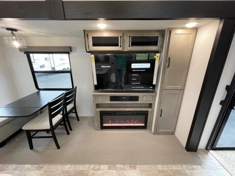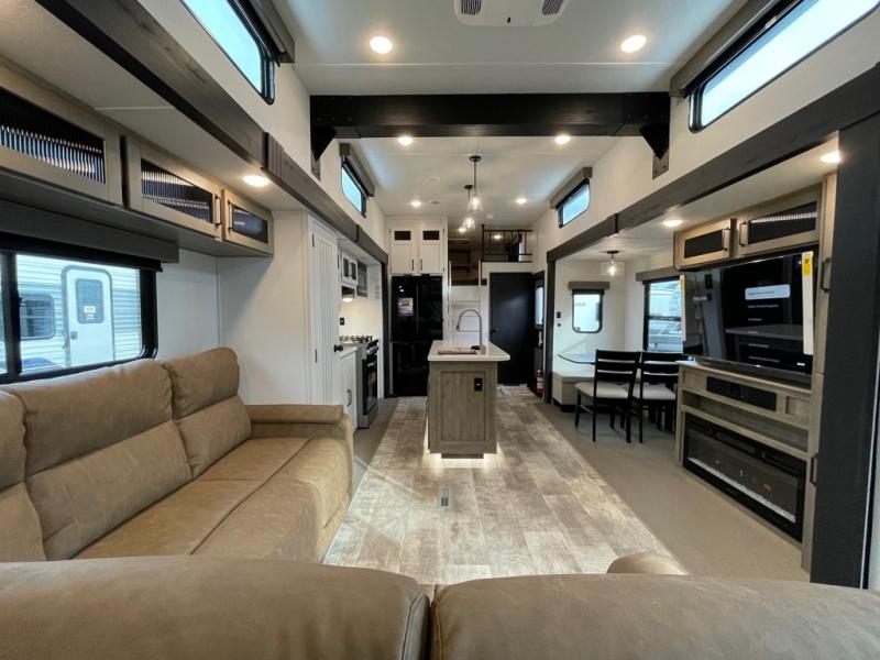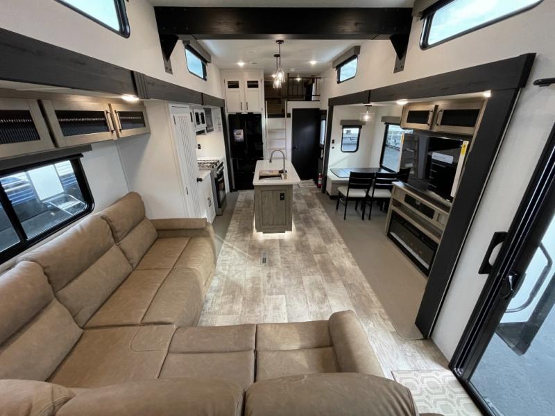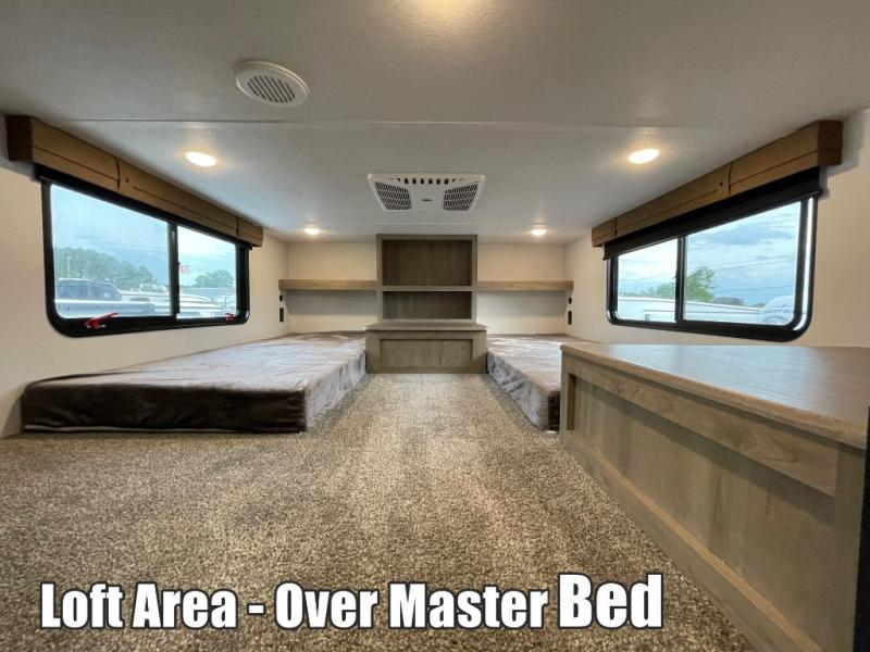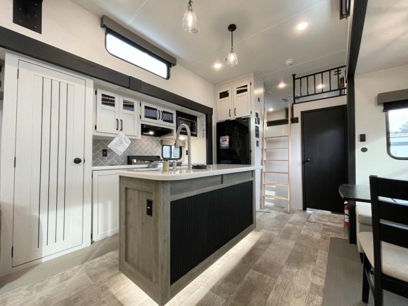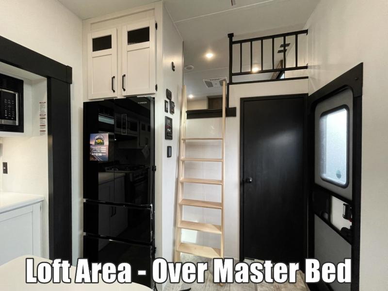 Head to your favorite spots with this destination trailer! With two entry doors, you can easily enter or exit the unit. The front private bedroom includes a king bed slide out, a wardrobe and dresser to keep your clothes organized, plus a countertop for your books or jewelry. Just outside this room is the ladder that leads to the large loft area with two 32" x 80" bunk mats, a cubby, a counter, a nightstand, and cabinets. Once you've headed back downstairs, you can relax on the L-shaped sofa across from the entertainment center with a fireplace and slide-out cabinet or the free-standing table with a bench and two seats. And the chef of your group will love the kitchen with its residential style refrigerator and pantry, kitchen island, and four burner cooktop. The full rear bathroom not only has a 32" x 40" shower with a seat to freshen up in and a closet prepped to add the optional washer and dryer, but is also below the second loft with a 32" x 80" bunk mat and closet for storage!