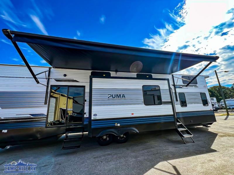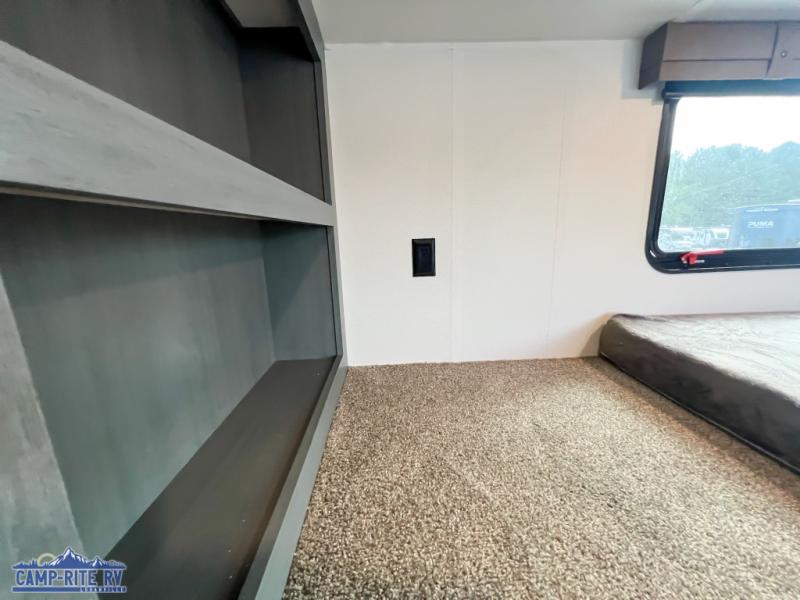 Each Puma Destination trailer by Palomino is designed to give you unforgettable getaways to the destination of your choice! The required Value Shopper Loft Package includes Congoleum designer linoleum, night roller shades, LED lighting, and a 24" stainless steel oven with a four burner stove so you can make meals just like you would at home. The tankless water heater is another feature you won't want to camp without, and there is WiFi prep, solar prep, plus optional washer and dryer prep for the option to further customize your trailer. An outside shower is included with the required Loft Package, along with two exterior speakers, solid surface countertops, four stabilizer jacks, and more!