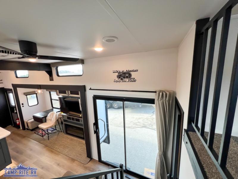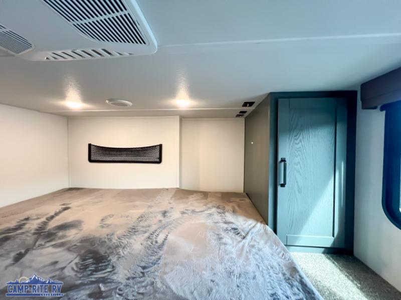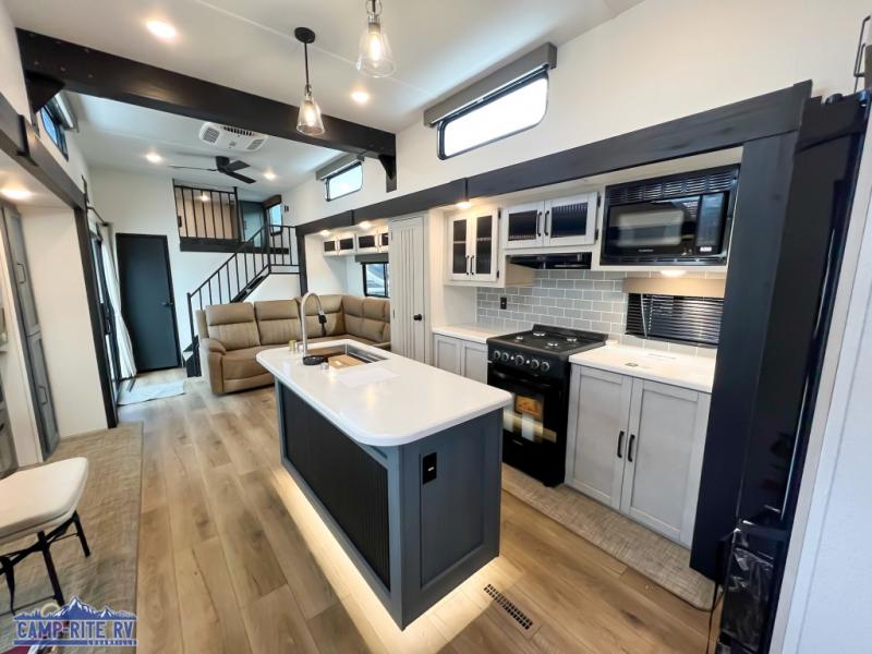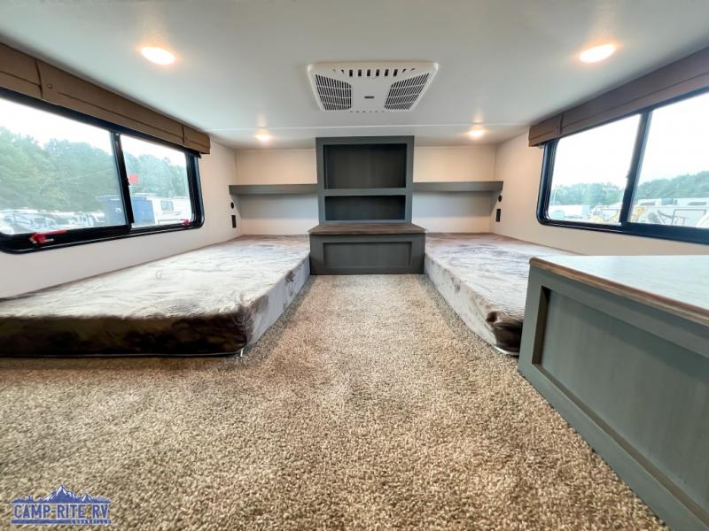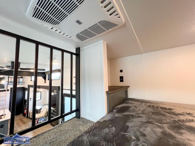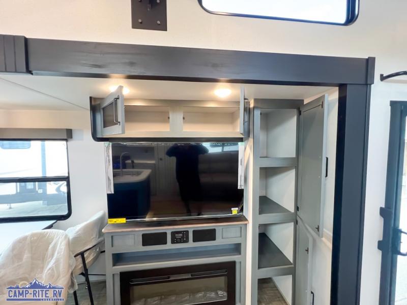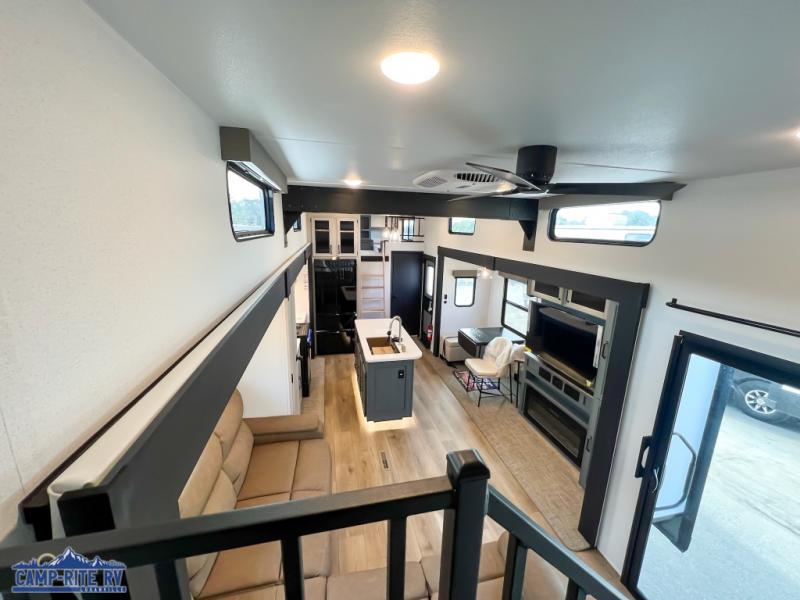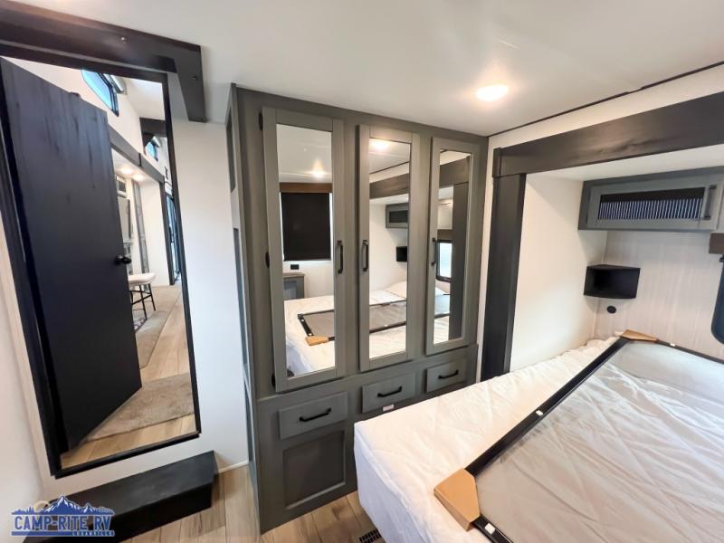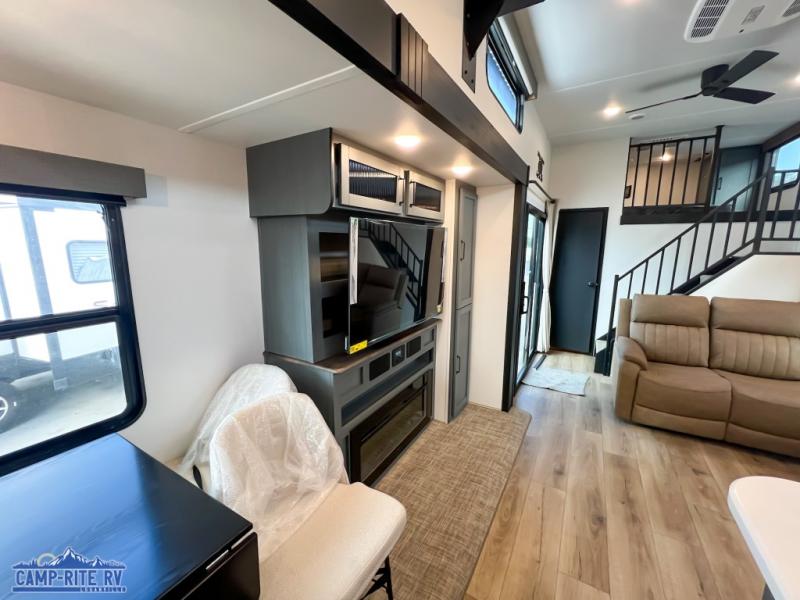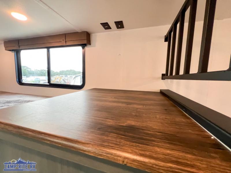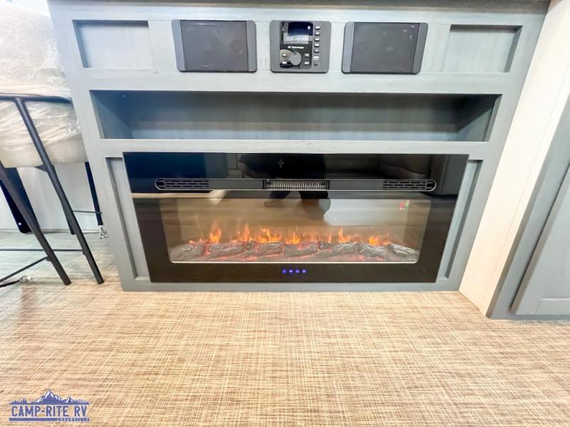 Head to your favorite spots with this destination trailer! With two entry doors, you can easily enter or exit the unit. The front private bedroom includes a king bed slide out, a wardrobe and dresser to keep your clothes organized, plus a countertop for your books or jewelry. Just outside this room is the ladder that leads to the large loft area with two 32" x 80" bunk mats, a cubby, a counter, a nightstand, and cabinets. Once you've headed back downstairs, you can relax on the L-shaped sofa across from the entertainment center with a fireplace and slide-out cabinet or the free-standing table with a bench and two seats. And the chef of your group will love the kitchen with its residential style refrigerator and pantry, kitchen island, and four burner cooktop. The full rear bathroom not only has a 32" x 40" shower with a seat to freshen up in and a closet prepped to add the optional washer and dryer, but is also below the second loft with a 32" x 80" bunk mat and closet for storage!