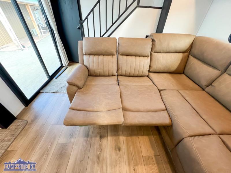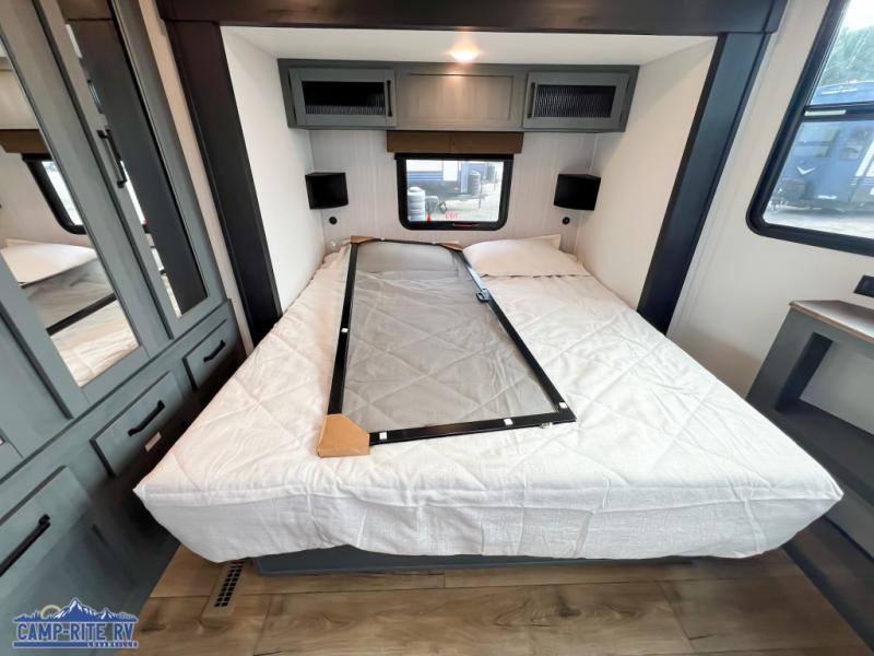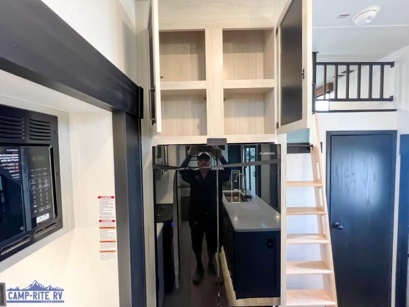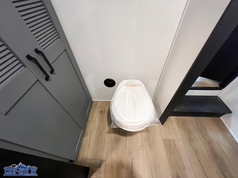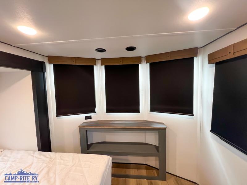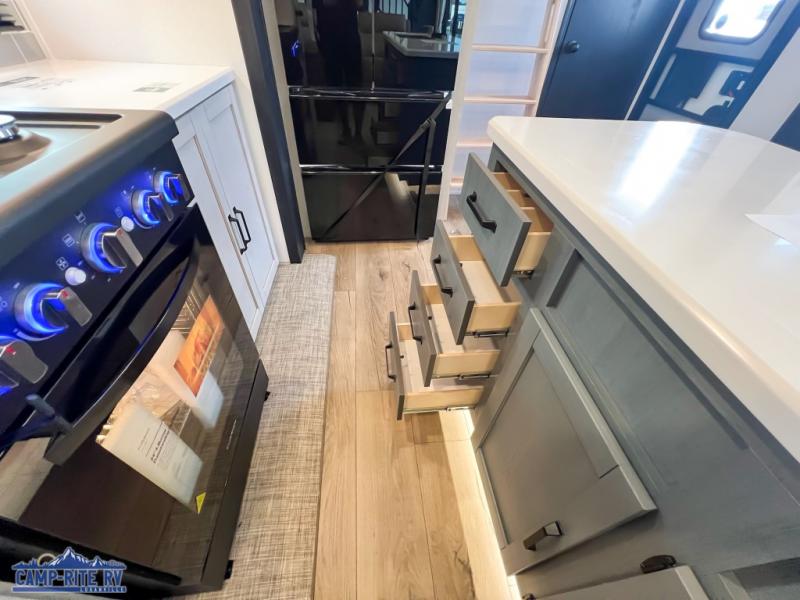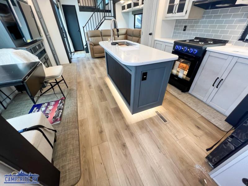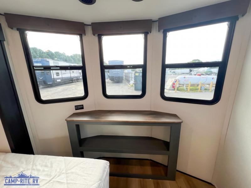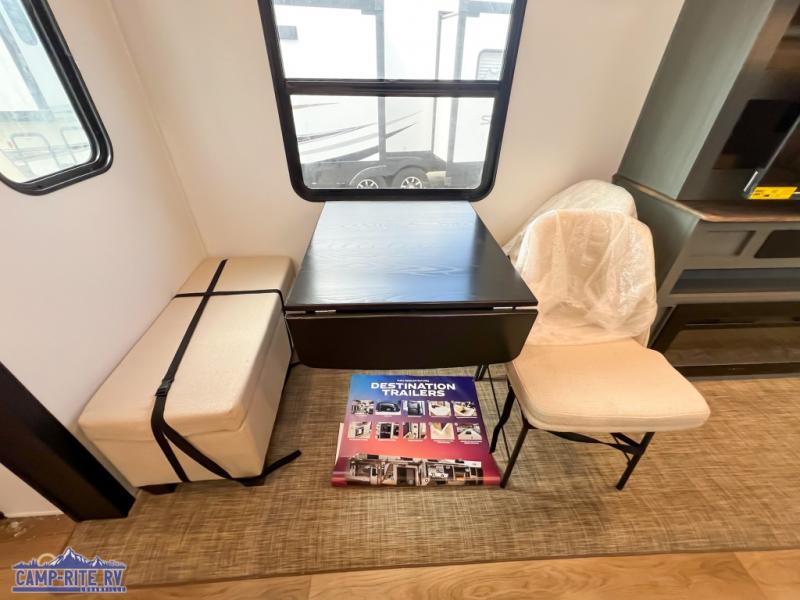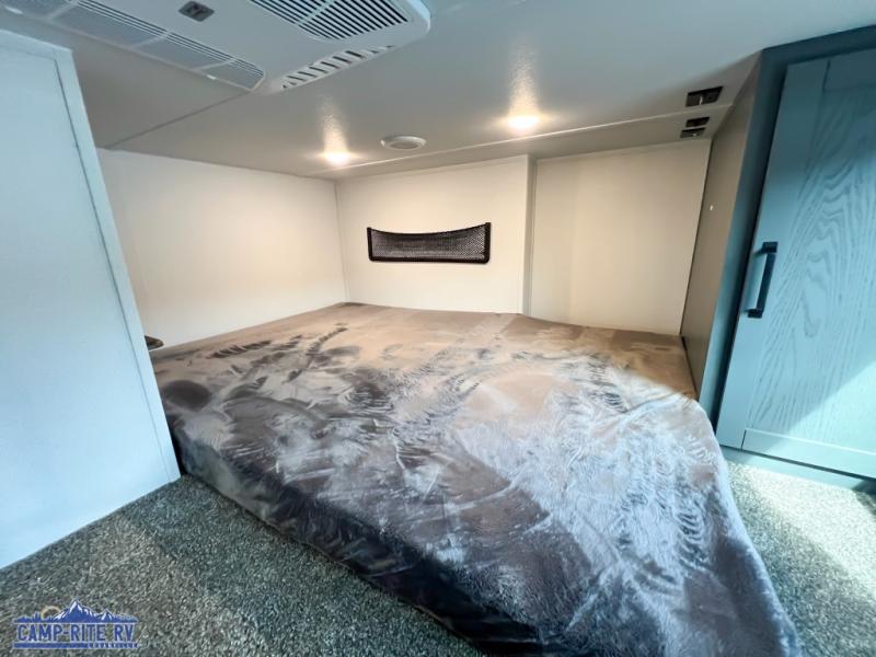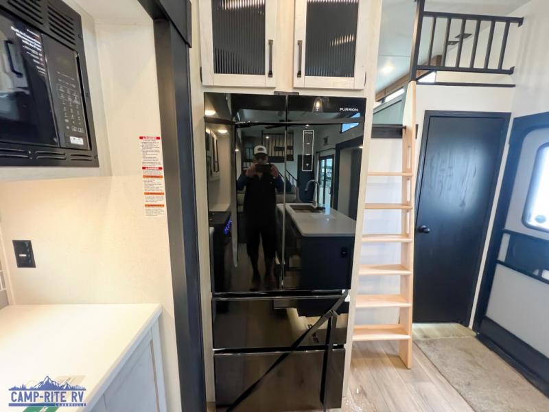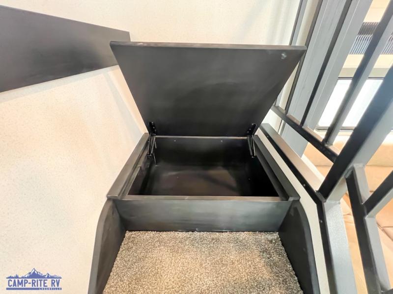 Head to your favorite spots with this destination trailer! With two entry doors, you can easily enter or exit the unit. The front private bedroom includes a king bed slide out, a wardrobe and dresser to keep your clothes organized, plus a countertop for your books or jewelry. Just outside this room is the ladder that leads to the large loft area with two 32" x 80" bunk mats, a cubby, a counter, a nightstand, and cabinets. Once you've headed back downstairs, you can relax on the L-shaped sofa across from the entertainment center with a fireplace and slide-out cabinet or the free-standing table with a bench and two seats. And the chef of your group will love the kitchen with its residential style refrigerator and pantry, kitchen island, and four burner cooktop. The full rear bathroom not only has a 32" x 40" shower with a seat to freshen up in and a closet prepped to add the optional washer and dryer, but is also below the second loft with a 32" x 80" bunk mat and closet for storage!