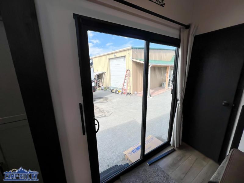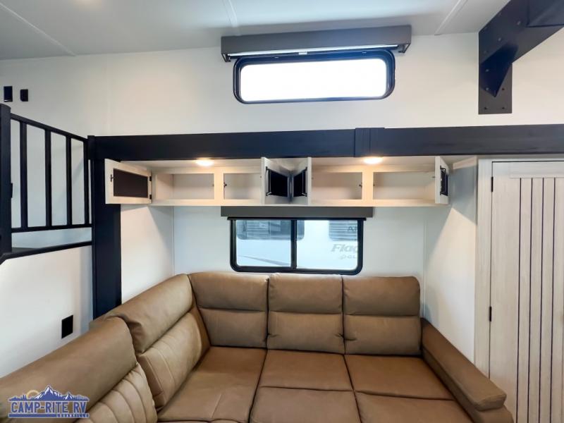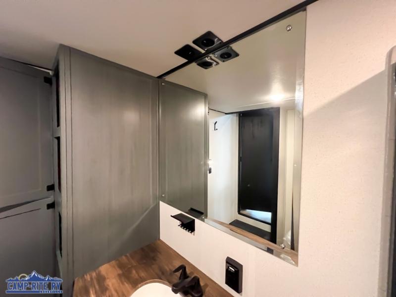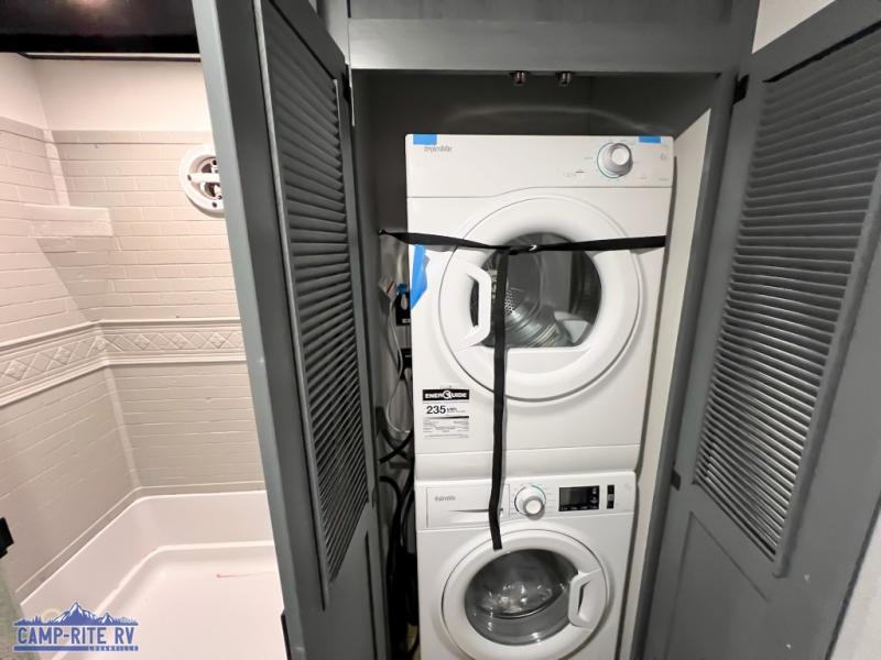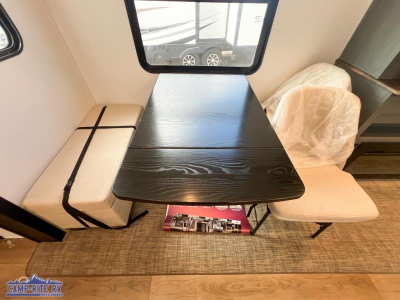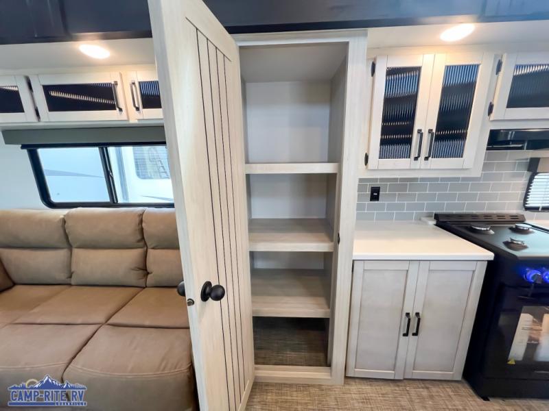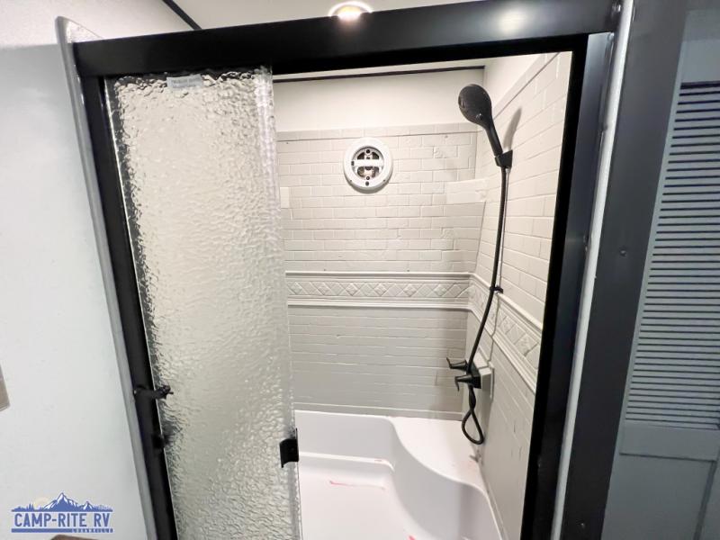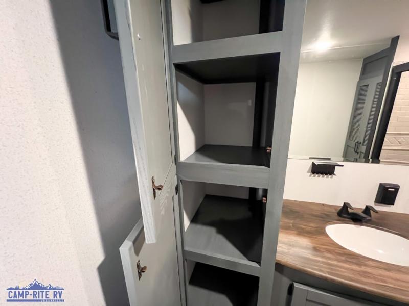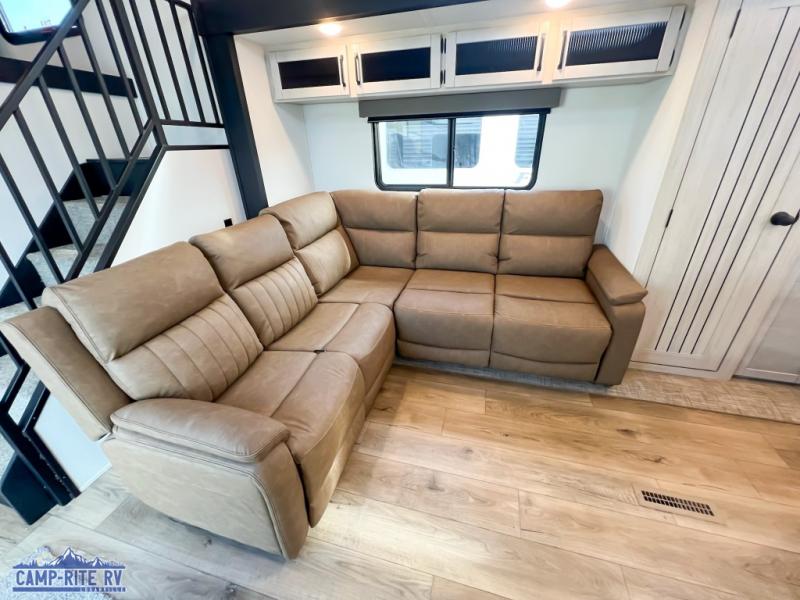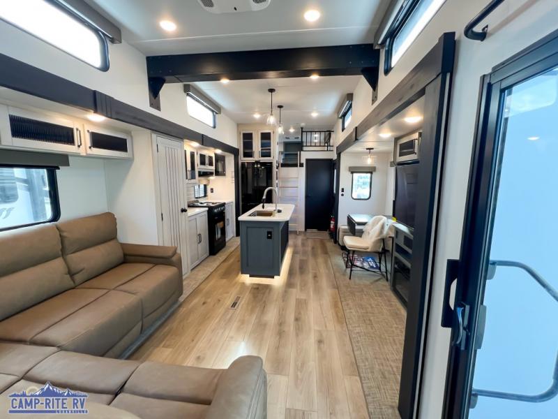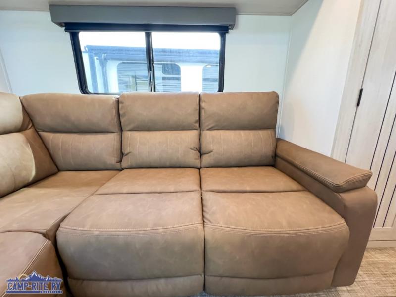 Head to your favorite spots with this destination trailer! With two entry doors, you can easily enter or exit the unit. The front private bedroom includes a king bed slide out, a wardrobe and dresser to keep your clothes organized, plus a countertop for your books or jewelry. Just outside this room is the ladder that leads to the large loft area with two 32" x 80" bunk mats, a cubby, a counter, a nightstand, and cabinets. Once you've headed back downstairs, you can relax on the L-shaped sofa across from the entertainment center with a fireplace and slide-out cabinet or the free-standing table with a bench and two seats. And the chef of your group will love the kitchen with its residential style refrigerator and pantry, kitchen island, and four burner cooktop. The full rear bathroom not only has a 32" x 40" shower with a seat to freshen up in and a closet prepped to add the optional washer and dryer, but is also below the second loft with a 32" x 80" bunk mat and closet for storage!