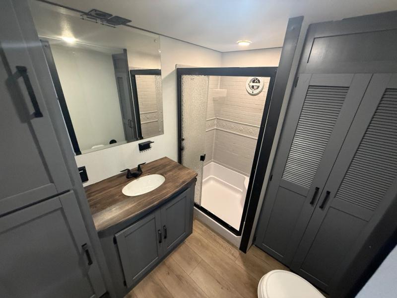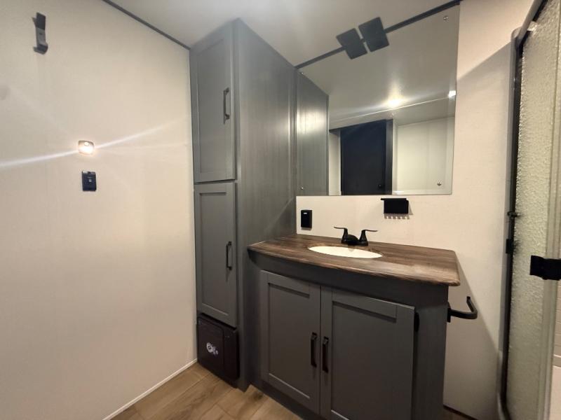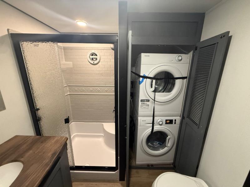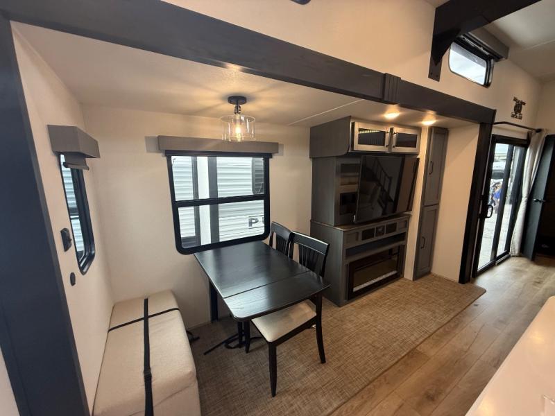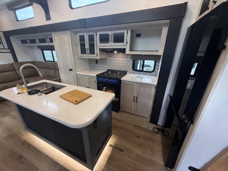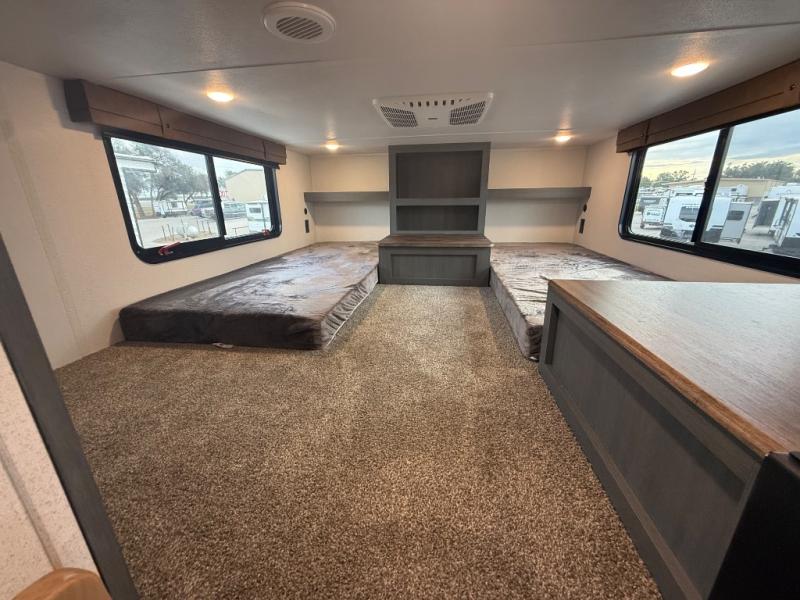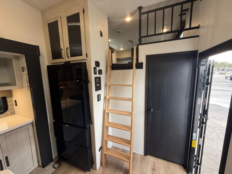 Head to your favorite spots with this destination trailer! With two entry doors, you can easily enter or exit the unit. The front private bedroom includes a king bed slide out, a wardrobe and dresser to keep your clothes organized, plus a countertop for your books or jewelry. Just outside this room is the ladder that leads to the large loft area with two 32" x 80" bunk mats, a cubby, a counter, a nightstand, and cabinets. Once you've headed back downstairs, you can relax on the L-shaped sofa across from the entertainment center with a fireplace and slide-out cabinet or the table and chairs with bench seating. And the chef of your group will love the kitchen with its residential style refrigerator and pantry, kitchen island, and four burner cooktop. The full rear bathroom not only has a 32" x 40" shower with a seat to freshen up in, and a closet with washer/dryer prep, but is also below the second loft with a 32" x 80" bunk mat and closet for storage!