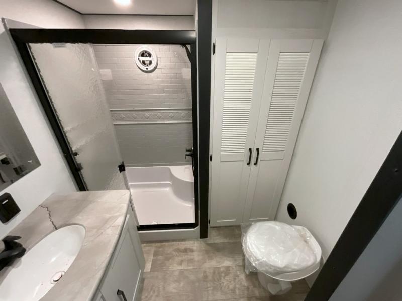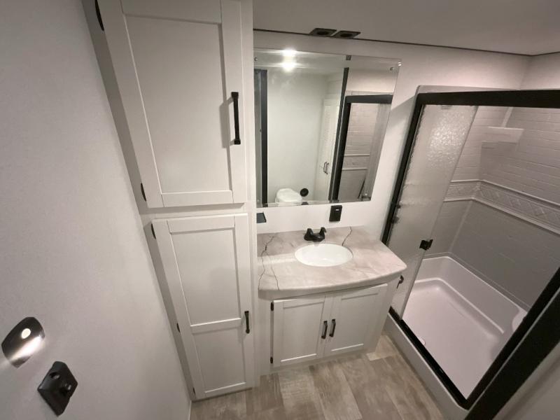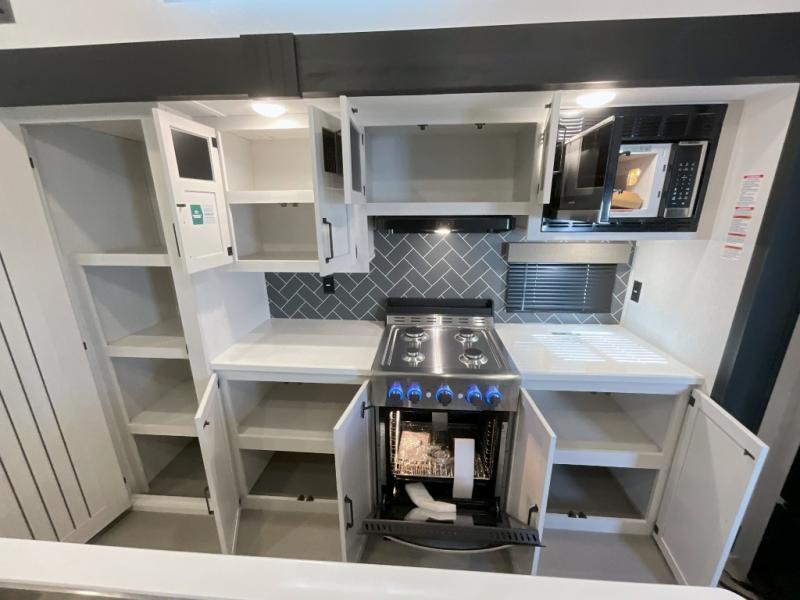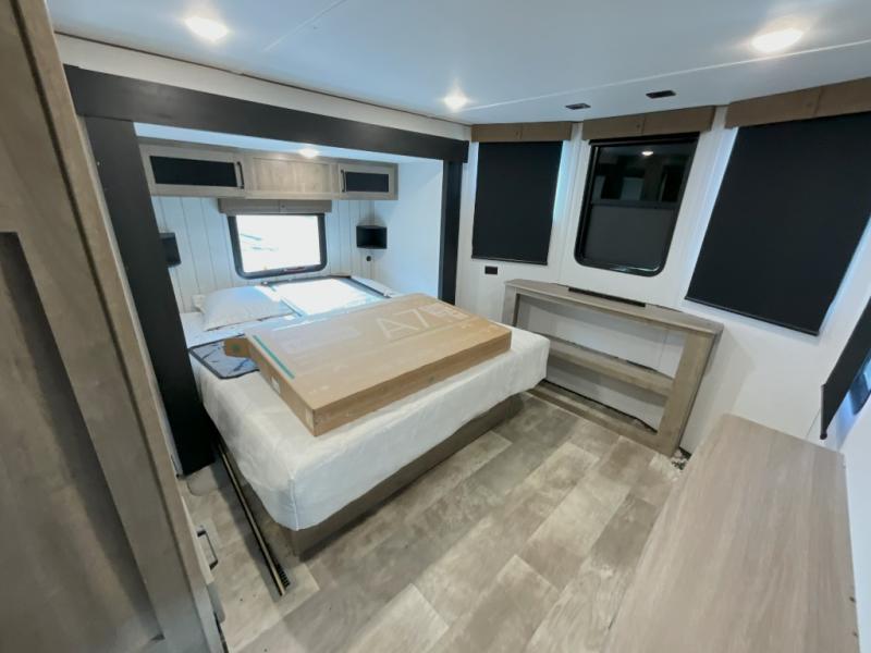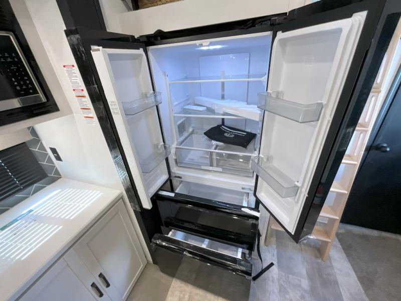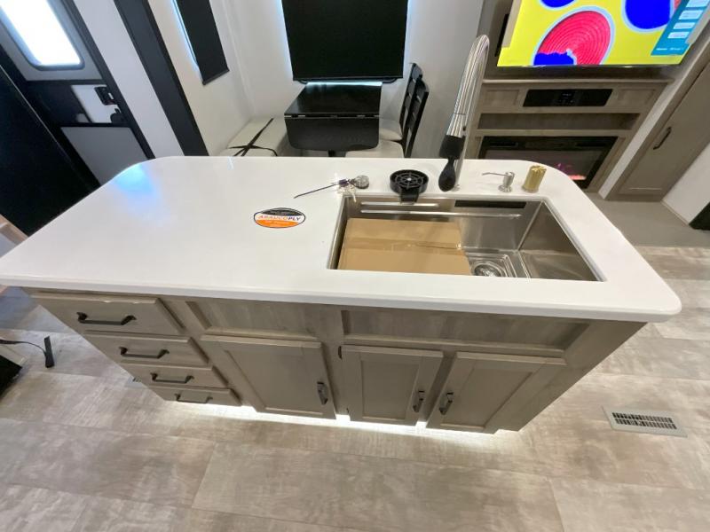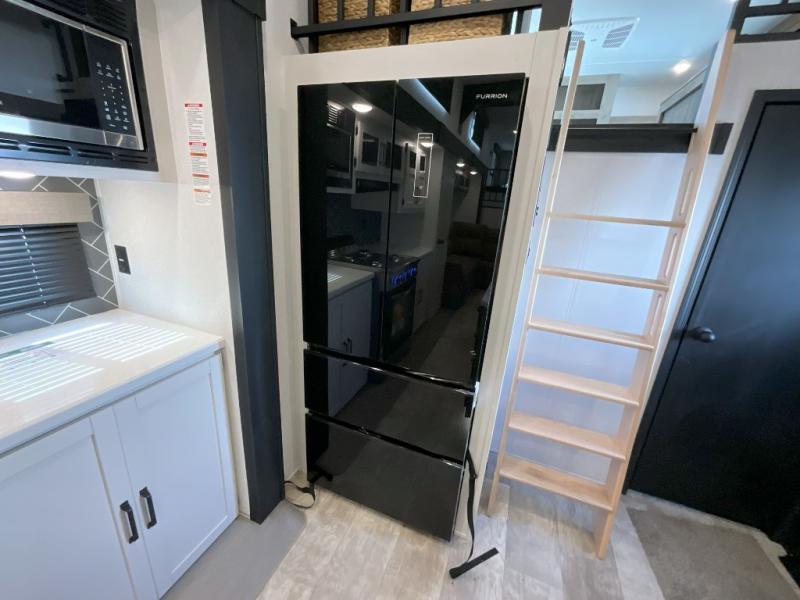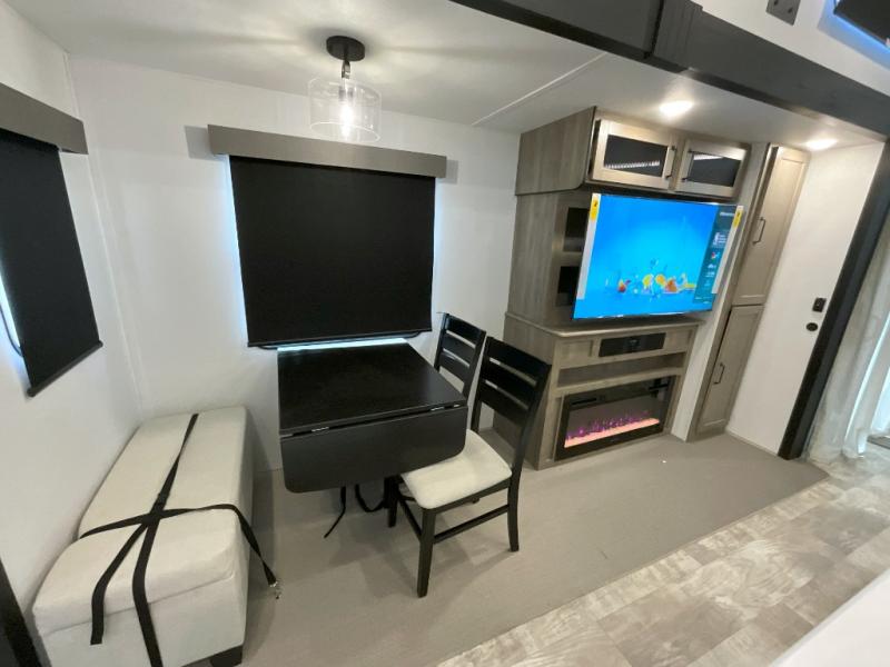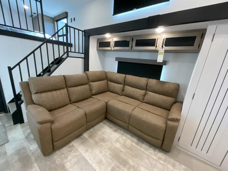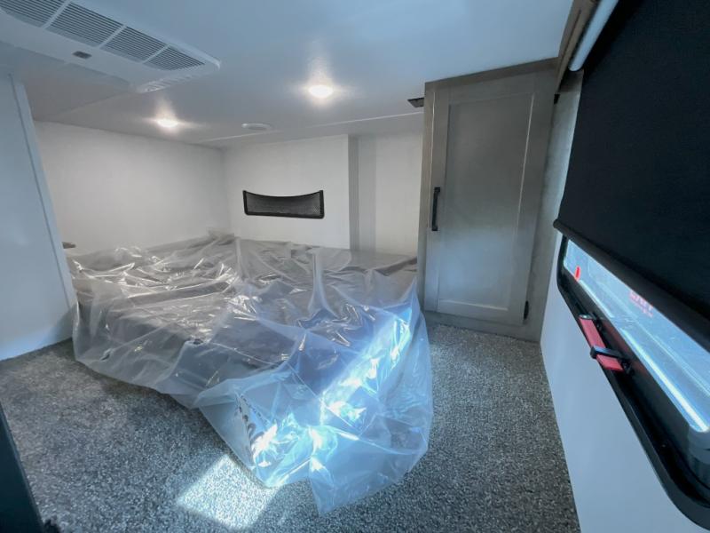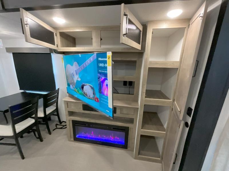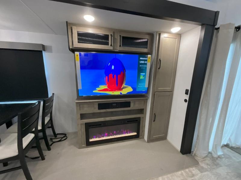 Head to your favorite spots with this destination trailer! With two entry doors, you can easily enter or exit the unit. The front private bedroom includes a king bed slide out, a wardrobe and dresser to keep your clothes organized, plus a countertop for your books or jewelry. Just outside this room is the ladder that leads to the large loft area with two 32" x 80" bunk mats, a cubby, a counter, a nightstand, and cabinets. Once you've headed back downstairs, you can relax on the L-shaped sofa across from the entertainment center with a fireplace and slide-out cabinet or the table and chairs with bench seating. And the chef of your group will love the kitchen with its residential style refrigerator and pantry, kitchen island, and four burner cooktop. The full rear bathroom not only has a 32" x 40" shower with a seat to freshen up in, and a closet with washer/dryer prep, but is also below the second loft with a 32" x 80" bunk mat and closet for storage!