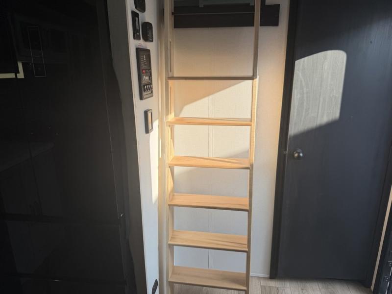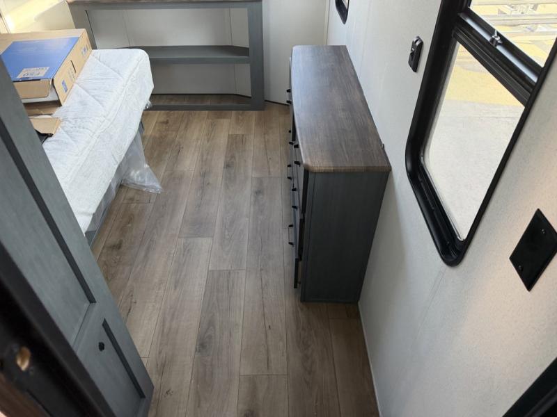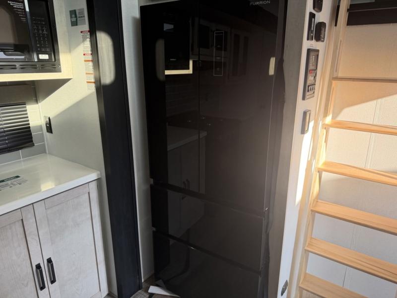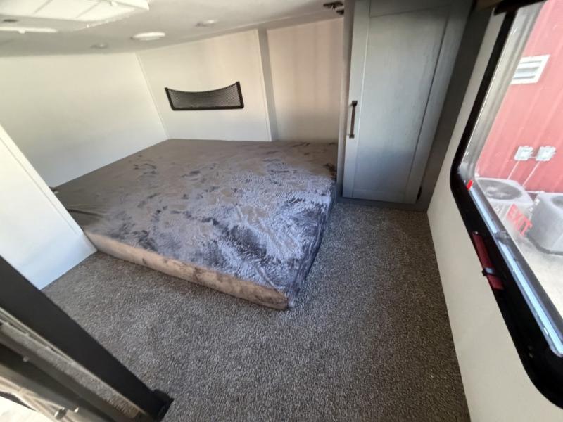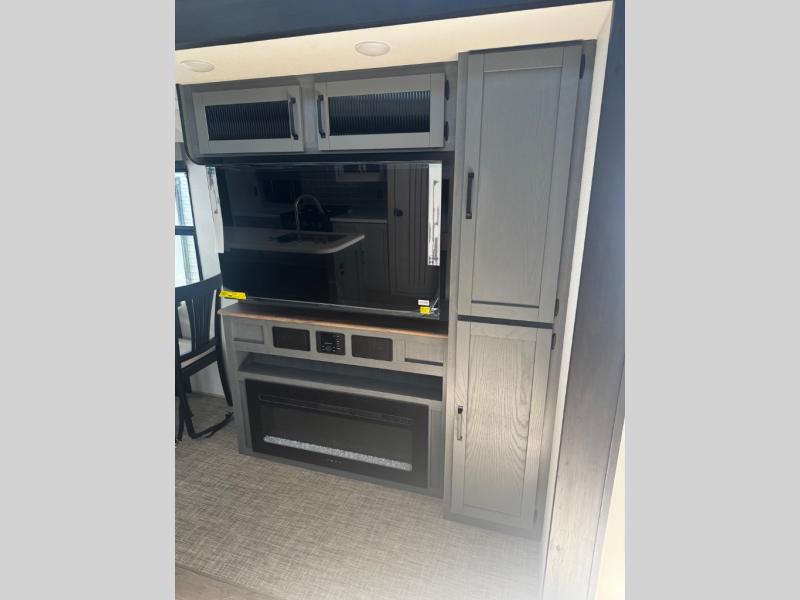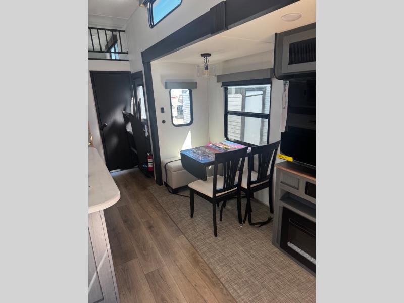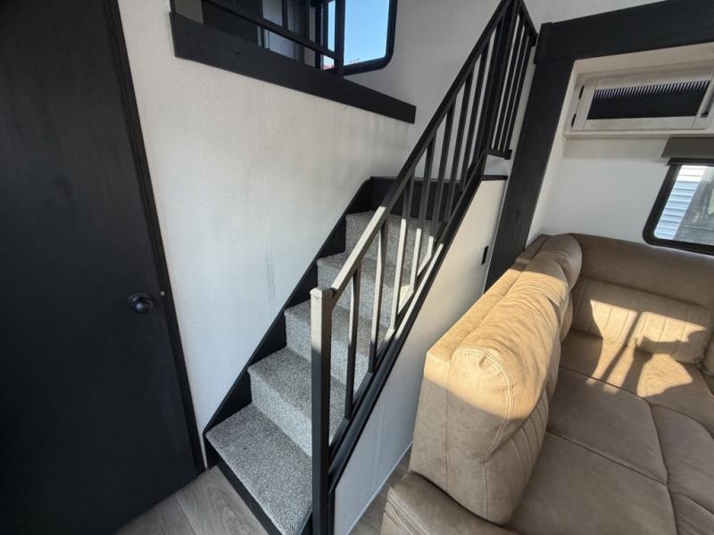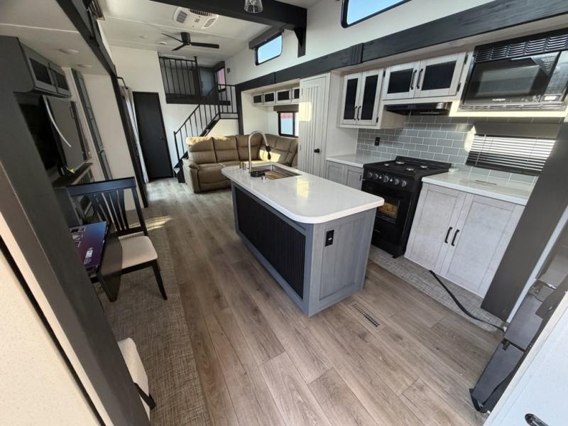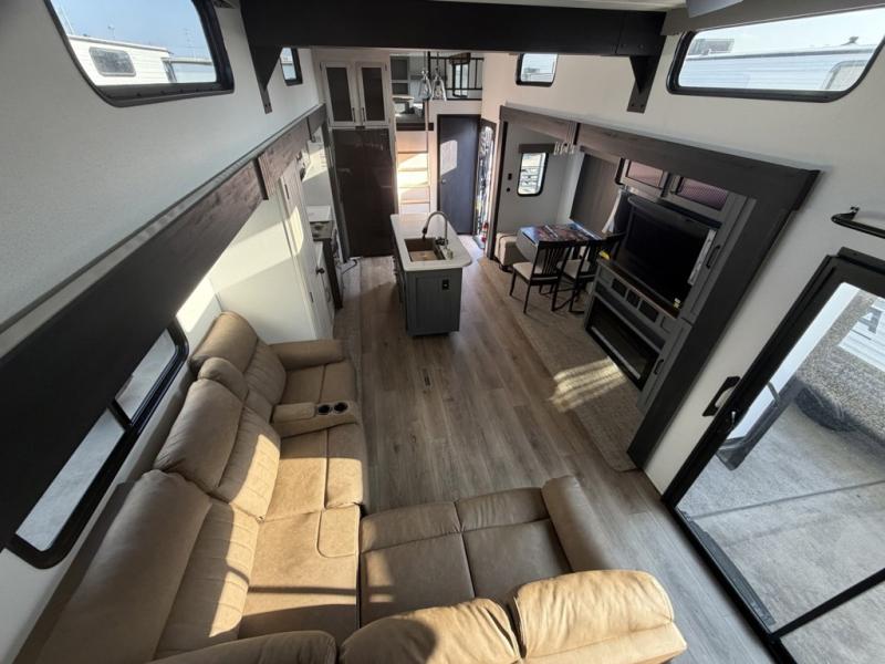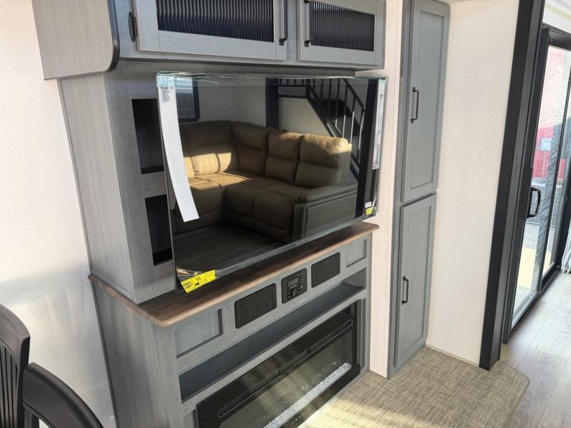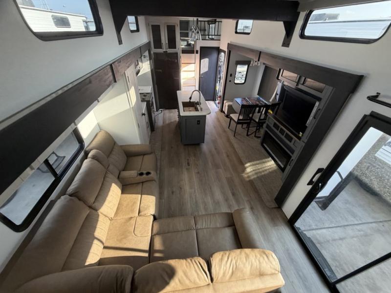 Head to your favorite spots with this destination trailer! With two entry doors, you can easily enter or exit the unit. The front private bedroom includes a king bed slide out, a wardrobe and dresser to keep your clothes organized, plus a countertop for your books or jewelry. Just outside this room is the ladder that leads to the large loft area with two 32" x 80" bunk mats, a cubby, a counter, a nightstand, and cabinets. Once you've headed back downstairs, you can relax on the L-shaped sofa across from the entertainment center with a fireplace and slide-out cabinet or the table and chairs with bench seating. And the chef of your group will love the kitchen with its residential style refrigerator and pantry, kitchen island, and four burner cooktop. The full rear bathroom not only has a 32" x 40" shower with a seat to freshen up in, and a closet with washer/dryer prep, but is also below the second loft with a 32" x 80" bunk mat and closet for storage!
