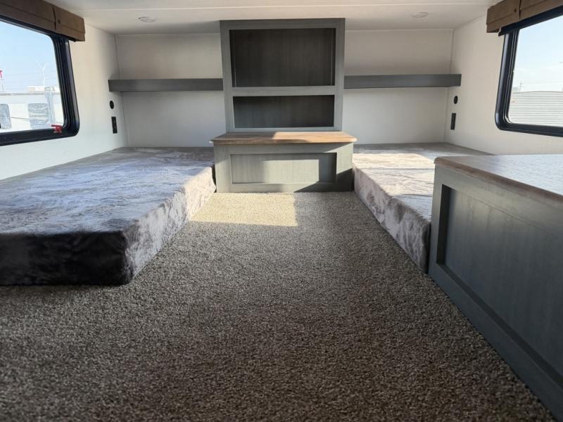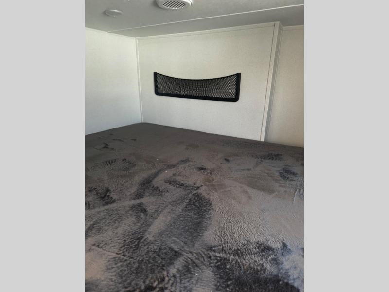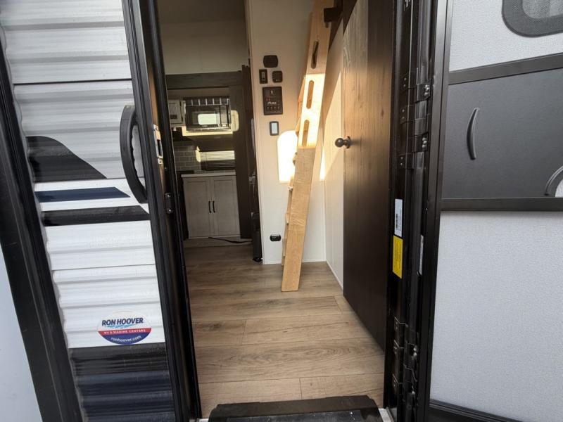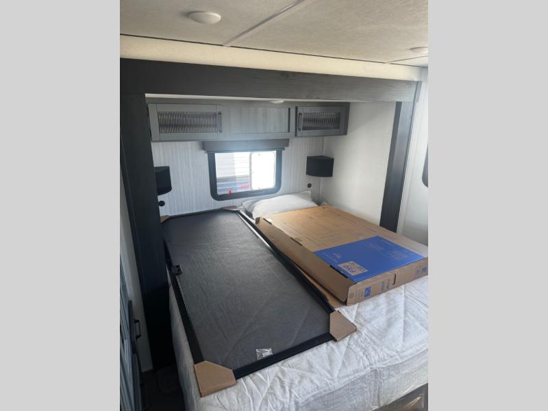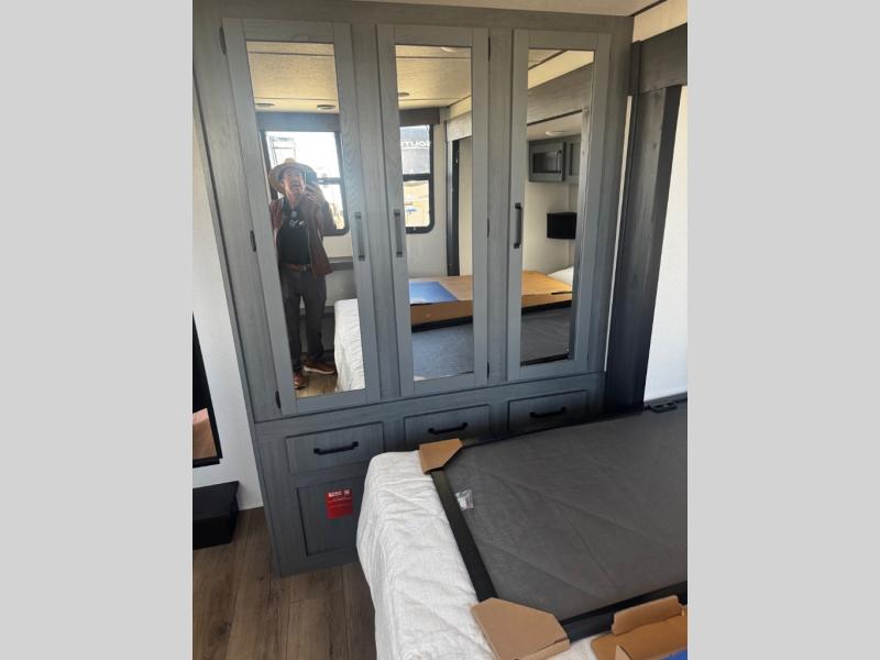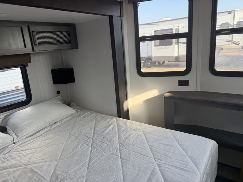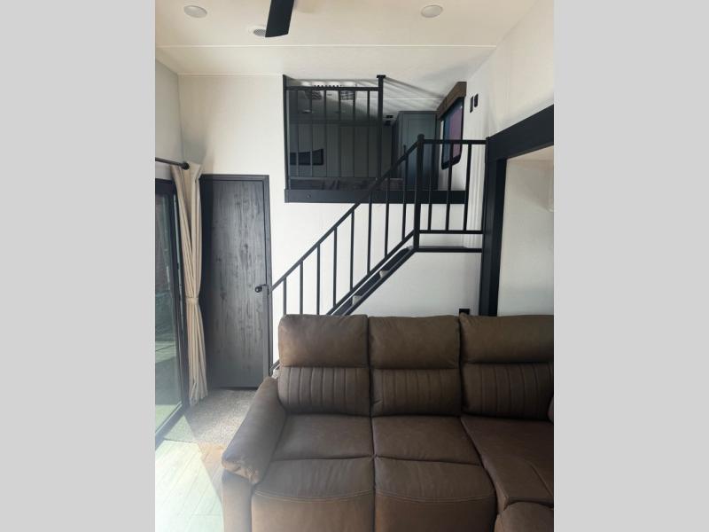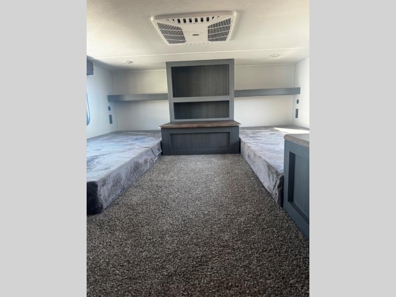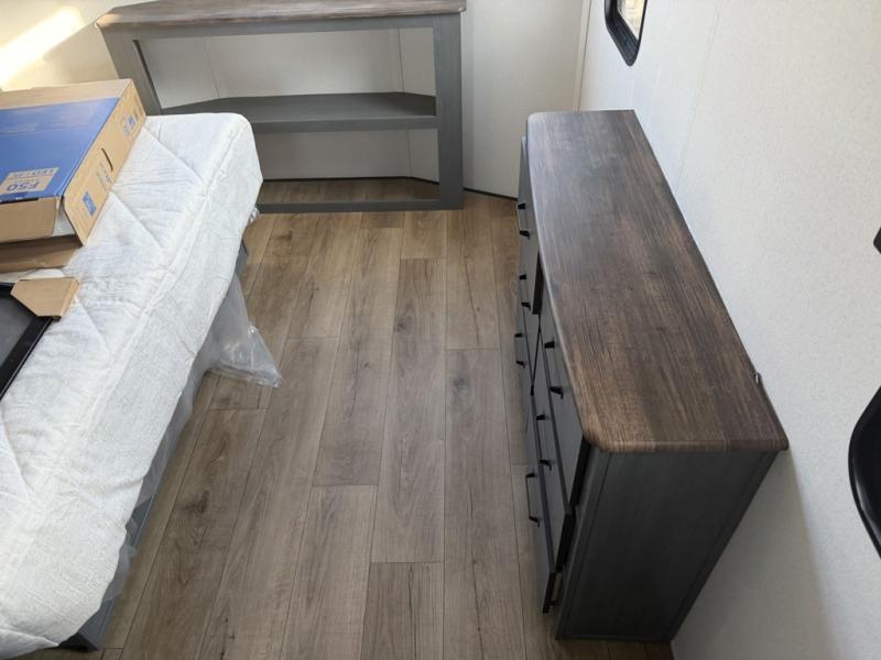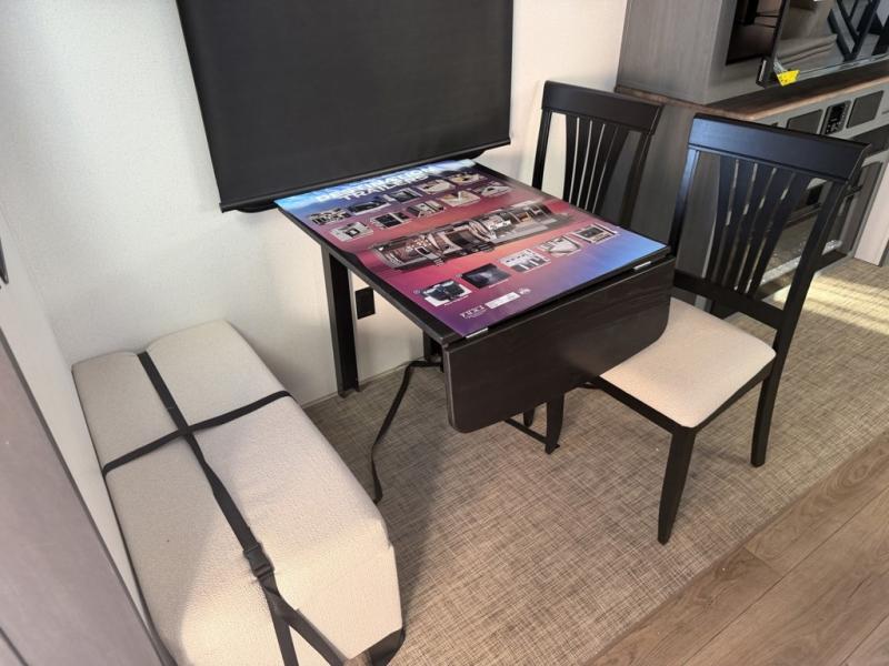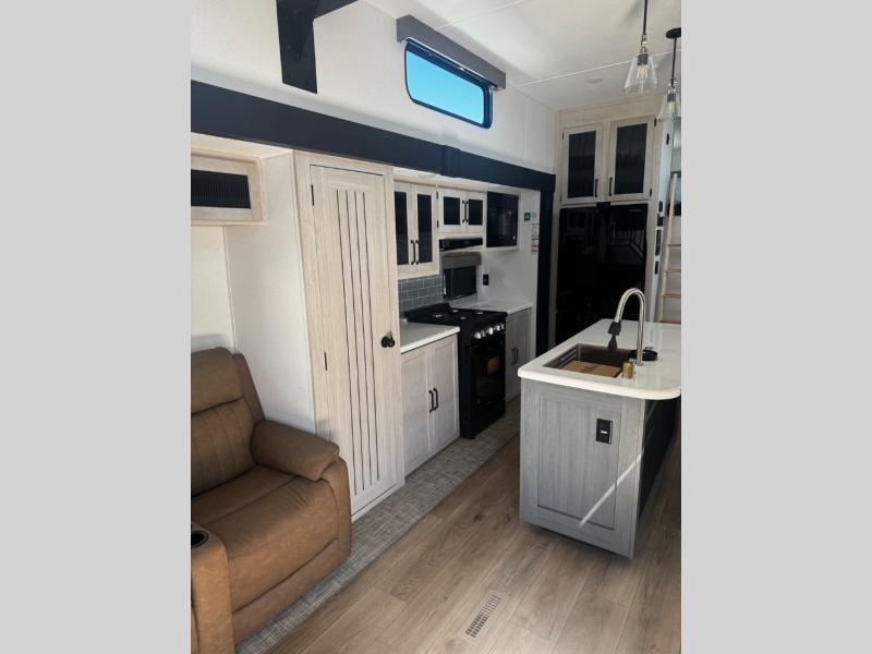 Head to your favorite spots with this destination trailer! With two entry doors, you can easily enter or exit the unit. The front private bedroom includes a king bed slide out, a wardrobe and dresser to keep your clothes organized, plus a countertop for your books or jewelry. Just outside this room is the ladder that leads to the large loft area with two 32" x 80" bunk mats, a cubby, a counter, a nightstand, and cabinets. Once you've headed back downstairs, you can relax on the L-shaped sofa across from the entertainment center with a fireplace and slide-out cabinet or the table and chairs with bench seating. And the chef of your group will love the kitchen with its residential style refrigerator and pantry, kitchen island, and four burner cooktop. The full rear bathroom not only has a 32" x 40" shower with a seat to freshen up in, and a closet with washer/dryer prep, but is also below the second loft with a 32" x 80" bunk mat and closet for storage!