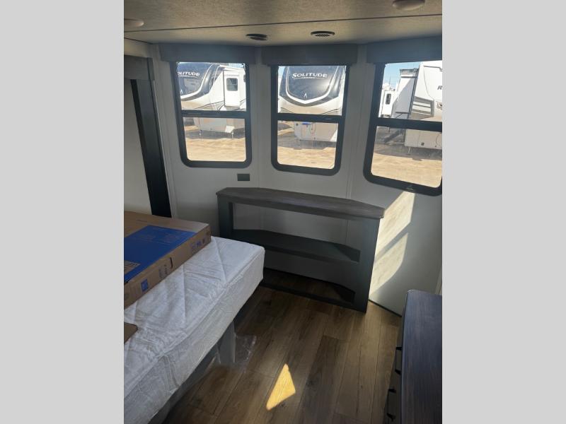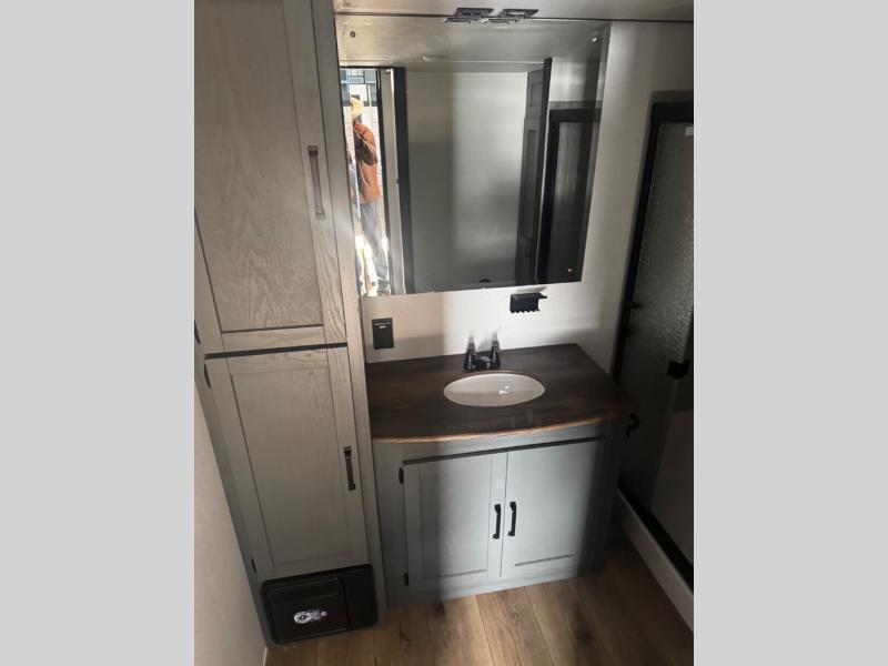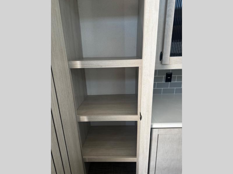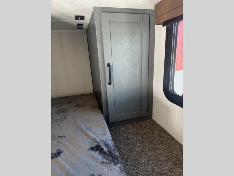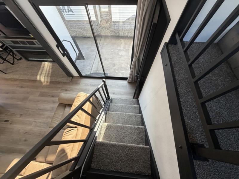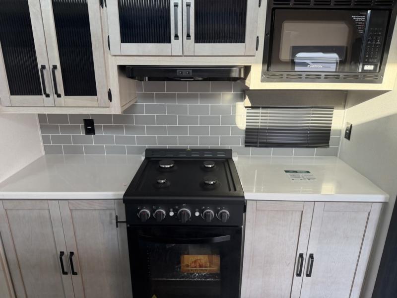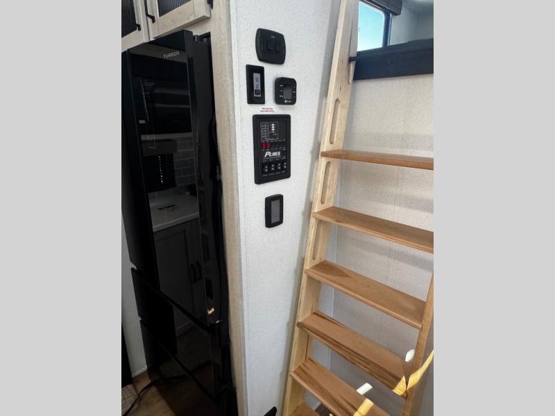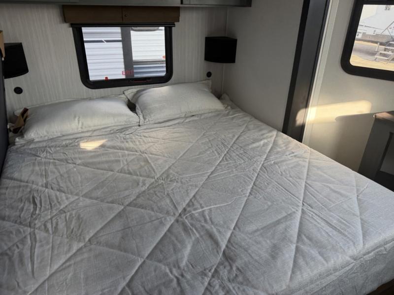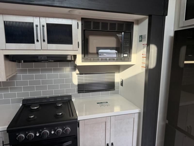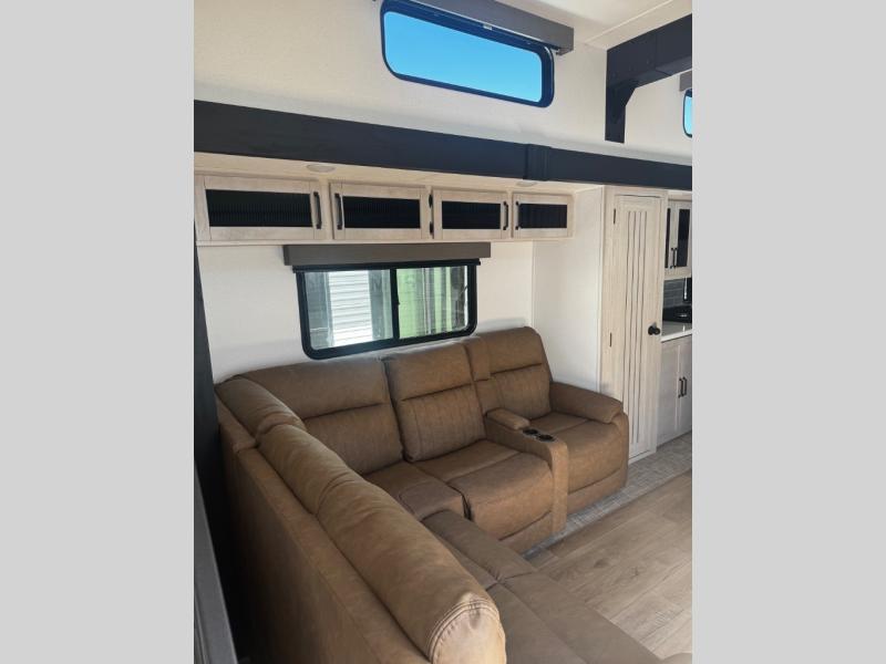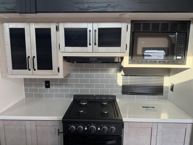 Head to your favorite spots with this destination trailer! With two entry doors, you can easily enter or exit the unit. The front private bedroom includes a king bed slide out, a wardrobe and dresser to keep your clothes organized, plus a countertop for your books or jewelry. Just outside this room is the ladder that leads to the large loft area with two 32" x 80" bunk mats, a cubby, a counter, a nightstand, and cabinets. Once you've headed back downstairs, you can relax on the L-shaped sofa across from the entertainment center with a fireplace and slide-out cabinet or the table and chairs with bench seating. And the chef of your group will love the kitchen with its residential style refrigerator and pantry, kitchen island, and four burner cooktop. The full rear bathroom not only has a 32" x 40" shower with a seat to freshen up in, and a closet with washer/dryer prep, but is also below the second loft with a 32" x 80" bunk mat and closet for storage!