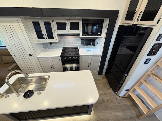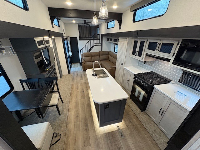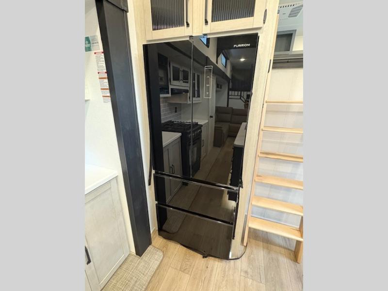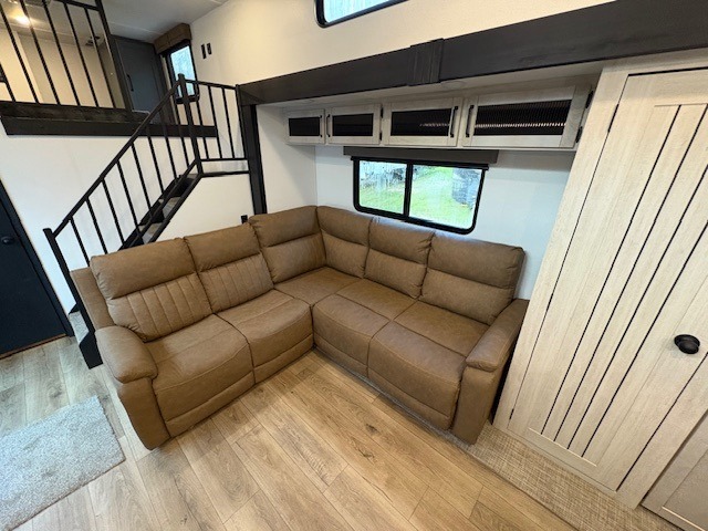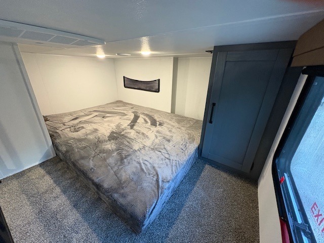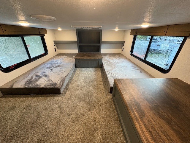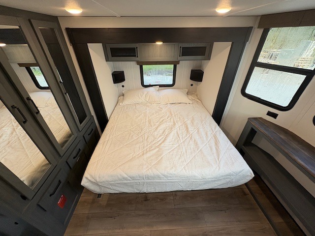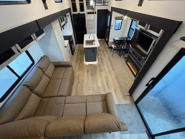 Head to your favorite spots with this destination trailer! With two entry doors, you can easily enter or exit the unit. The front private bedroom includes a king bed slide out, a wardrobe and dresser to keep your clothes organized, plus a countertop for your books or jewelry. Just outside this room is the ladder that leads to the large loft area with two 32" x 80" bunk mats, a cubby, a counter, a nightstand, and cabinets. Once you've headed back downstairs, you can relax on the L-shaped sofa across from the entertainment center with a fireplace and slide-out cabinet or the free-standing table with a bench and two seats. And the chef of your group will love the kitchen with its residential style refrigerator and pantry, kitchen island, and four burner cooktop. The full rear bathroom not only has a 32" x 40" shower with a seat to freshen up in and a closet prepped to add the optional washer and dryer, but is also below the second loft with a 32" x 80" bunk mat and closet for storage!