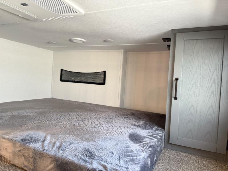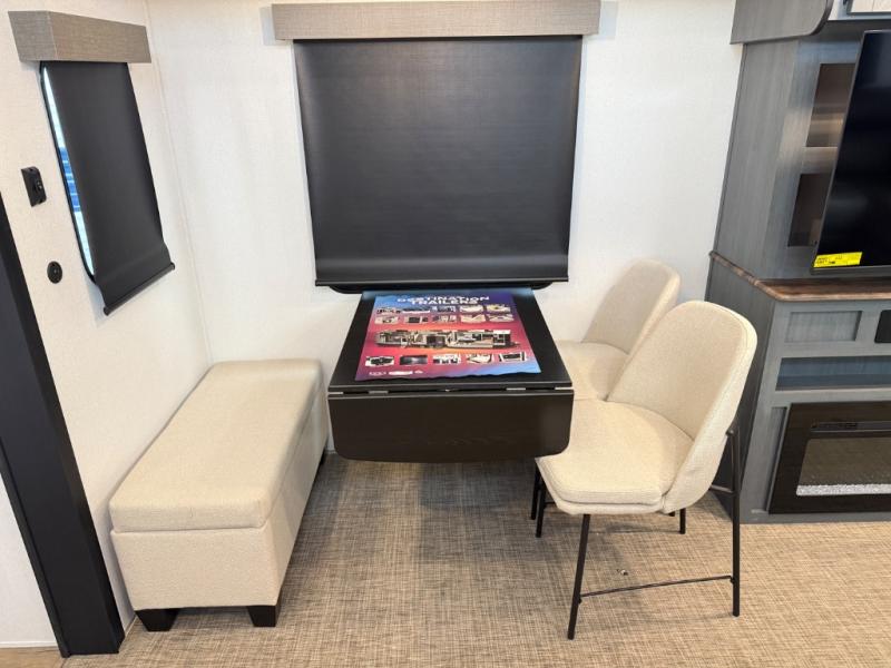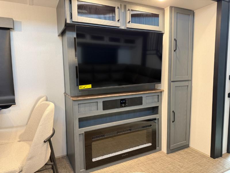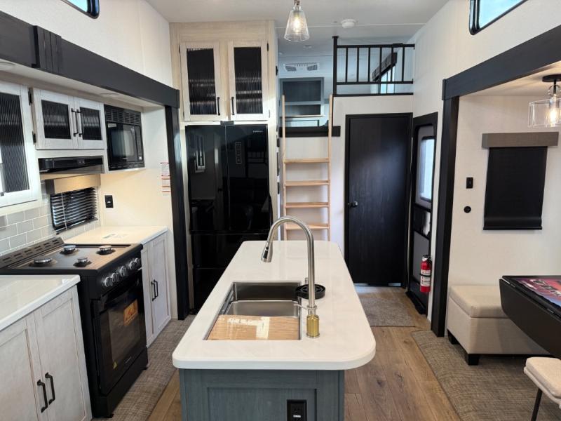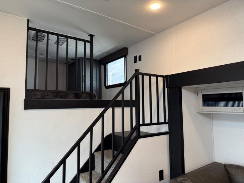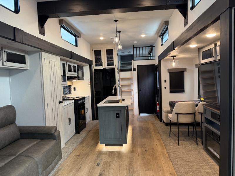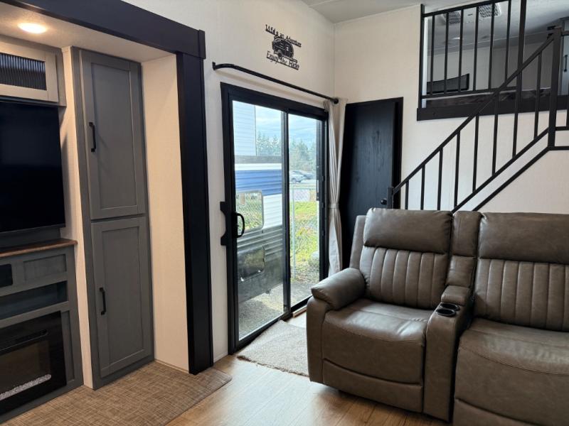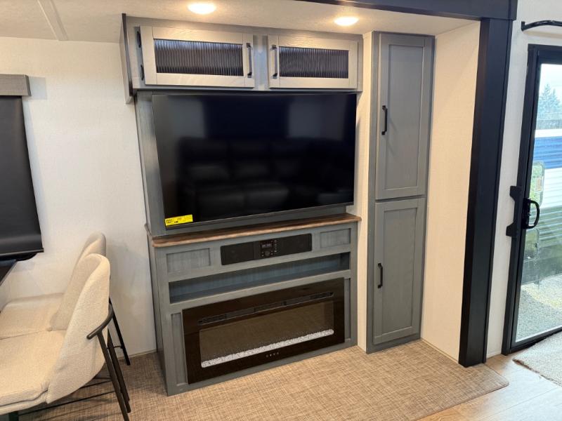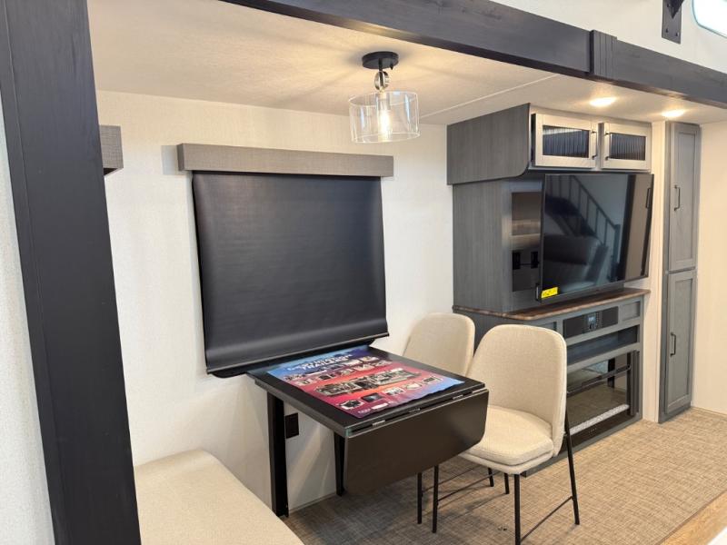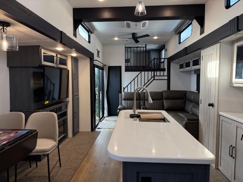 Head to your favorite spots with this destination trailer! With two entry doors, you can easily enter or exit the unit. The front private bedroom includes a king bed slide out, a wardrobe and dresser to keep your clothes organized, plus a countertop for your books or jewelry. Just outside this room is the ladder that leads to the large loft area with two 32" x 80" bunk mats, a cubby, a counter, a nightstand, and cabinets. Once you've headed back downstairs, you can relax on the L-shaped sofa across from the entertainment center with a fireplace and slide-out cabinet or the table and chairs with bench seating. And the chef of your group will love the kitchen with its residential style refrigerator and pantry, kitchen island, and four burner cooktop. The full rear bathroom not only has a 32" x 40" shower with a seat to freshen up in, and a closet with washer/dryer prep, but is also below the second loft with a 32" x 80" bunk mat and closet for storage!