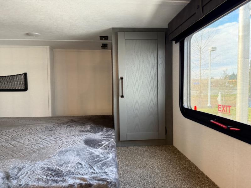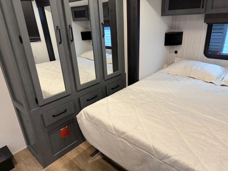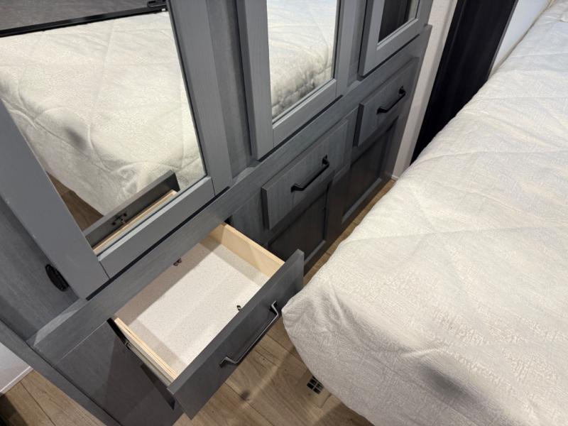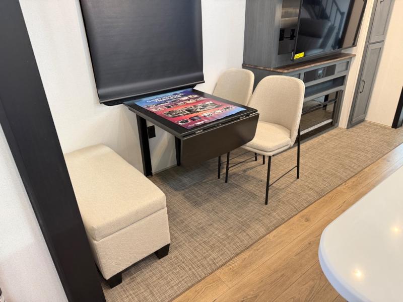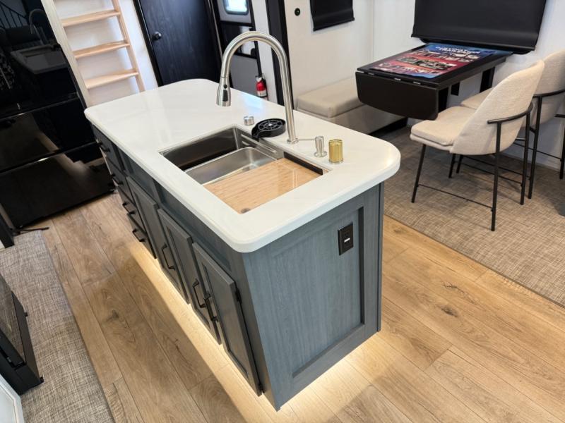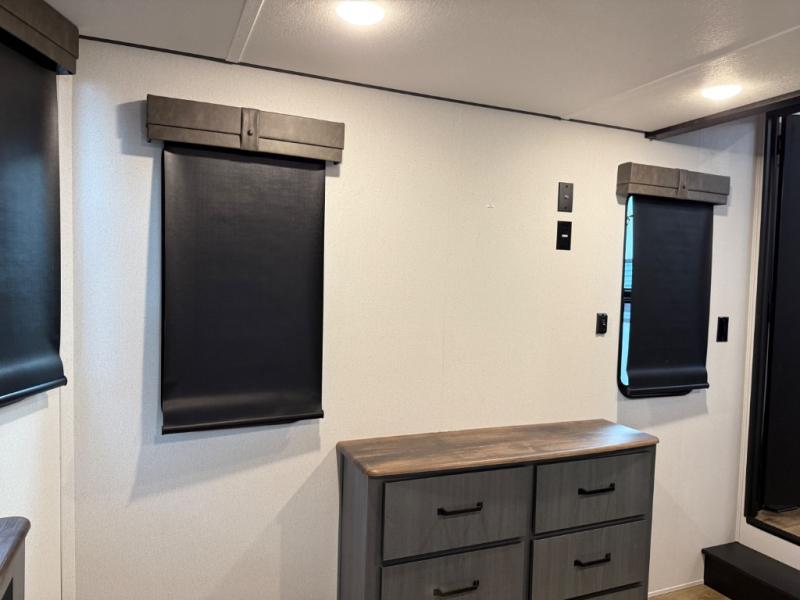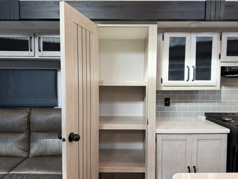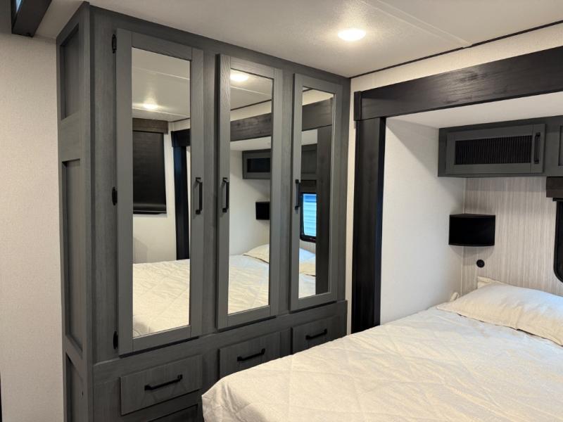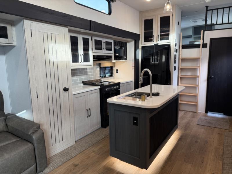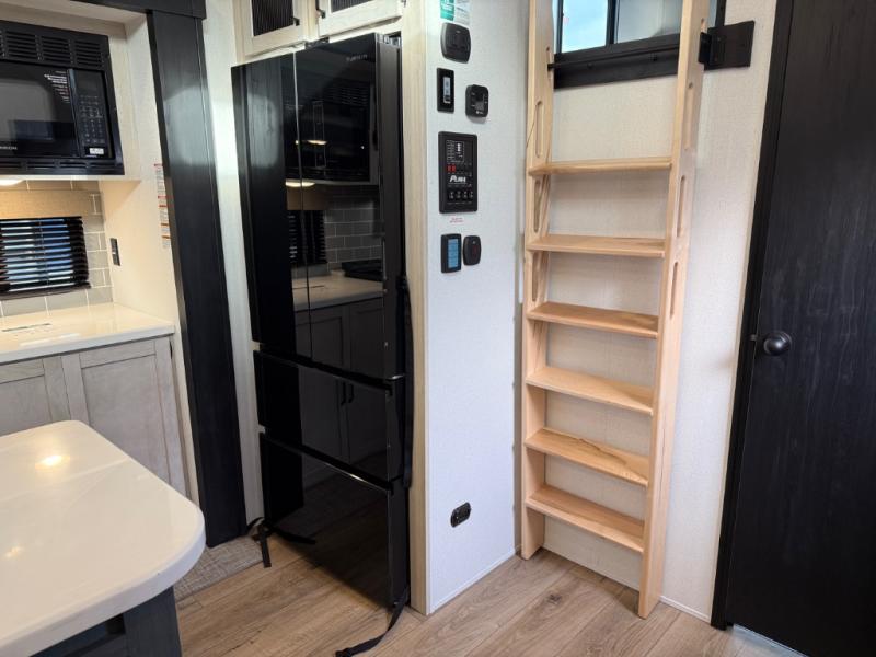 Head to your favorite spots with this destination trailer! With two entry doors, you can easily enter or exit the unit. The front private bedroom includes a king bed slide out, a wardrobe and dresser to keep your clothes organized, plus a countertop for your books or jewelry. Just outside this room is the ladder that leads to the large loft area with two 32" x 80" bunk mats, a cubby, a counter, a nightstand, and cabinets. Once you've headed back downstairs, you can relax on the L-shaped sofa across from the entertainment center with a fireplace and slide-out cabinet or the table and chairs with bench seating. And the chef of your group will love the kitchen with its residential style refrigerator and pantry, kitchen island, and four burner cooktop. The full rear bathroom not only has a 32" x 40" shower with a seat to freshen up in, and a closet with washer/dryer prep, but is also below the second loft with a 32" x 80" bunk mat and closet for storage!
