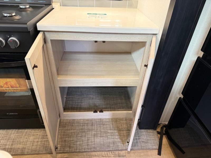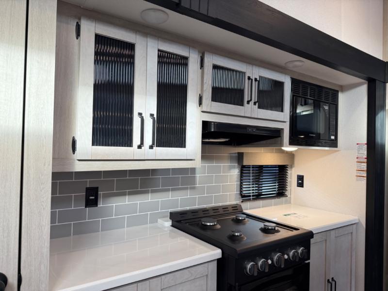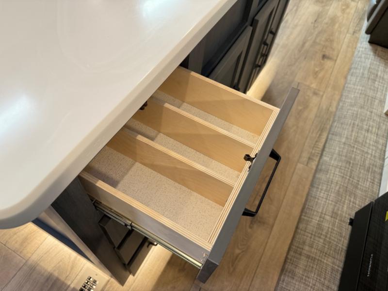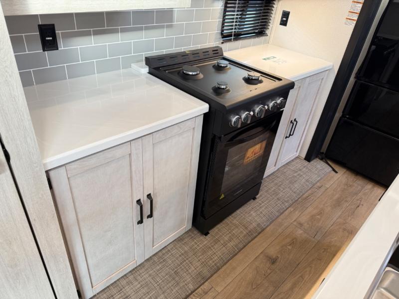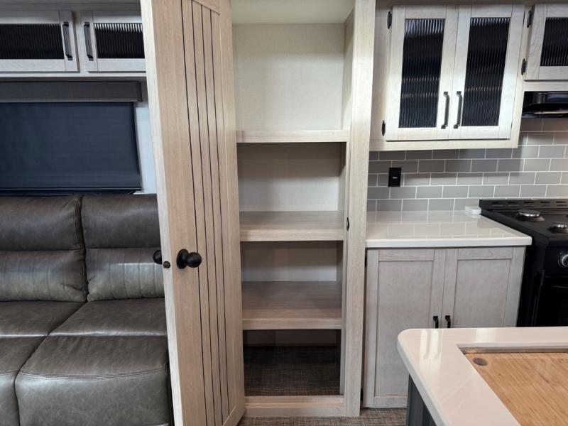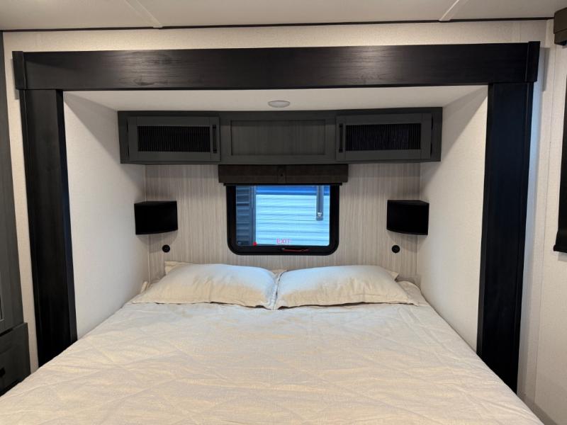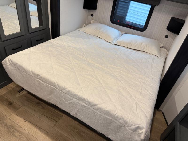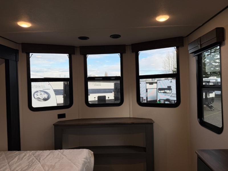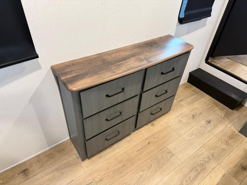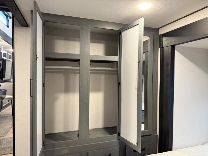 Head to your favorite spots with this destination trailer! With two entry doors, you can easily enter or exit the unit. The front private bedroom includes a king bed slide out, a wardrobe and dresser to keep your clothes organized, plus a countertop for your books or jewelry. Just outside this room is the ladder that leads to the large loft area with two 32" x 80" bunk mats, a cubby, a counter, a nightstand, and cabinets. Once you've headed back downstairs, you can relax on the L-shaped sofa across from the entertainment center with a fireplace and slide-out cabinet or the table and chairs with bench seating. And the chef of your group will love the kitchen with its residential style refrigerator and pantry, kitchen island, and four burner cooktop. The full rear bathroom not only has a 32" x 40" shower with a seat to freshen up in, and a closet with washer/dryer prep, but is also below the second loft with a 32" x 80" bunk mat and closet for storage!