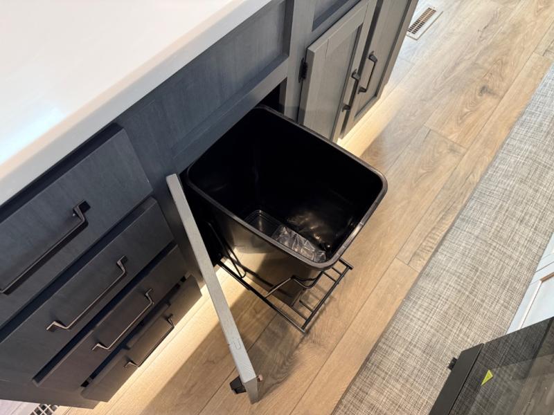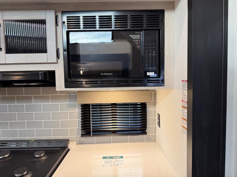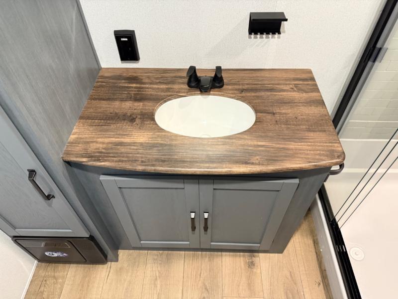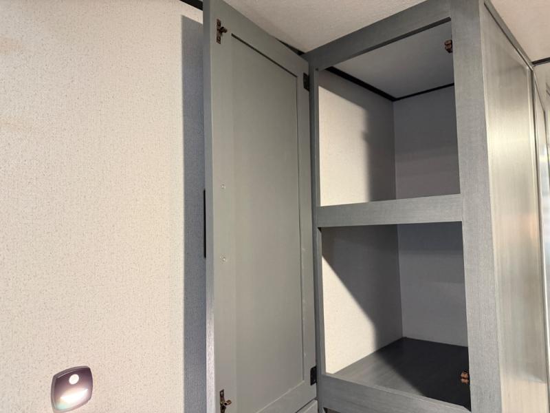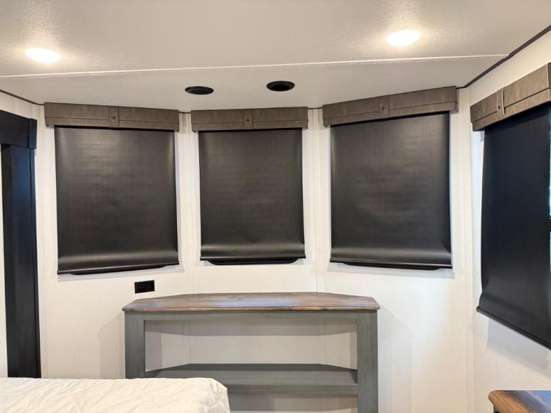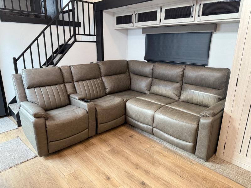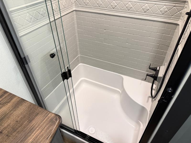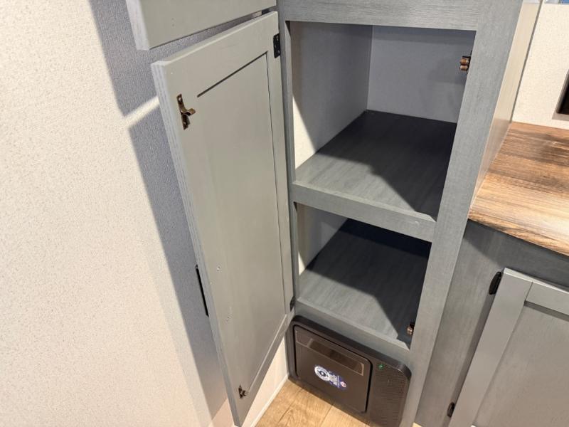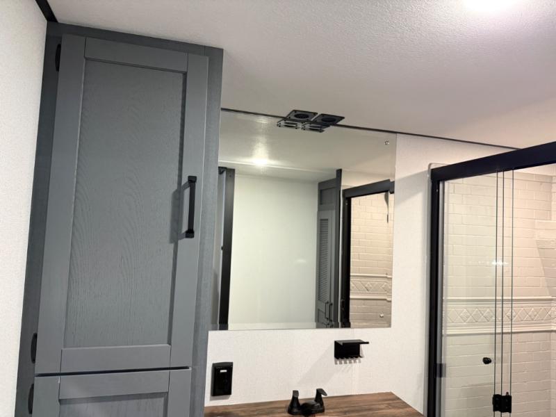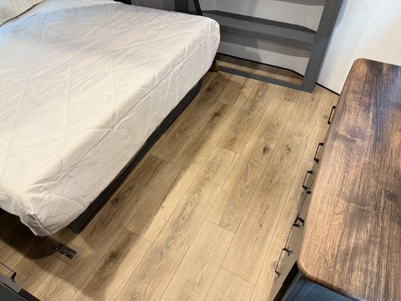 Head to your favorite spots with this destination trailer! With two entry doors, you can easily enter or exit the unit. The front private bedroom includes a king bed slide out, a wardrobe and dresser to keep your clothes organized, plus a countertop for your books or jewelry. Just outside this room is the ladder that leads to the large loft area with two 32" x 80" bunk mats, a cubby, a counter, a nightstand, and cabinets. Once you've headed back downstairs, you can relax on the L-shaped sofa across from the entertainment center with a fireplace and slide-out cabinet or the table and chairs with bench seating. And the chef of your group will love the kitchen with its residential style refrigerator and pantry, kitchen island, and four burner cooktop. The full rear bathroom not only has a 32" x 40" shower with a seat to freshen up in, and a closet with washer/dryer prep, but is also below the second loft with a 32" x 80" bunk mat and closet for storage!