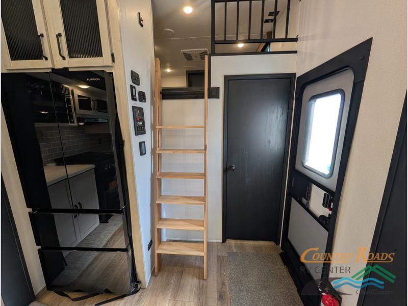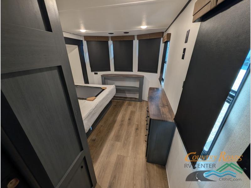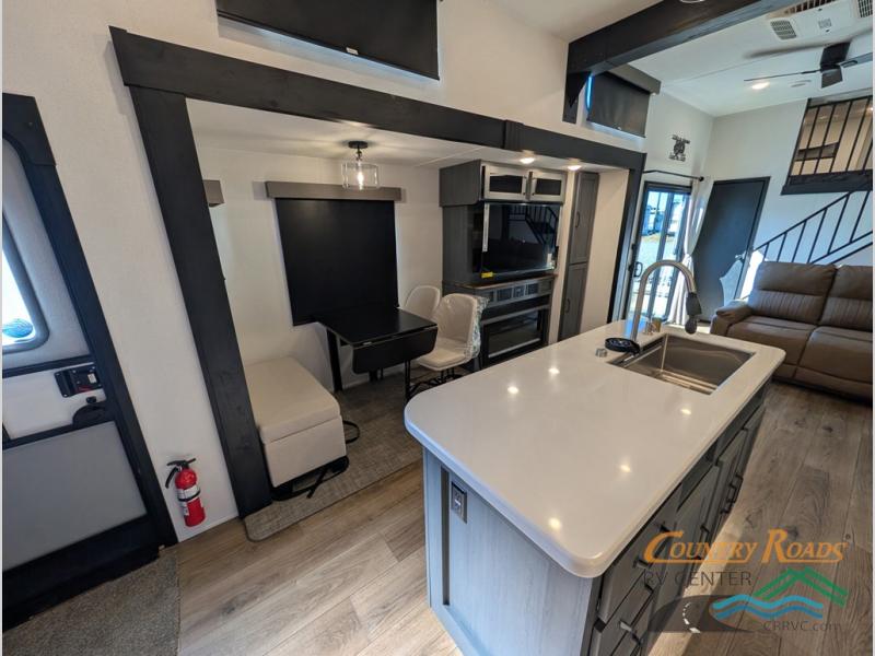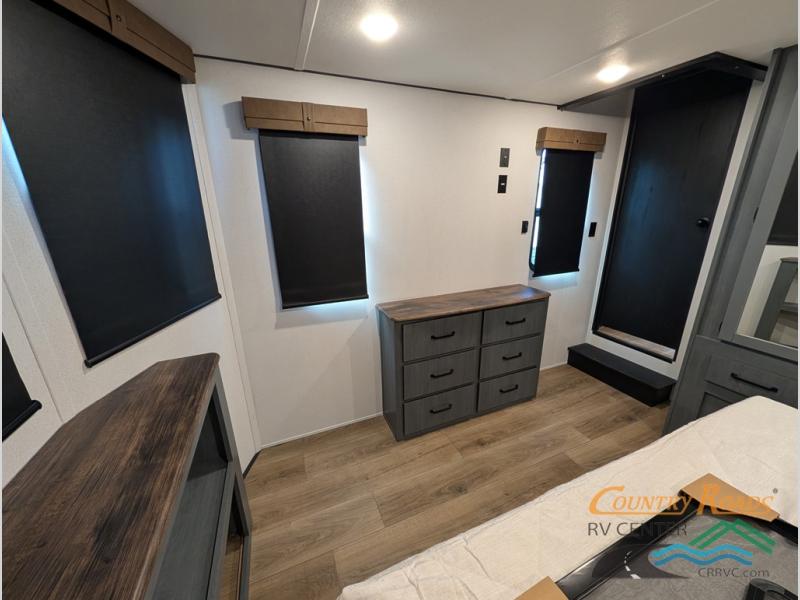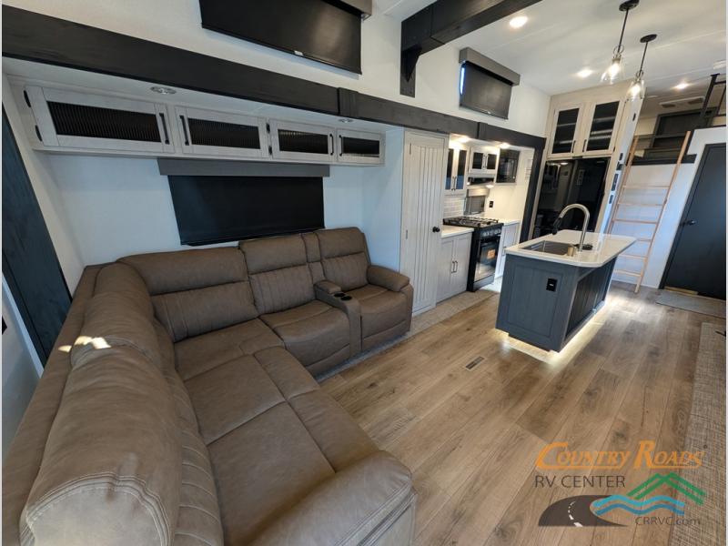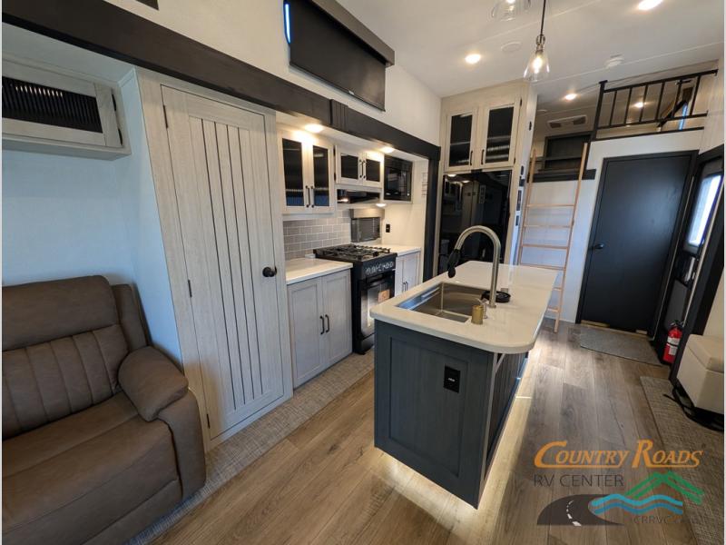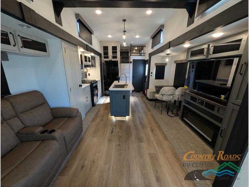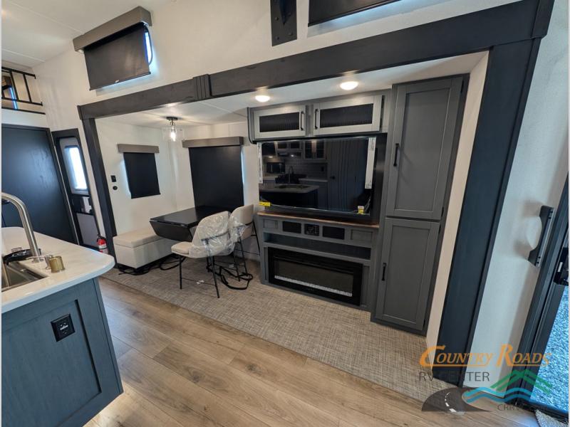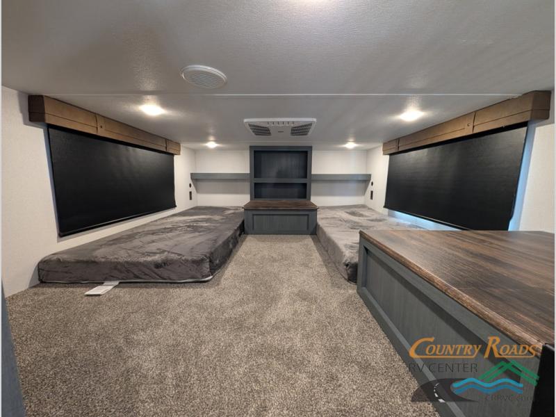 Head to your favorite spots with this destination trailer! With two entry doors, you can easily enter or exit the unit. The front private bedroom includes a king bed slide out, a wardrobe and dresser to keep your clothes organized, plus a countertop for your books or jewelry. Just outside this room is the ladder that leads to the large loft area with two 32" x 80" bunk mats, a cubby, a counter, a nightstand, and cabinets. Once you've headed back downstairs, you can relax on the L-shaped sofa across from the entertainment center with a fireplace and slide-out cabinet or the table and chairs with bench seating. And the chef of your group will love the kitchen with its residential style refrigerator and pantry, kitchen island, and four burner cooktop. The full rear bathroom not only has a 32" x 40" shower with a seat to freshen up in, and a closet with washer/dryer prep, but is also below the second loft with a 32" x 80" bunk mat and closet for storage!