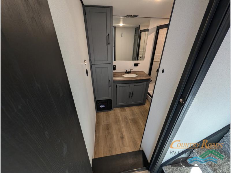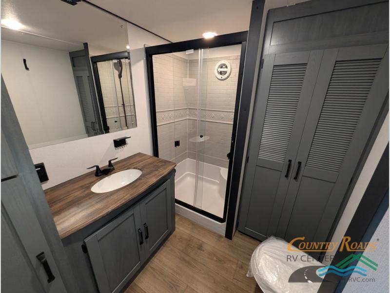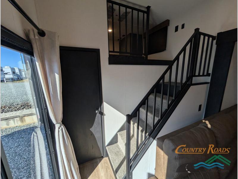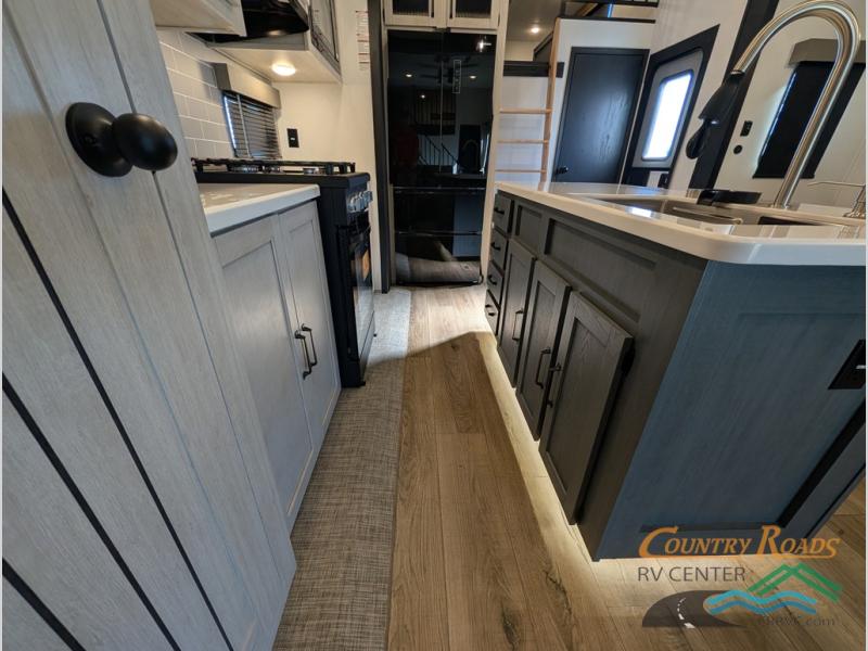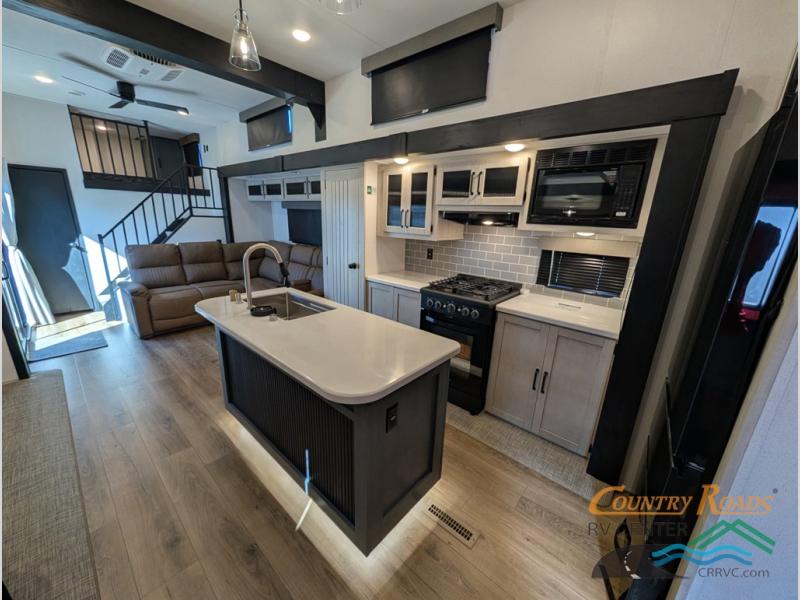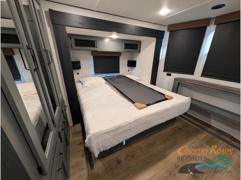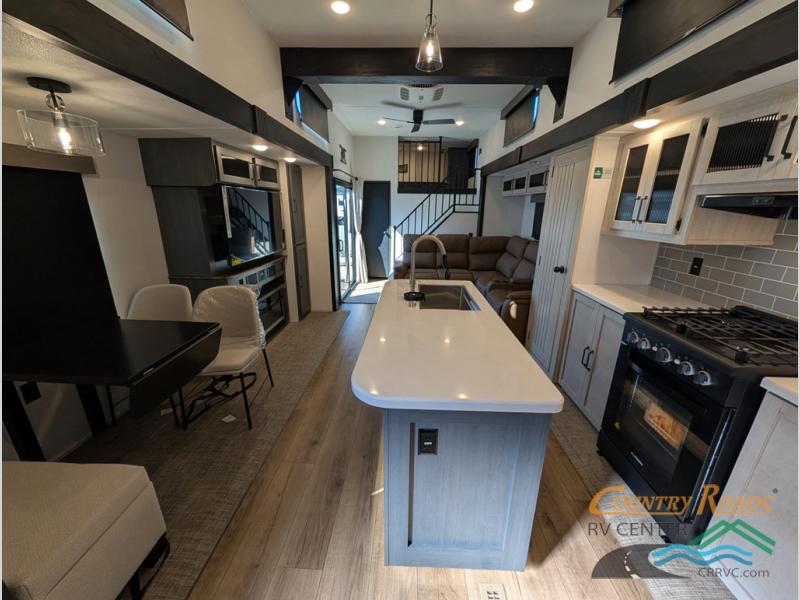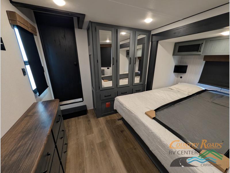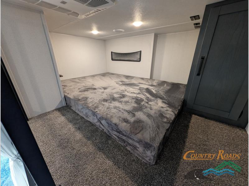 Head to your favorite spots with this destination trailer! With two entry doors, you can easily enter or exit the unit. The front private bedroom includes a king bed slide out, a wardrobe and dresser to keep your clothes organized, plus a countertop for your books or jewelry. Just outside this room is the ladder that leads to the large loft area with two 32" x 80" bunk mats, a cubby, a counter, a nightstand, and cabinets. Once you've headed back downstairs, you can relax on the L-shaped sofa across from the entertainment center with a fireplace and slide-out cabinet or the table and chairs with bench seating. And the chef of your group will love the kitchen with its residential style refrigerator and pantry, kitchen island, and four burner cooktop. The full rear bathroom not only has a 32" x 40" shower with a seat to freshen up in, and a closet with washer/dryer prep, but is also below the second loft with a 32" x 80" bunk mat and closet for storage!