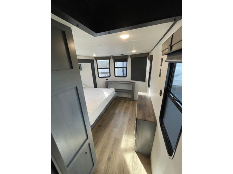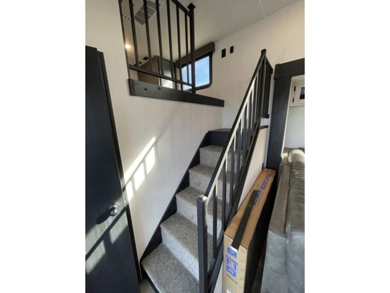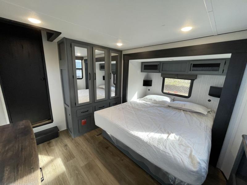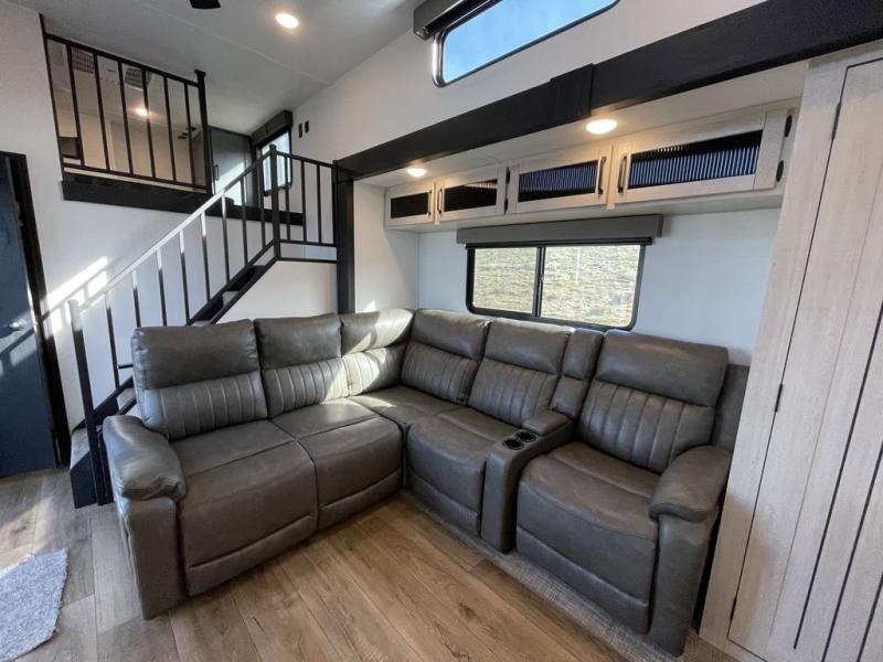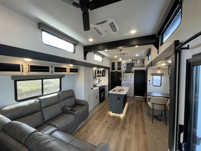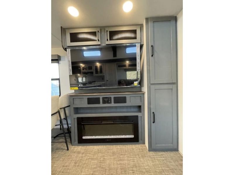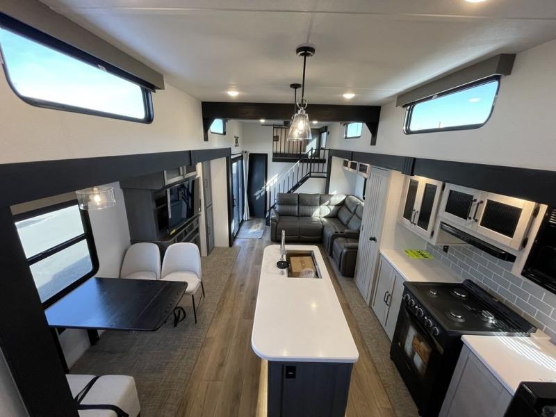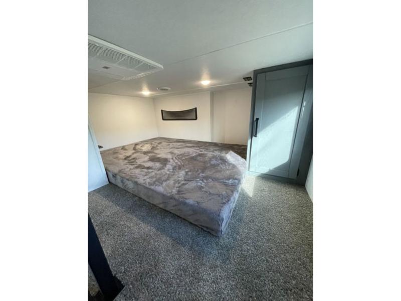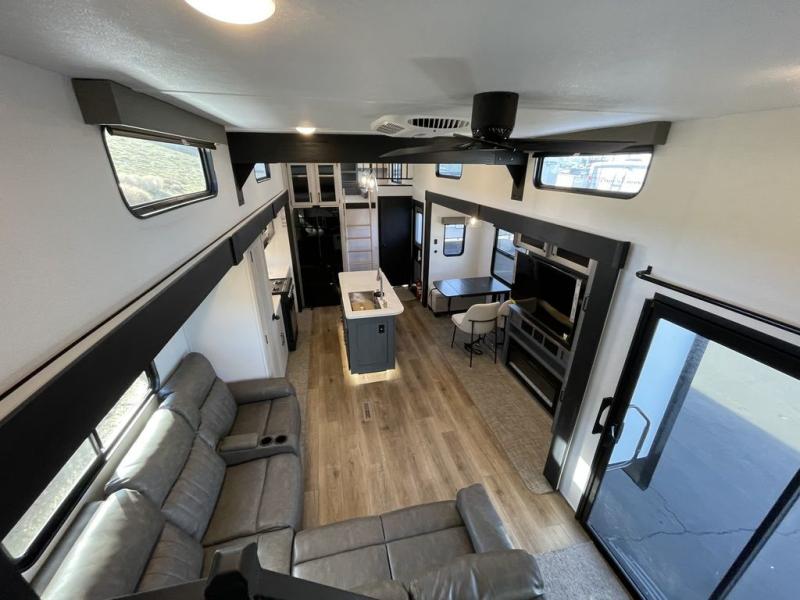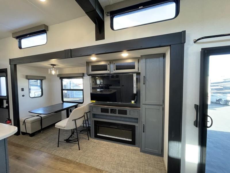 Head to your favorite spots with this destination trailer! With two entry doors, you can easily enter or exit the unit. The front private bedroom includes a king bed slide out, a wardrobe and dresser to keep your clothes organized, plus a countertop for your books or jewelry. Just outside this room is the ladder that leads to the large loft area with two 32" x 80" bunk mats, a cubby, a counter, a nightstand, and cabinets. Once you've headed back downstairs, you can relax on the L-shaped sofa across from the entertainment center with a fireplace and slide-out cabinet or the table and chairs with bench seating. And the chef of your group will love the kitchen with its residential style refrigerator and pantry, kitchen island, and four burner cooktop. The full rear bathroom not only has a 32" x 40" shower with a seat to freshen up in, and a closet with washer/dryer prep, but is also below the second loft with a 32" x 80" bunk mat and closet for storage!