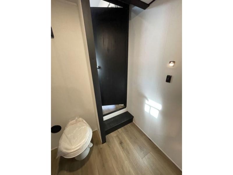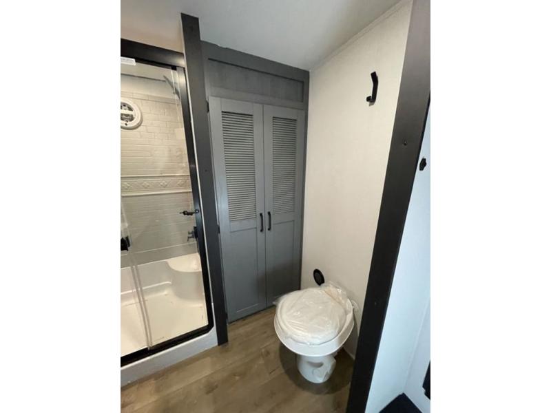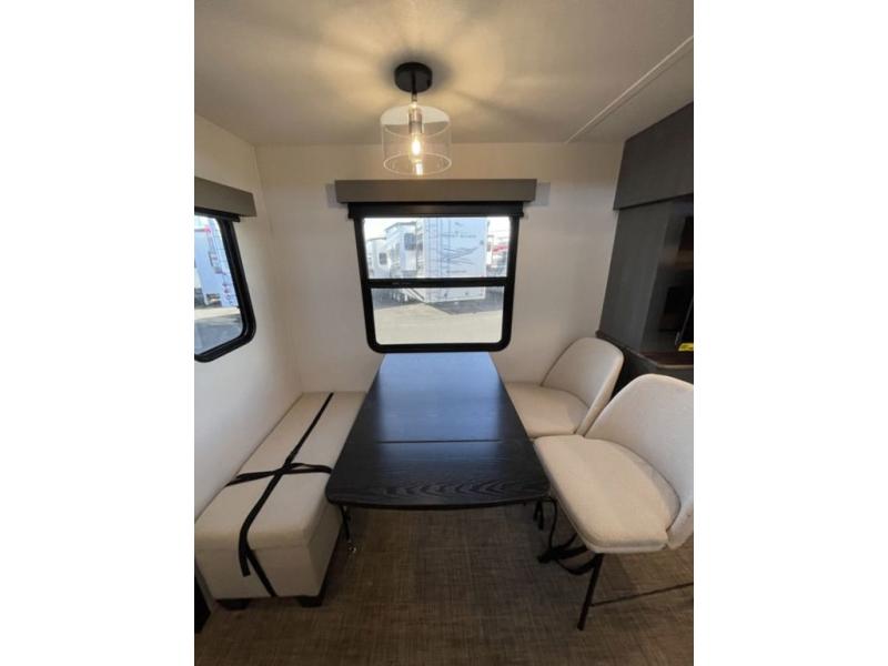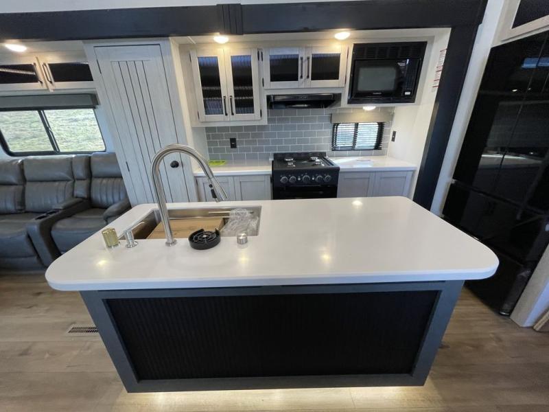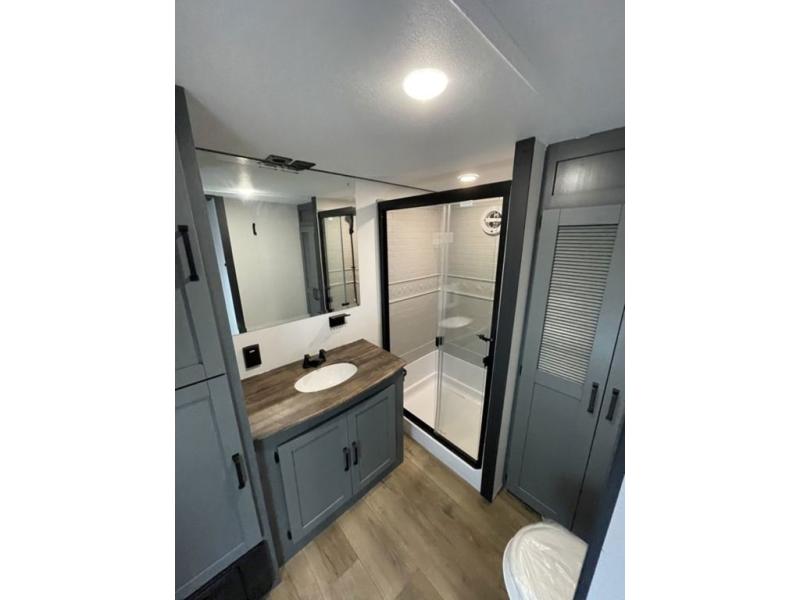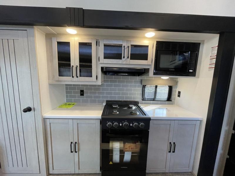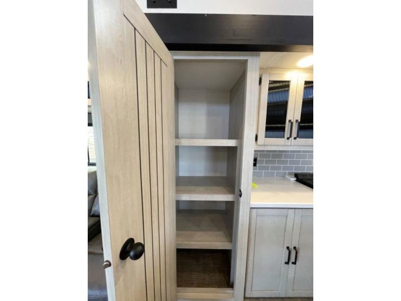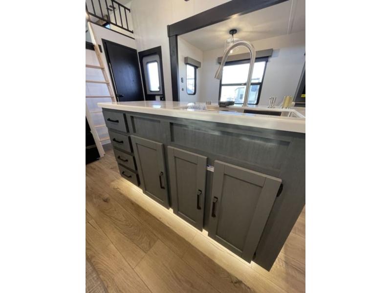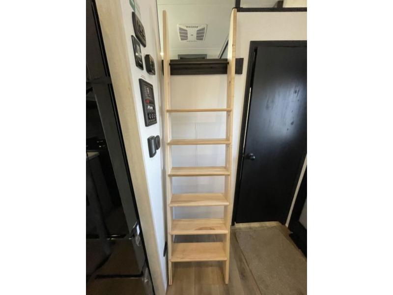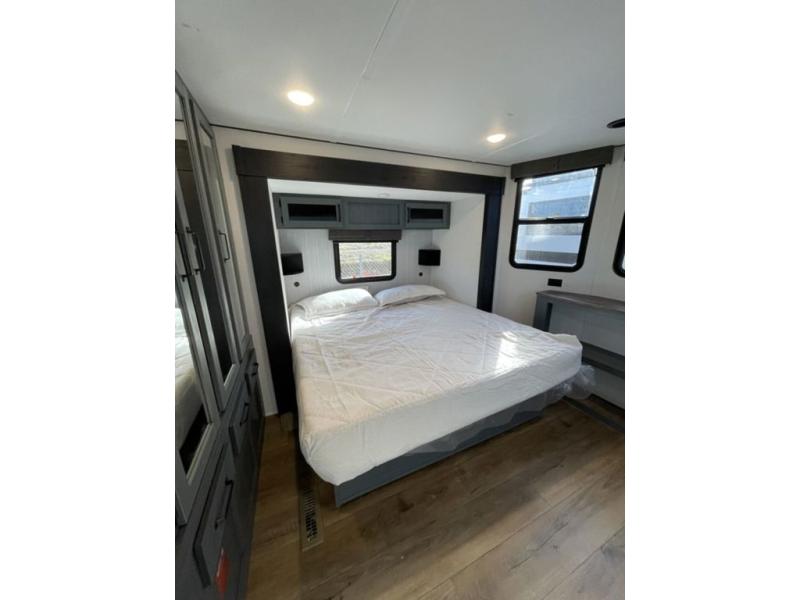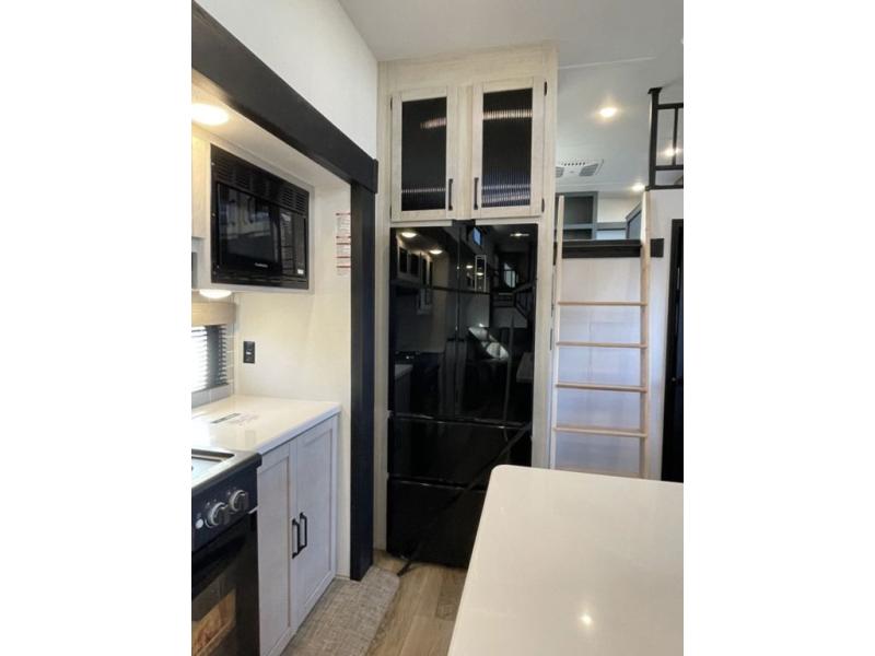 Head to your favorite spots with this destination trailer! With two entry doors, you can easily enter or exit the unit. The front private bedroom includes a king bed slide out, a wardrobe and dresser to keep your clothes organized, plus a countertop for your books or jewelry. Just outside this room is the ladder that leads to the large loft area with two 32" x 80" bunk mats, a cubby, a counter, a nightstand, and cabinets. Once you've headed back downstairs, you can relax on the L-shaped sofa across from the entertainment center with a fireplace and slide-out cabinet or the table and chairs with bench seating. And the chef of your group will love the kitchen with its residential style refrigerator and pantry, kitchen island, and four burner cooktop. The full rear bathroom not only has a 32" x 40" shower with a seat to freshen up in, and a closet with washer/dryer prep, but is also below the second loft with a 32" x 80" bunk mat and closet for storage!