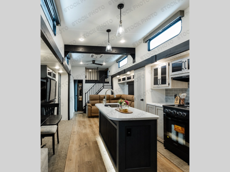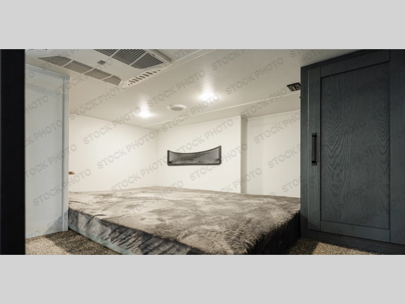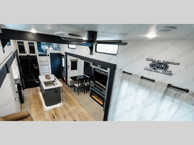 Head to your favorite spots with this destination trailer! With two entry doors, you can easily enter or exit the unit. The front private bedroom includes a king bed slide out, a wardrobe and dresser to keep your clothes organized, plus a countertop for your books or jewelry. Just outside this room is the ladder that leads to the large loft area with two 32" x 80" bunk mats, a cubby, a counter, a nightstand, and cabinets. Once you've headed back downstairs, you can relax on the L-shaped sofa across from the entertainment center with a fireplace and slide-out cabinet or the table and chairs with bench seating. And the chef of your group will love the kitchen with its residential style refrigerator and pantry, kitchen island, and four burner cooktop. The full rear bathroom not only has a 32" x 40" shower with a seat to freshen up in, and a closet with washer/dryer prep, but is also below the second loft with a 32" x 80" bunk mat and closet for storage!