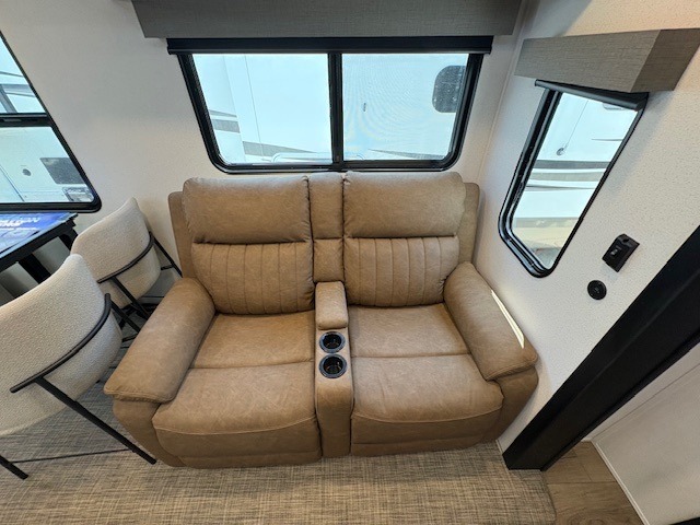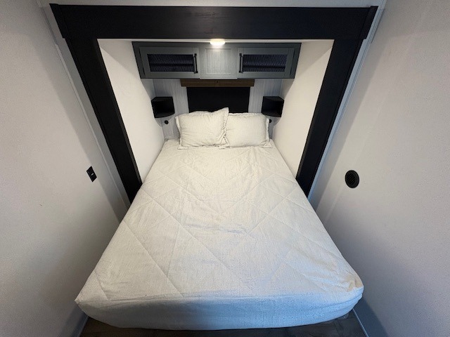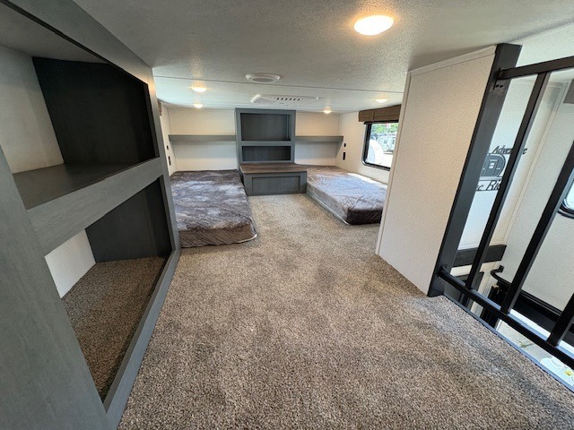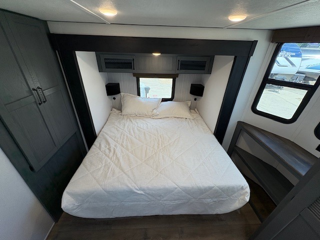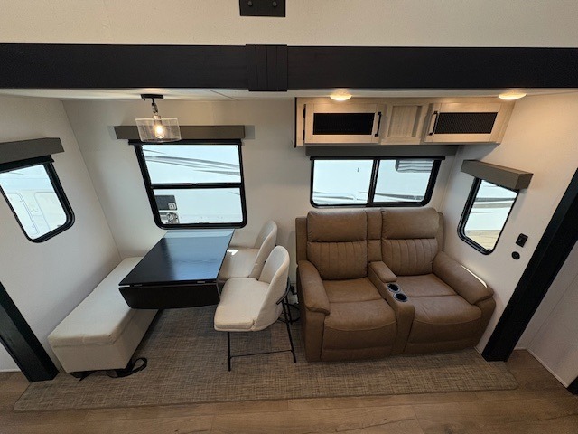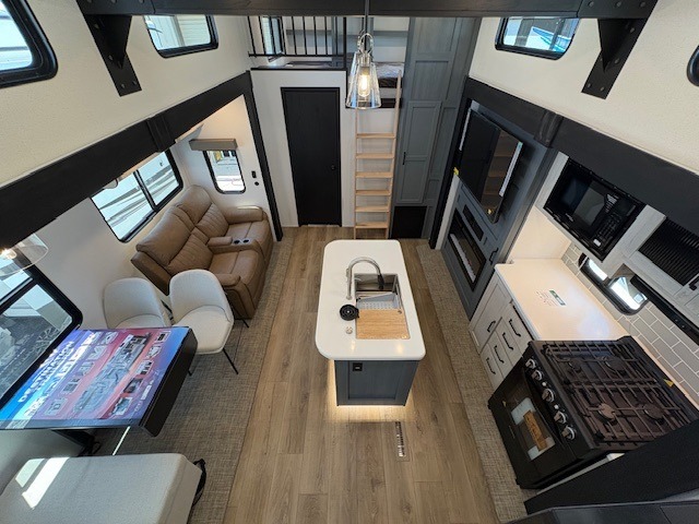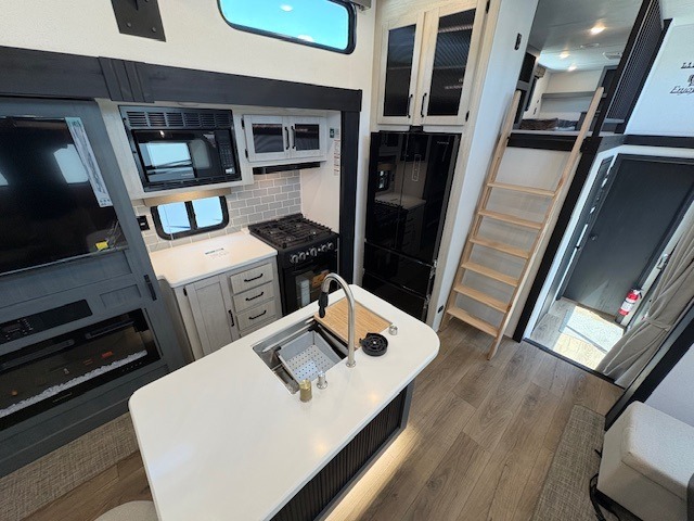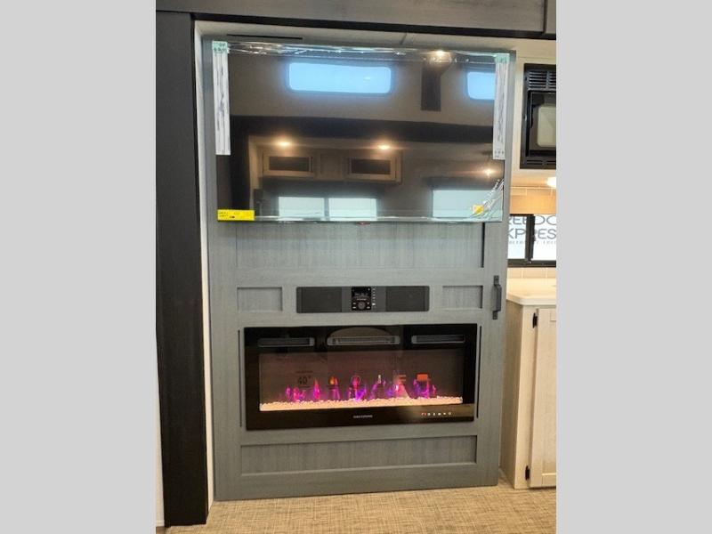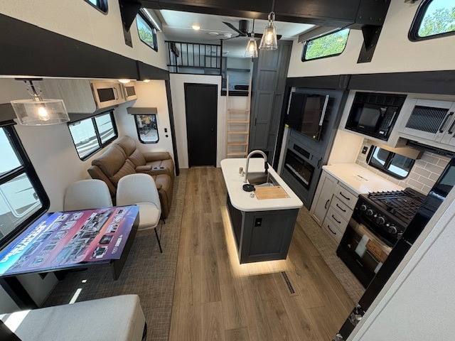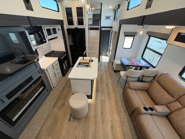 Head to your favorite spots with this destination trailer! The front private bedroom includes a king bed slide out. The rear bedroom has a queen bed and a 2nd bathroom! a wardrobe and dresser to keep your clothes organized, plus a countertop for your books or jewelry. Just outside this room is the ladder that leads to the large loft area with two 32" x 80" bunk mats, a cubby, a counter, a nightstand, and cabinets. Once you've headed back downstairs, you can relax on the L-shaped sofa across from the entertainment center with a fireplace and slide-out cabinet or the free-standing table with a bench and two seats. And the chef of your group will love the kitchen with its residential style refrigerator and pantry, kitchen island, and four burner cooktop. The full rear bathroom not only has a 32" x 40" shower with a seat to freshen up in and a closet prepped to add the optional washer and dryer, but is also below the second loft with a 32" x 80" bunk mat and closet for storage!