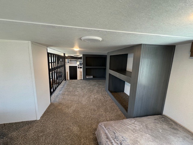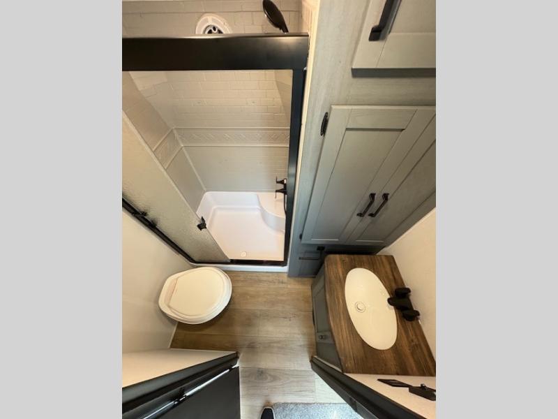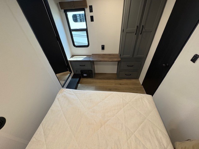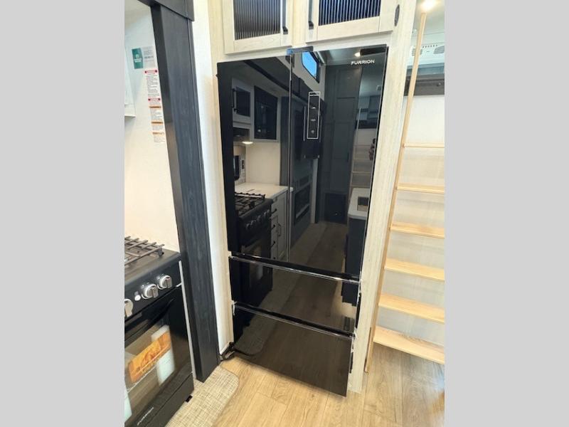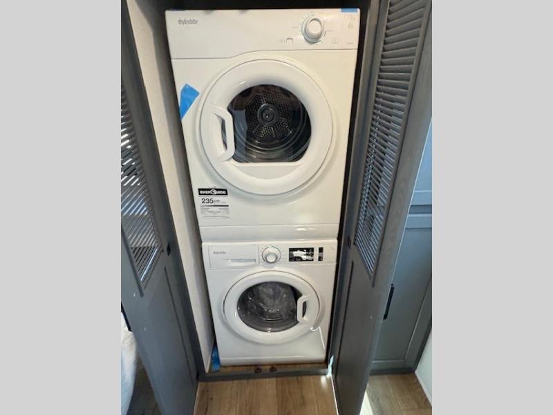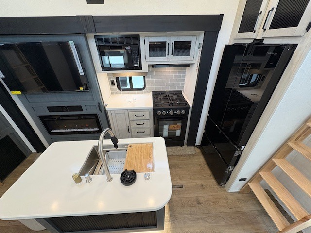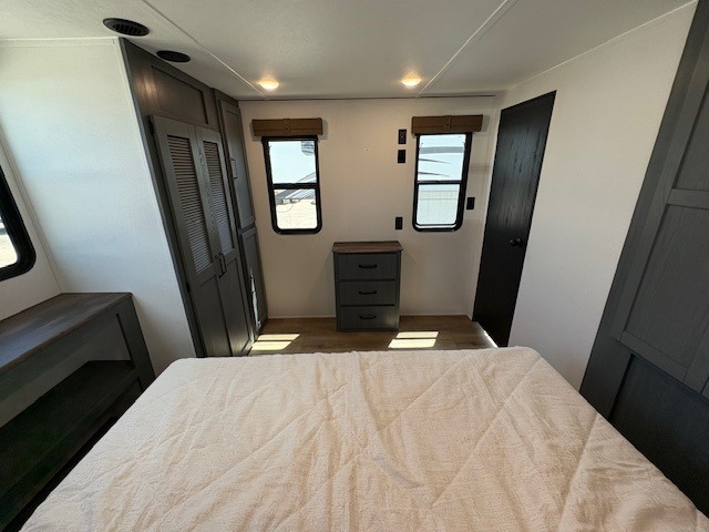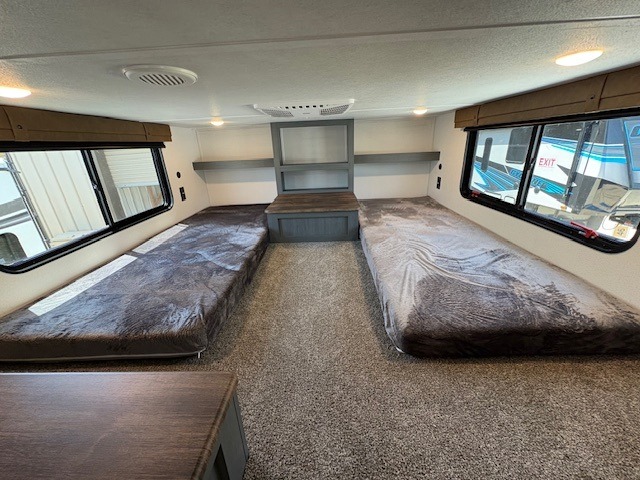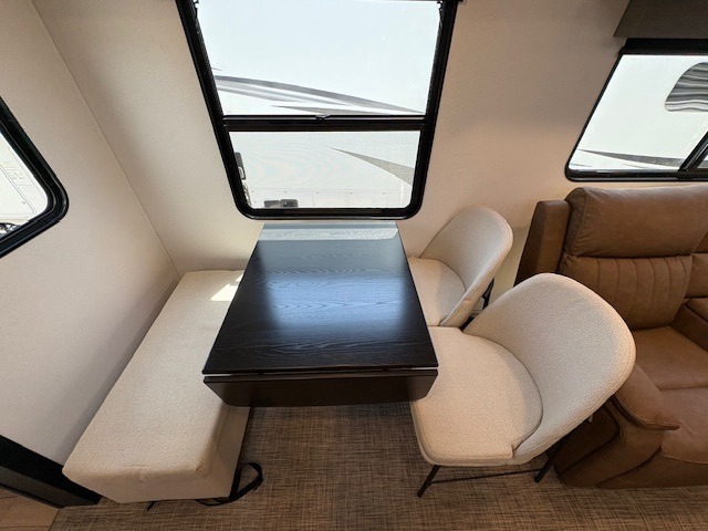 Head to your favorite spots with this destination trailer! The front private bedroom includes a king bed slide out. The rear bedroom has a queen bed and a 2nd bathroom! a wardrobe and dresser to keep your clothes organized, plus a countertop for your books or jewelry. Just outside this room is the ladder that leads to the large loft area with two 32" x 80" bunk mats, a cubby, a counter, a nightstand, and cabinets. Once you've headed back downstairs, you can relax on the L-shaped sofa across from the entertainment center with a fireplace and slide-out cabinet or the free-standing table with a bench and two seats. And the chef of your group will love the kitchen with its residential style refrigerator and pantry, kitchen island, and four burner cooktop. The full rear bathroom not only has a 32" x 40" shower with a seat to freshen up in and a closet prepped to add the optional washer and dryer, but is also below the second loft with a 32" x 80" bunk mat and closet for storage!