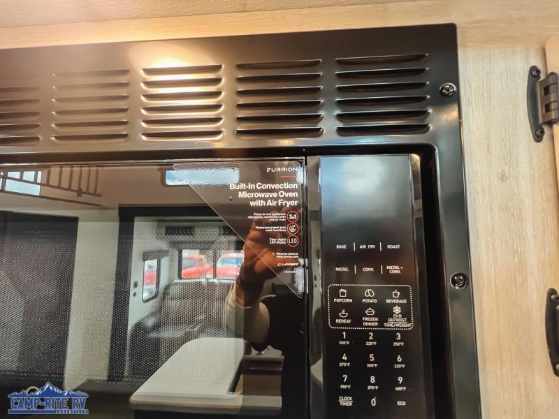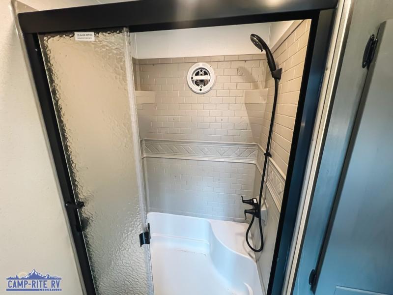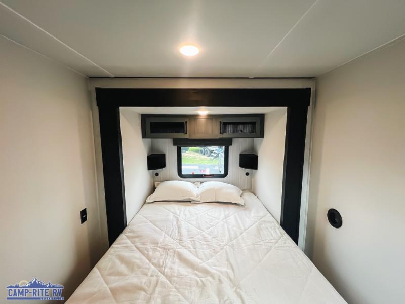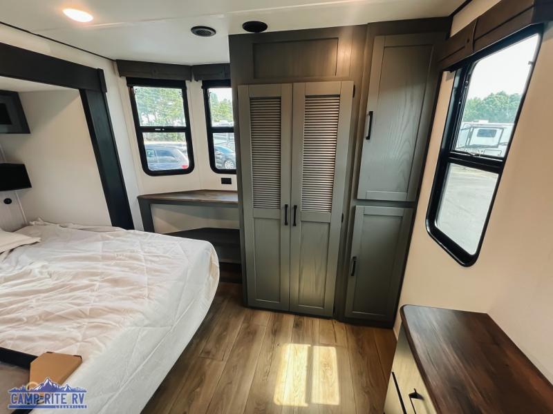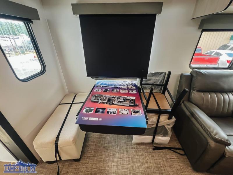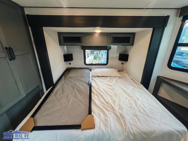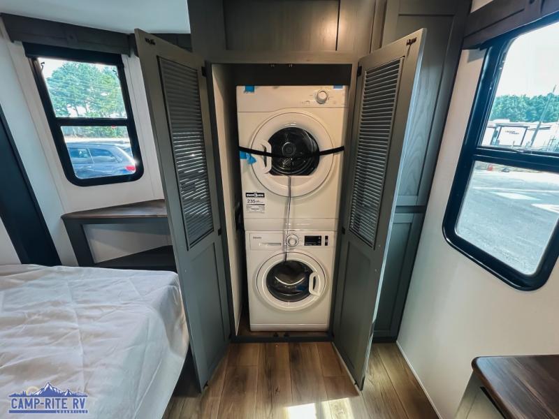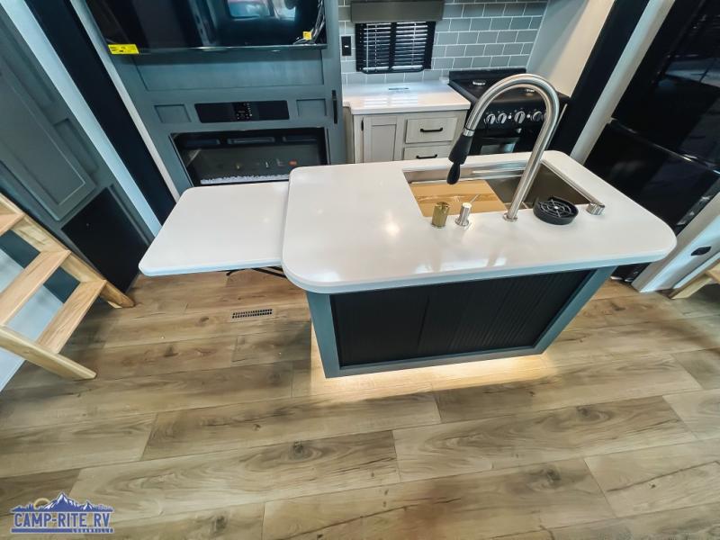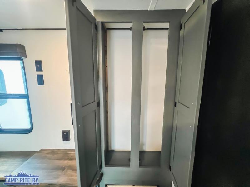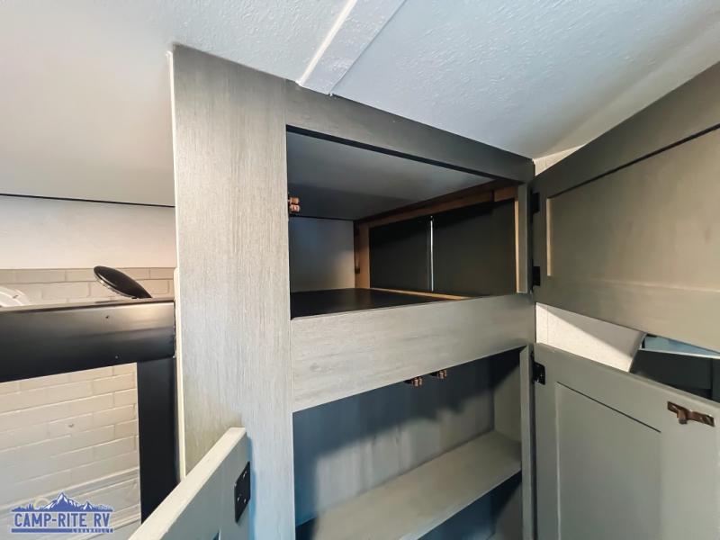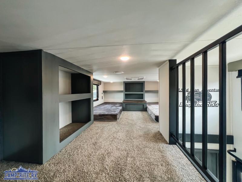 If you're planning to camp with a larger group or your family, this destination trailer will provide everything you're looking for! Your guests can take the rear bunkhouse suite that includes a slide out with a jiffy sofa and bunk bed, an entertainment center, and a full bath. You'll also find one of the dual entry doors here for added convenience. There are steps just outside the bunkhouse that lead to the loft with two bunk mats and storage space to keep this space tidy! The front private bedroom will be perfect for you with its king bed slide out, wardrobe/closet, and bedroom desk if you're needing to work from home. There is even a closet with the option to add washer and dryer prep. In the morning, everyone can meet in the combined middle living area and kitchen. A large slide out here houses the free-standing table and sofa, and the fireplace is close by to make it feel a little more like home!