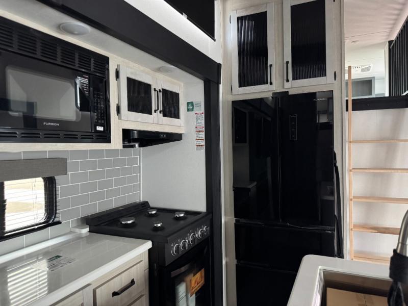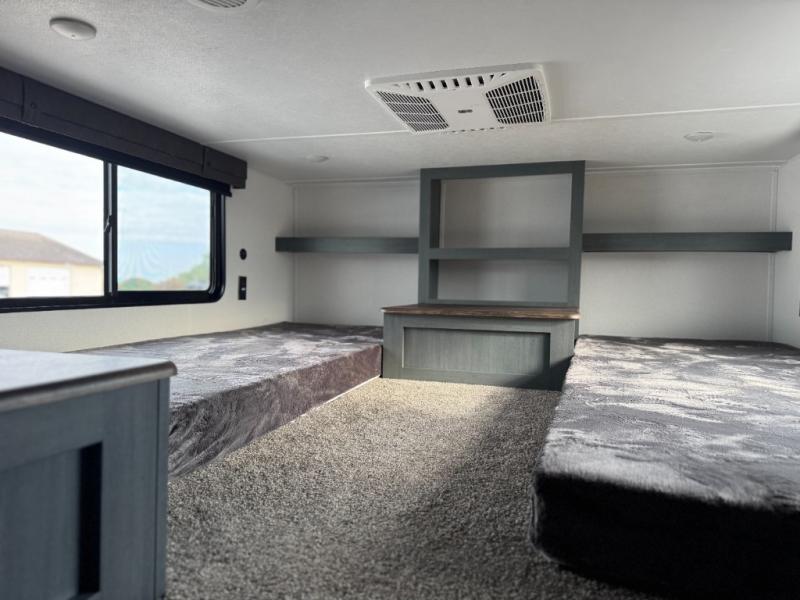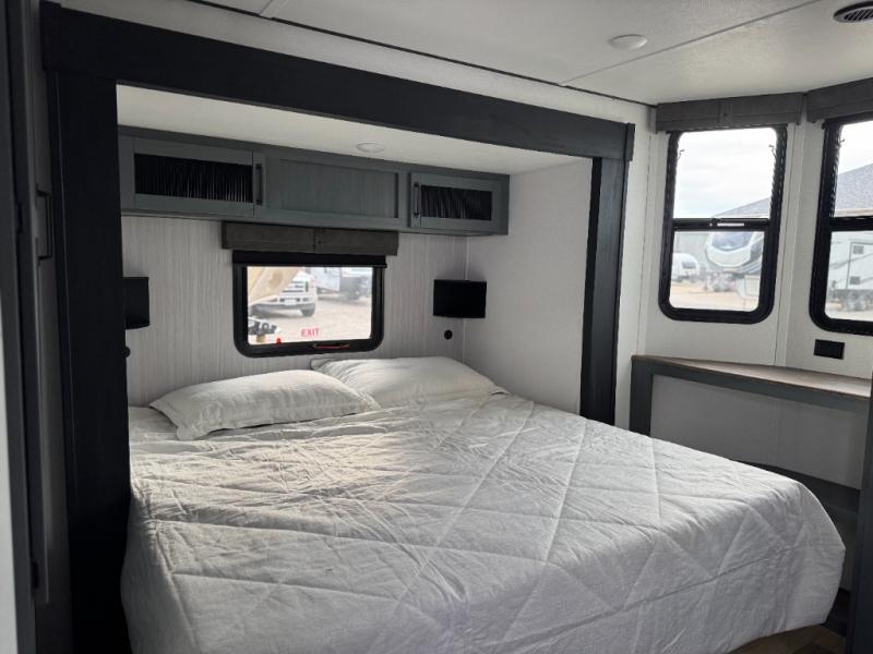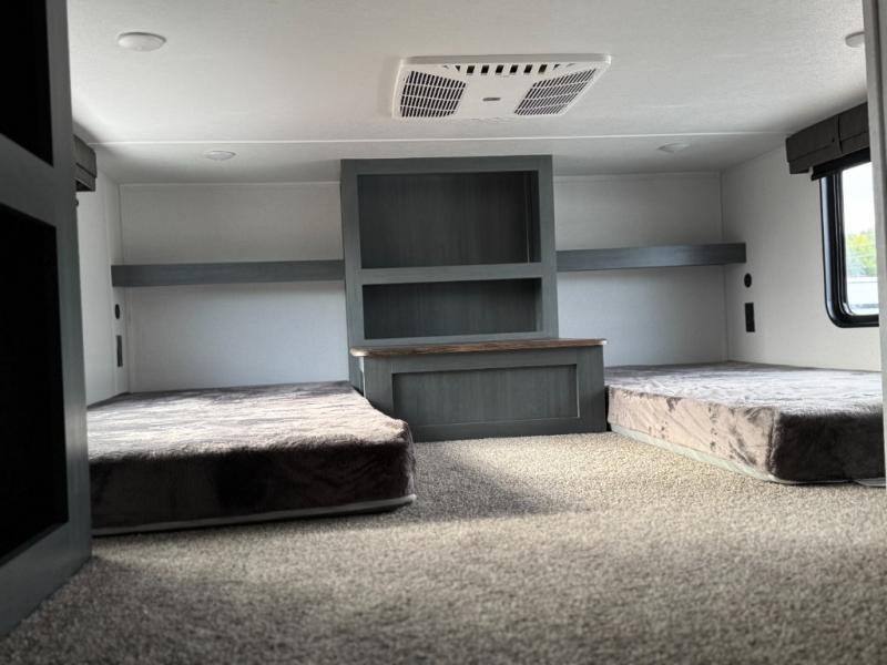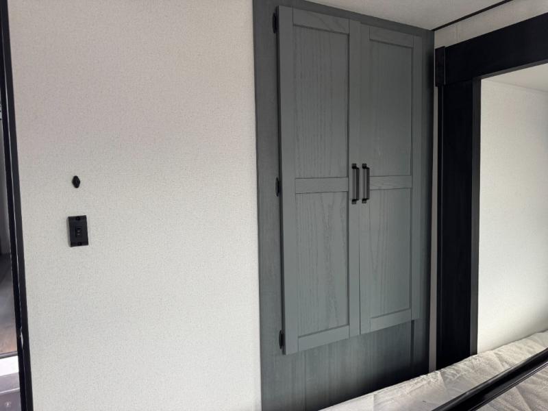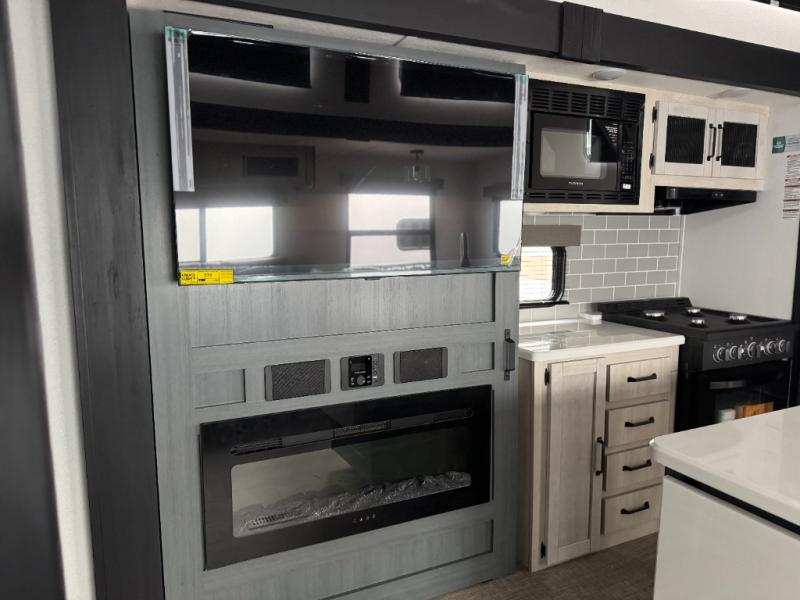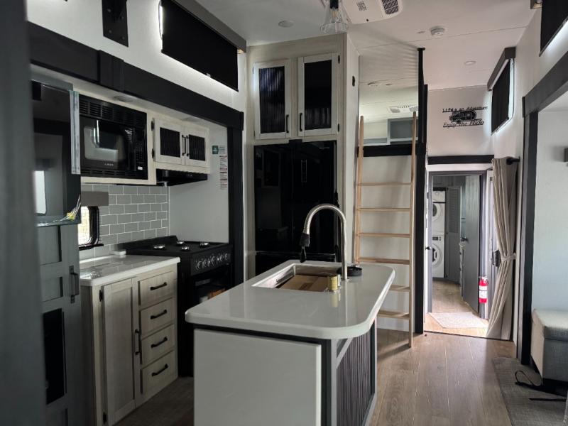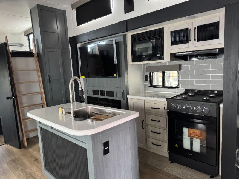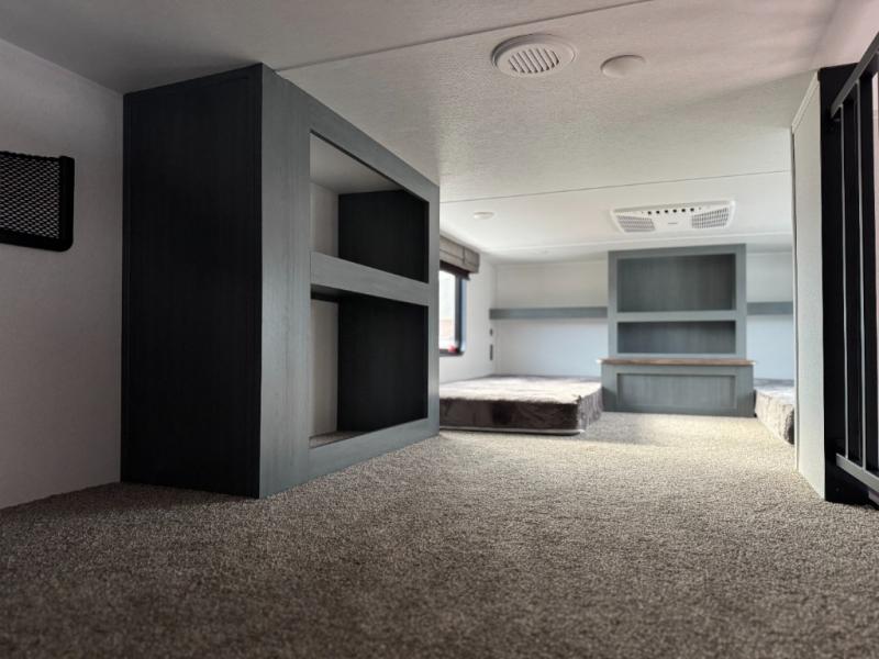 You won't believe the amount of comfort found in this destination trailer! There are two separate loft areas; one up front with a ladder, two bunk mats, storage space, and an optional fireplace, and one in the back with a ladder, two bunk mats, storage space, and a nightstand! On the main level, you'll find your own space in the front private bedroom, complete with a king bed slide, a countertop, dresser, and even washer and dryer prep. And a full bath is right next to the bedroom for easy nighttime use. Head to the full kitchen where you'll find all the appliances to cook meals, a kitchen island with an extension for more prep space, plus two pantries, one being hidden behind the TV! The comfort continues on in the rear master bedroom, complete with a queen bed slide, a desk with a chair, and a wardrobe for clothes. And the second full bath is found in the very back for added convenience!