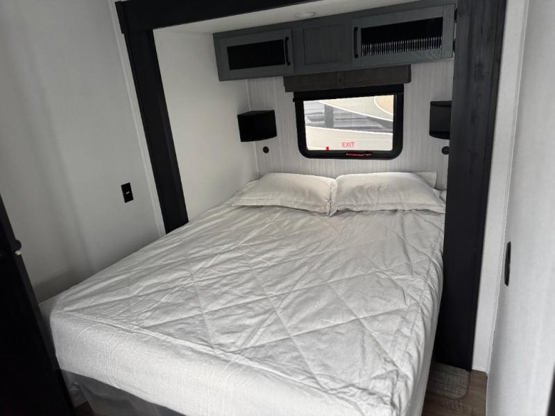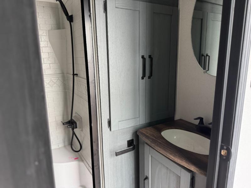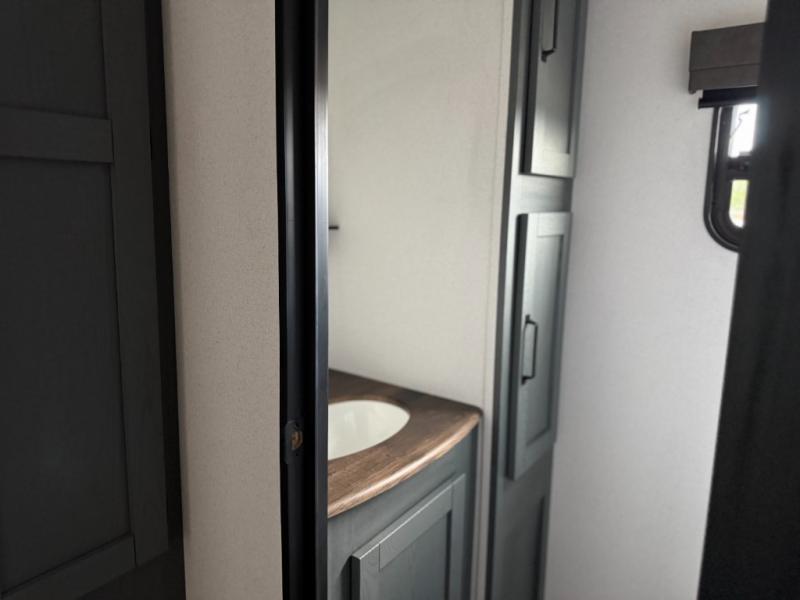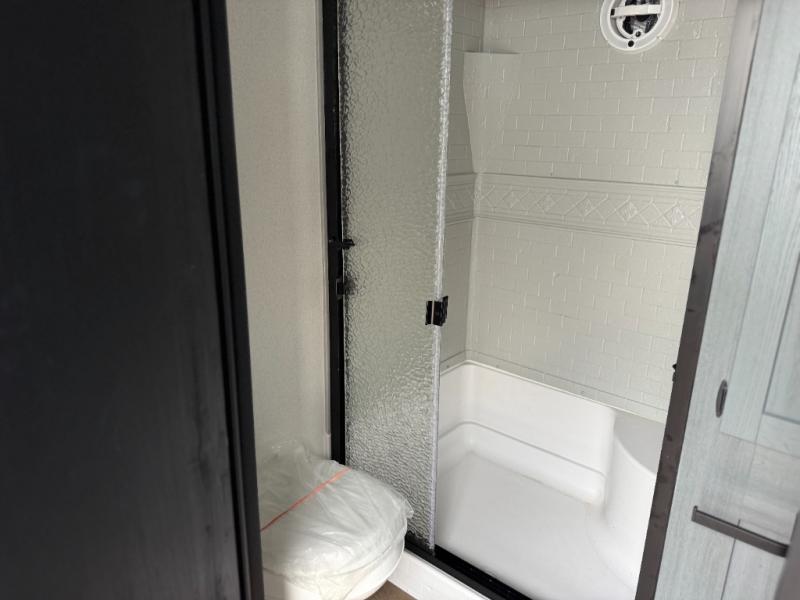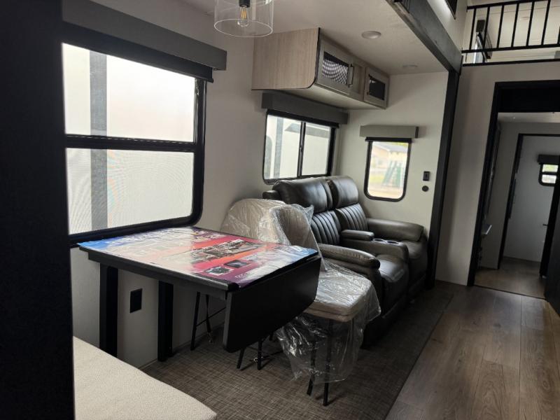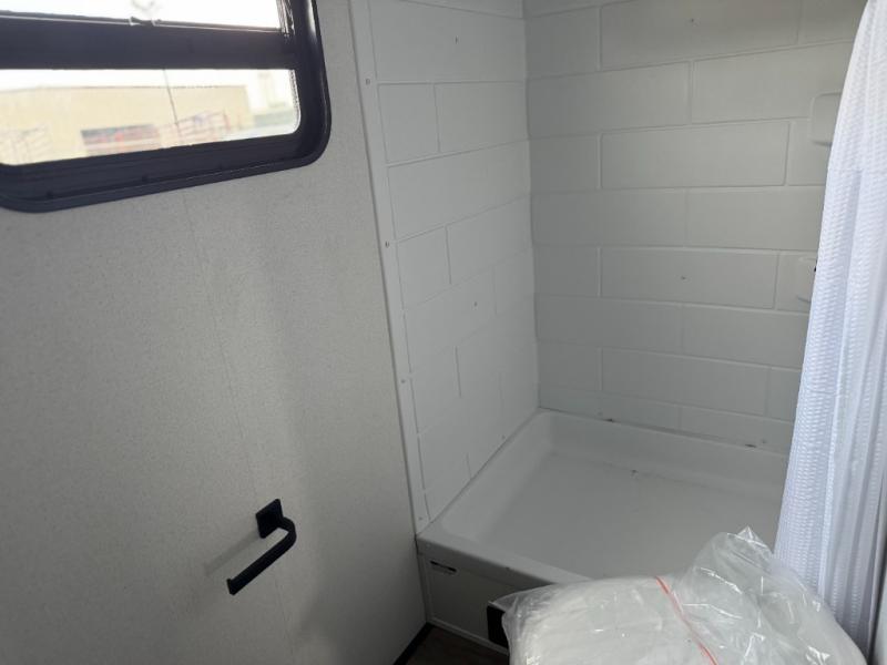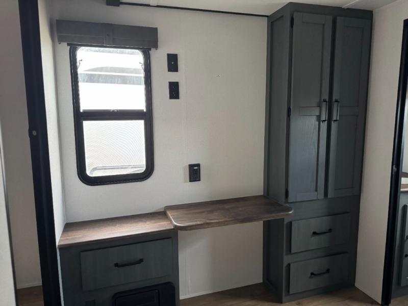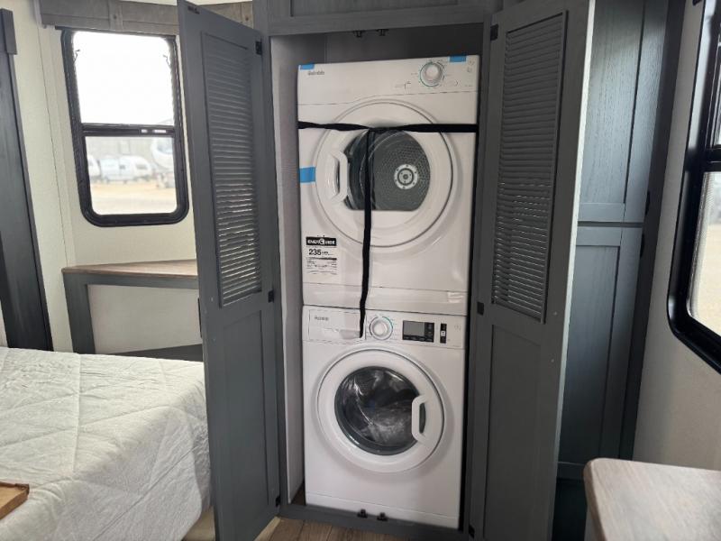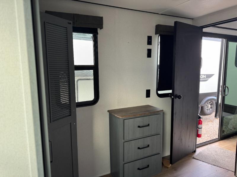 You won't believe the amount of comfort found in this destination trailer! There are two separate loft areas; one up front with a ladder, two bunk mats, storage space, and an optional fireplace, and one in the back with a ladder, two bunk mats, storage space, and a nightstand! On the main level, you'll find your own space in the front private bedroom, complete with a king bed slide, a countertop, dresser, and even washer and dryer prep. And a full bath is right next to the bedroom for easy nighttime use. Head to the full kitchen where you'll find all the appliances to cook meals, a kitchen island with an extension for more prep space, plus two pantries, one being hidden behind the TV! The comfort continues on in the rear master bedroom, complete with a queen bed slide, a desk with a chair, and a wardrobe for clothes. And the second full bath is found in the very back for added convenience!