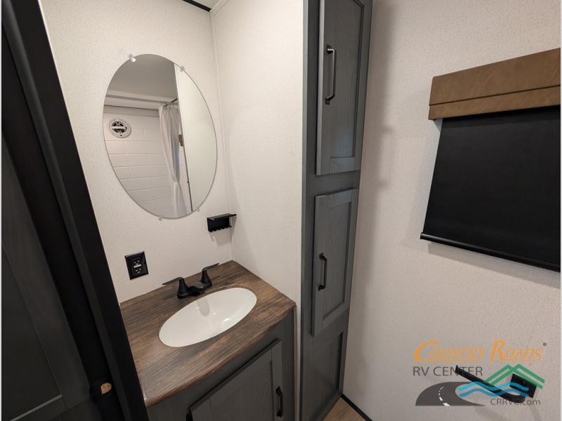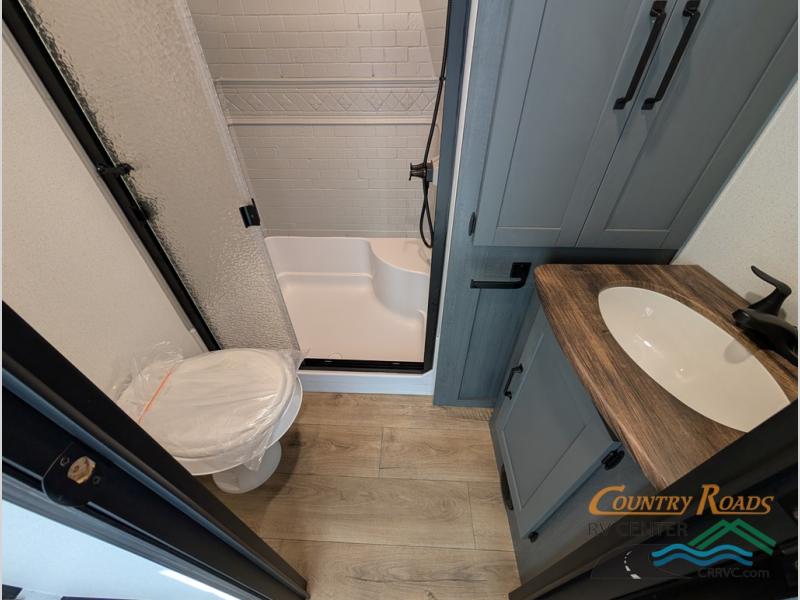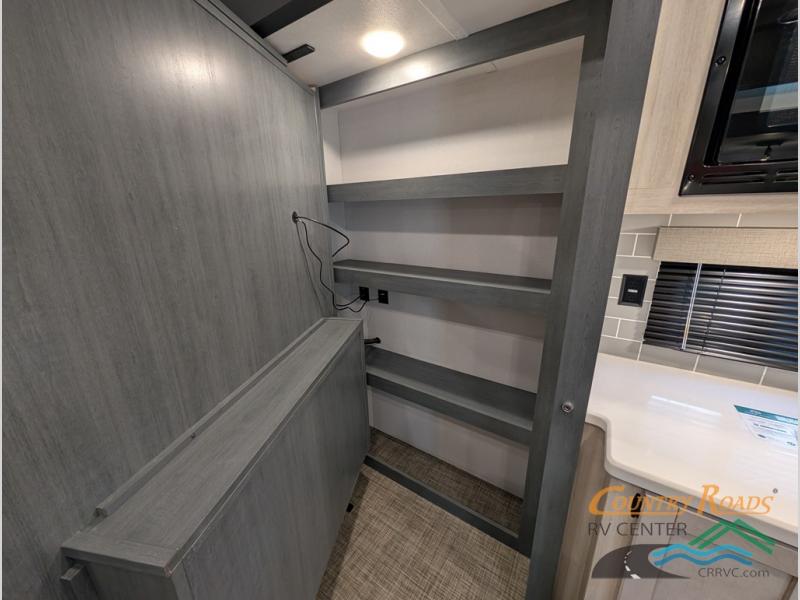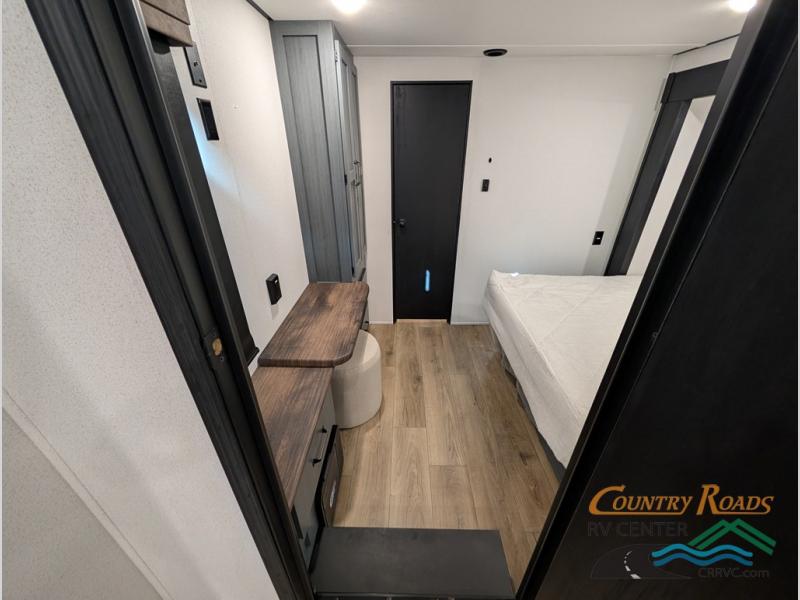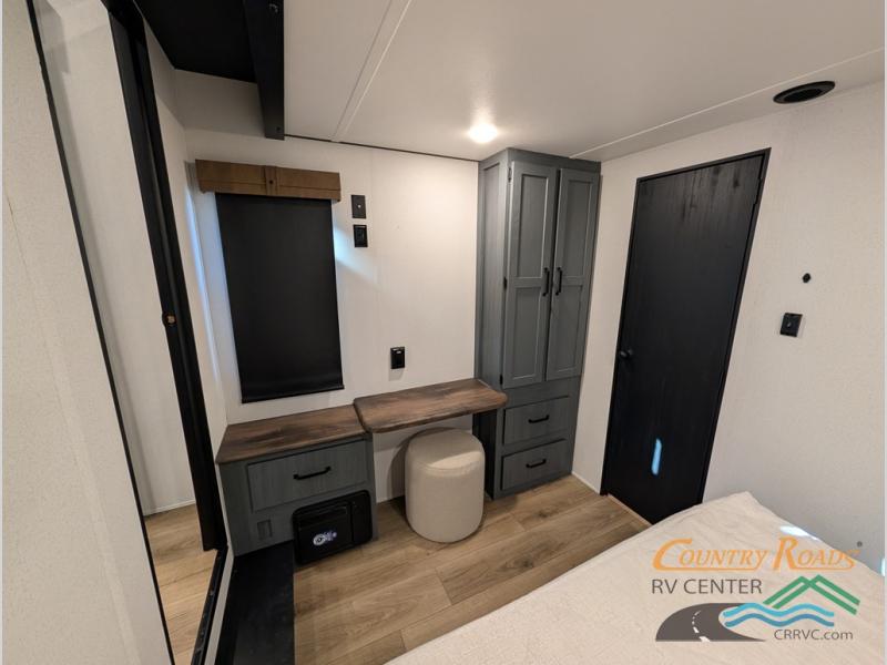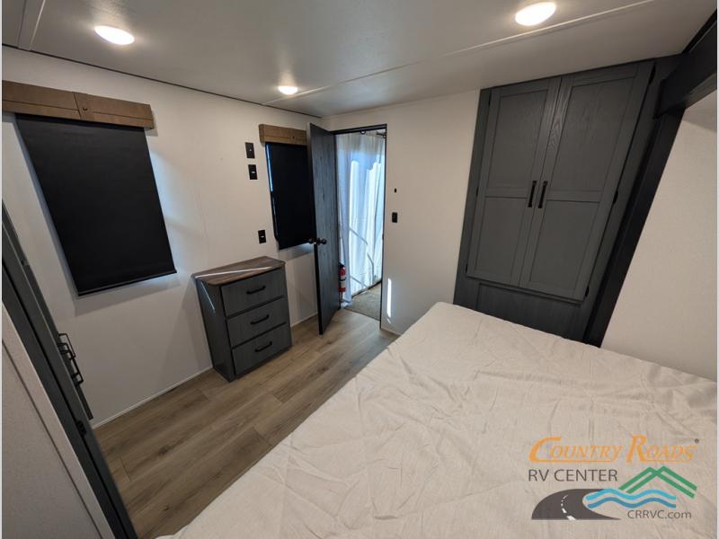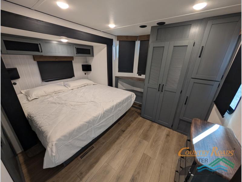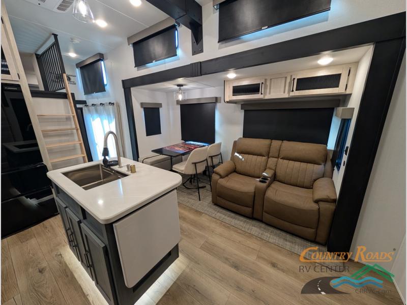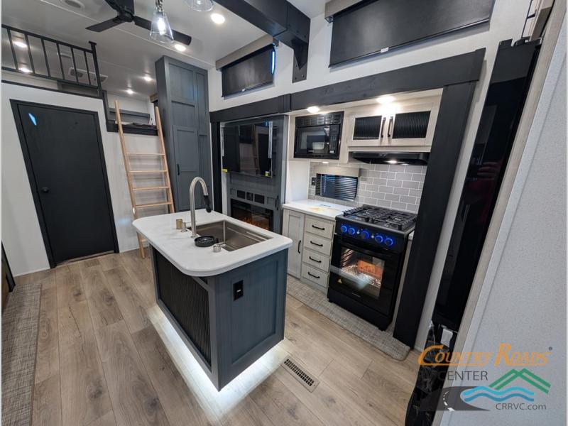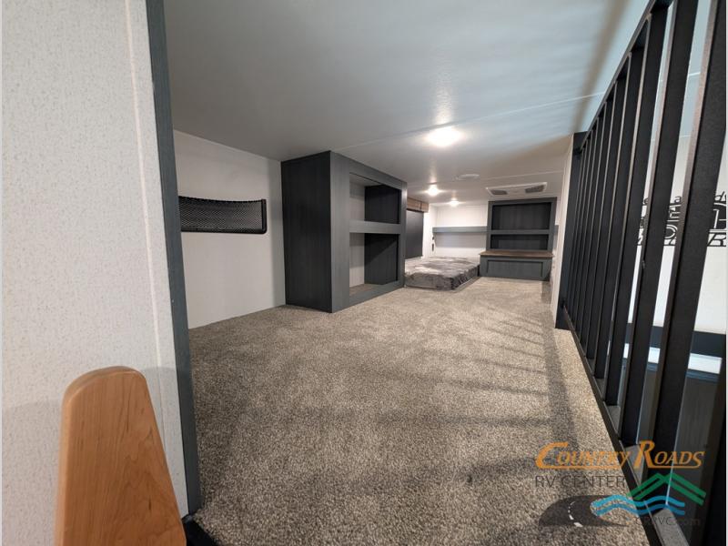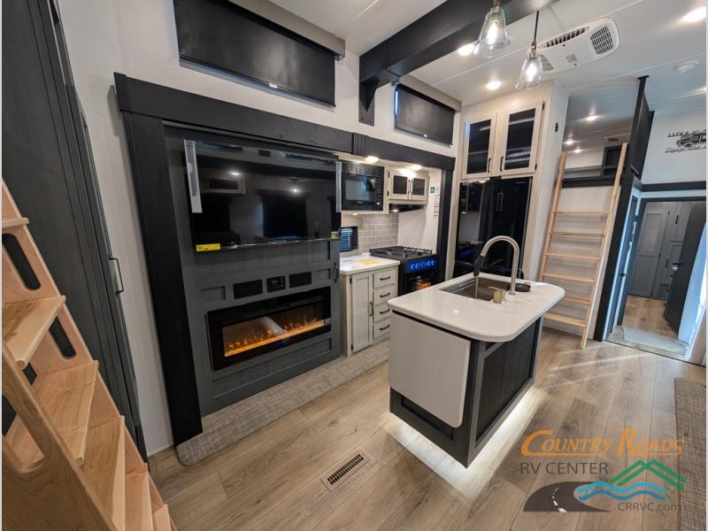 You won't believe the amount of comfort found in this destination trailer! There are two separate loft areas; one up front with a ladder, two bunk mats, storage space, and an optional fireplace, and one in the back with a ladder, two bunk mats, storage space, and a nightstand! On the main level, you'll find your own space in the front private bedroom, complete with a king bed slide, a countertop, dresser, and even washer and dryer prep. And a full bath is right next to the bedroom for easy nighttime use. Head to the full kitchen where you'll find all the appliances to cook meals, a kitchen island with an extension for more prep space, plus two pantries, one being hidden behind the TV! The comfort continues on in the rear master bedroom, complete with a queen bed slide, a desk with a chair, and a wardrobe for clothes. And the second full bath is found in the very back for added convenience!