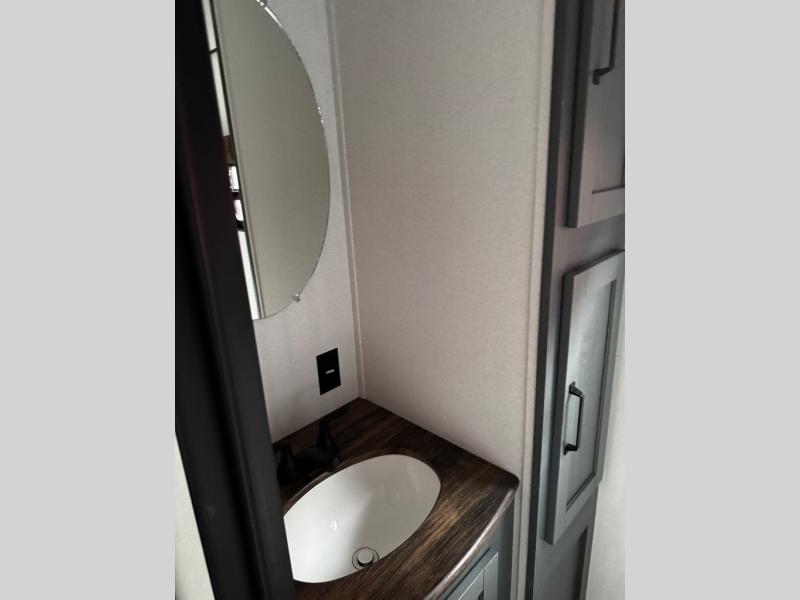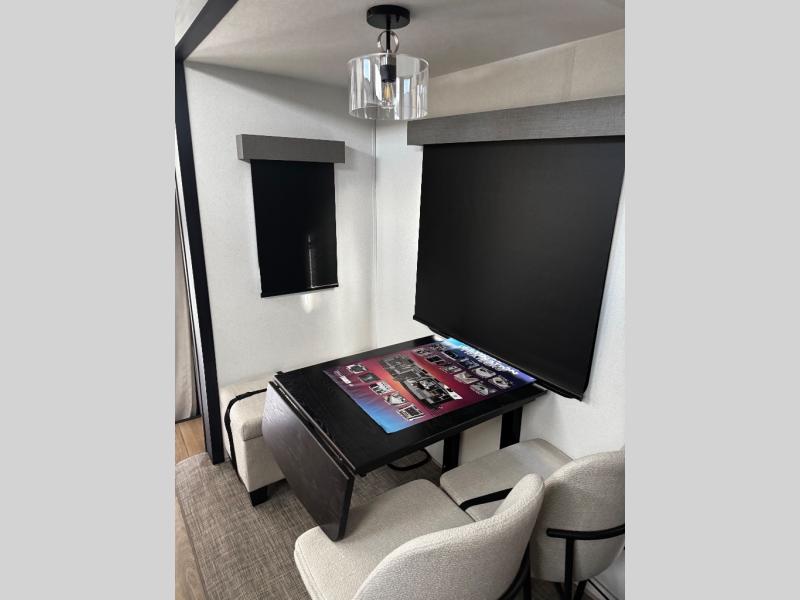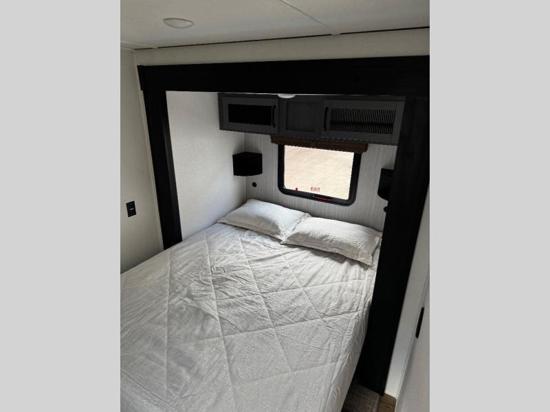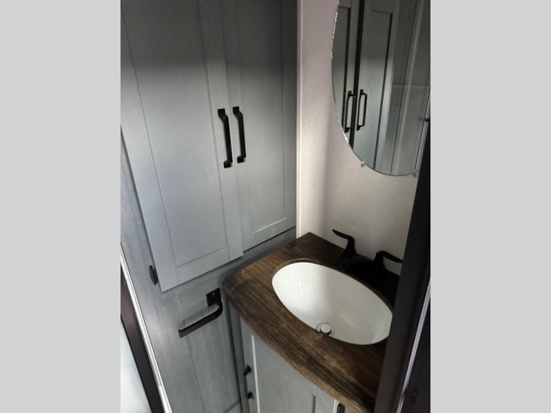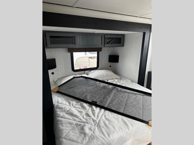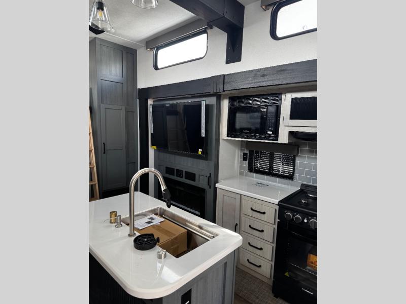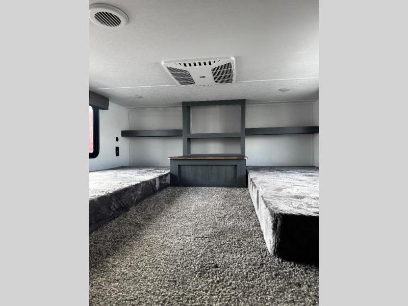 You won't believe the amount of comfort found in this destination trailer! There are two separate loft areas; one up front with a ladder, two bunk mats, storage space, and an optional fireplace, and one in the back with a ladder, two bunk mats, storage space, and a nightstand! On the main level, you'll find your own space in the front private bedroom, complete with a king bed slide, a countertop, dresser, and even washer and dryer prep. And a full bath is right next to the bedroom for easy nighttime use. Head to the full kitchen where you'll find all the appliances to cook meals, a kitchen island with an extension for more prep space, plus two pantries, one being hidden behind the TV! The comfort continues on in the rear master bedroom, complete with a queen bed slide, a desk with a chair, and a wardrobe for clothes. And the second full bath is found in the very back for added convenience!