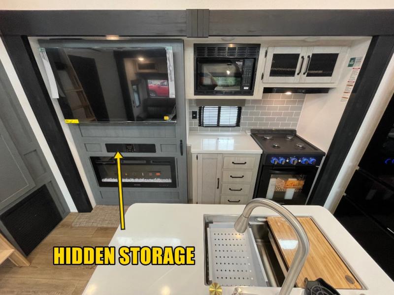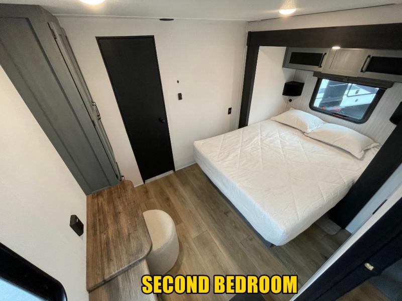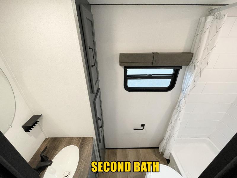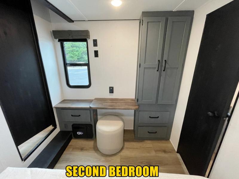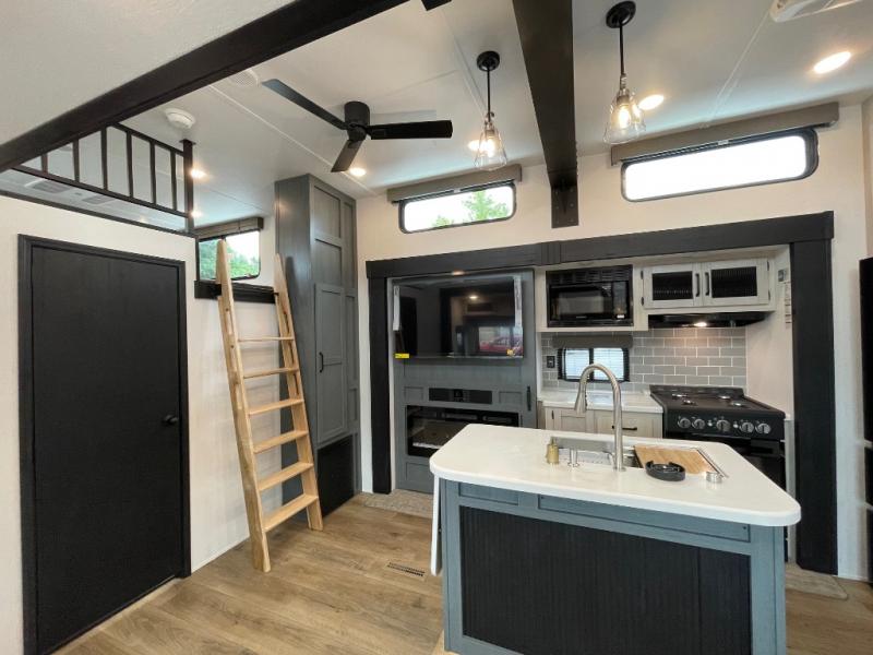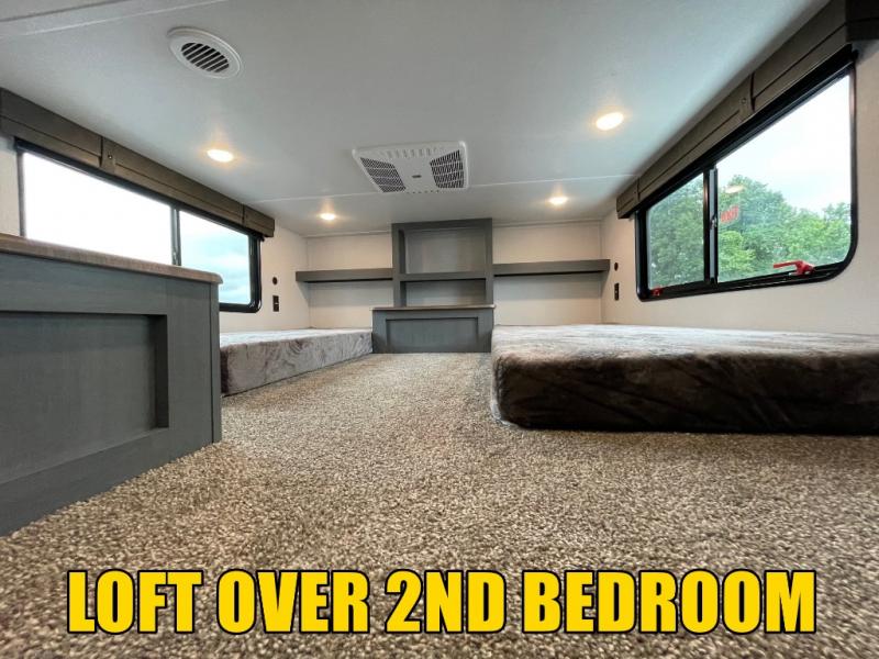 You won't believe the amount of comfort found in this destination trailer! There are two separate loft areas; one up front with a ladder, two bunk mats, storage space, and an optional fireplace, and one in the back with a ladder, two bunk mats, storage space, and a nightstand! On the main level, you'll find your own space in the front private bedroom, complete with a king bed slide, a countertop, dresser, and even washer and dryer prep. And a full bath is right next to the bedroom for easy nighttime use. Head to the full kitchen where you'll find all the appliances to cook meals, a kitchen island with an extension for more prep space, plus two pantries, one being hidden behind the TV! The comfort continues on in the rear master bedroom, complete with a queen bed slide, a desk with a chair, and a wardrobe for clothes. And the second full bath is found in the very back for added convenience!